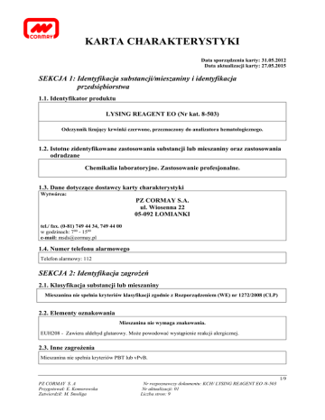 KARTA CHARAKTERYSTYKI Data sporządzenia karty: 31.05.2012 Data aktualizacji karty: 27.05.2015 SEKCJA 1: Identyfikacja substancji/mieszaniny i identyfikacja przedsiębiorstwa 1.1. Identyfikator produktu LYSING REAGENT EO (Nr kat. 8-503) Odczynnik lizujący krwinki czerwone, przeznaczony do analizatora hematologicznego. 1.2. Istotne zidentyfikowane zastosowania substancji lub mieszaniny oraz zastosowania odradzane Chemikalia laboratoryjne. Zastosowanie profesjonalne. 1.3. Dane dotyczące dostawcy karty charakterystyki Wytwórca: PZ CORMAY S.A. ul. Wiosenna 22 05-092 ŁOMIANKI tel./ fax. (0-81) 749 44 34, 749 44 00 w godzinach: 700 - 1500 e-mail: [email protected] 1.4. Numer telefonu alarmowego Telefon alarmowy: 112 SEKCJA 2: Identyfikacja zagrożeń 2.1. Klasyfikacja substancji lub mieszaniny Mieszanina nie spełnia kryteriów klasyfikacji zgodnie z Rozporządzeniem (WE) nr 1272/2008 (CLP) 2.2. Elementy oznakowania Mieszanina nie wymaga znakowania. EUH208 - Zawiera aldehyd glutarowy. Może powodować wystąpienie reakcji alergicznej. 2.3. Inne zagrożenia Mieszanina nie spełnia kryteriów PBT lub vPvB. 1/9 PZ CORMAY S. A Przygotował: E. Komorowska Zatwierdził: M. Smoliga Nr rozpoznawczy dokumentu: KCH/ LYSING REAGENT EO /8-503 Nr aktualizacji: 01 Liczba stron: 9 SEKCJA 3: Skład/informacja o składnikach 3.1. Substancje Nie dotyczy. 3.2. Mieszaniny Aldehyd glutarowy (glutaral) Numer CAS: 111-30-8 Numer WE: 203-856-5 Numer Indeksowy: 605-022-00-X Numer rejestracji: niedostępny Stężenie: < 0,25% Klasyfikacja zgodnie z Rozporządzeniem (WE) nr 1272/2008 [CLP]: Acute Tox. 3, H331 Acute Tox. 3, H301 Skin Corr. 1B, H314 Resp. Sens. 1, H334 Skin Sens. 1 H317 Aquatic Acute 1, H400 Aquatic Chronic 2, H411 2-propanol Numer CAS: 67-63-0 Numer WE: 200-661-7 Numer Indeksowy: 603-117-00-0 Numer rejestracji: niedostępny Stężenie: < 1.9% Klasyfikacja zgodnie z Rozporządzeniem (WE) nr 1272/2008 [CLP]: Flam. Liq. 2, H225 Eye Irrit.2, H319 STOT SE 3, H336 Pełny tekst zwrotów H podano w sekcji 16. SEKCJA 4: Środki pierwszej pomocy 4.1. Opis środków pierwszej pomocy Po narażeniu drogą oddechową: Świeże powietrze. Skonsultować się z lekarzem. Po zanieczyszczeniu skóry: Zmyć dużą ilością wody. Zdjąć skażoną odzież. Po zanieczyszczeniu oczu: Płukać oczy z otwartą powieką przez co najmniej 15 minut pod bieżącą wodą. Po spożyciu: Podać poszkodowanemu do picia dużą ilość wody. Jeżeli czuje się niezdrowo, skonsultować się z lekarzem. 4.2. Najważniejsze ostre i opóźnione objawy oraz skutki narażenia Brak dostępnych danych. 4.3. Wskazania dotyczące wszelkiej natychmiastowej pomocy lekarskiej i szczególnego postępowania z poszkodowanym Brak dostępnych danych. 2/9 PZ CORMAY S. A Przygotował: E. Komorowska Zatwierdził: M. Smoliga Nr rozpoznawczy dokumentu: KCH/ LYSING REAGENT EO /8-503 Nr aktualizacji: 01 Liczba stron: 9 SEKCJA 5: Postępowanie w przypadku pożaru 5.1. Środki gaśnicze Mieszanina niepalna. W przypadku zaistnienia pożaru stosować środki odpowiednie dla materiałów znajdujących się w bezpośrednim sąsiedztwie. Woda, CO2, proszek. Większy pożar zwalczać strumieniem wody lub pianą odporną na działanie alkoholu Brak danych o środkach nie zalecanych przy gaszeniu pożaru. 5.2. Szczególne zagrożenia związane z substancją lub mieszaniną Brak danych o szkodliwych substancjach uwalnianych w wyniku termicznego rozkładu mieszaniny. 5.3. Informacje dla straży pożarnej Ratownicy muszą być wyposażeni w odzież ochronną i sprzęt izolujący drogi oddechowe niezależny od otaczającego powietrza (w przypadku większego pożaru). SEKCJA 6: Postępowanie w przypadku niezamierzonego uwolnienia do środowiska 6.1. Indywidualne środki ostrożności, wyposażenie ochronne i procedury w sytuacjach awaryjnych 6.1.1. Dla osób nienależących do personelu udzielającego pomocy Unikać zanieczyszczenia mieszaniną. Zawiadomić otoczenie o awarii. Nie wdychać par / aerozoli. Zapewnić dopływ świeżego powietrza do zamkniętych pomieszczeń. Unikać kontaktu ze skórą i oczami. Zanieczyszczoną odzież zdjąć i wyprać przed ponownym użyciem. 6.1.2. Dla osób udzielających pomocy Nakładać odzież ochronną ogólnego stosowania i rękawice drelichowe lub gumowe. 6.2. Środki ostrożności w zakresie ochrony środowiska Rozcieńczyć dużą ilością wody. Unikać przedostawania się produktu do kanalizacji, wód powierzchniowych i gruntowych, zbiorników i cieków wodnych. 6.3. Metody i materiały zapobiegające rozprzestrzenianiu się skażenia i służące do usuwania skażenia Małe ilości zebrać za pomocą środków wiążących ciecze (piasek, ziemia okrzemkowa, materiał wiążący kwasy, materiał wiążący uniwersalny, trociny) jeśli to będzie konieczne spłukać dużą ilością wody. Zebrany materiał przekazać do utylizacji. 6.4. Odniesienia do innych sekcji Stosować środki kontroli i ochrony indywidualnej opisane w sekcji 8 niniejszej karty. Z uwolnionym materiałem postępować zgodnie z zasadami opisanymi w sekcji 13 niniejszej karty – postępowanie z odpadami. 3/9 PZ CORMAY S. A Przygotował: E. Komorowska Zatwierdził: M. Smoliga Nr rozpoznawczy dokumentu: KCH/ LYSING REAGENT EO /8-503 Nr aktualizacji: 01 Liczba stron: 9 SEKCJA 7: Postępowanie z substancjami i mieszaninami oraz ich magazynowanie 7.1. Środki ostrożności dotyczące bezpiecznego postępowania Podczas pracy z mieszaniną należy stosować odpowiednie środki ochrony osobistej (patrz pkt.8) Unikać kontaktu mieszaniny ze skórą i oczami oraz wdychania mgieł. Zapewnić sprawną wentylację miejscową. Higiena przemysłowa: Nie wolno spożywać posiłków, pić oraz palić tytoniu podczas pracy z wyrobem z wyjątkiem miejsc do tego przeznaczonych, po pracy z mieszaniną z wyjątkiem przerw w pracy i miejsc do tego przeznaczonych należy dokładnie umyć ręce wodą i mydłem przed przerwami i po zakończeniu pracy. Stosować krem ochronny do sk