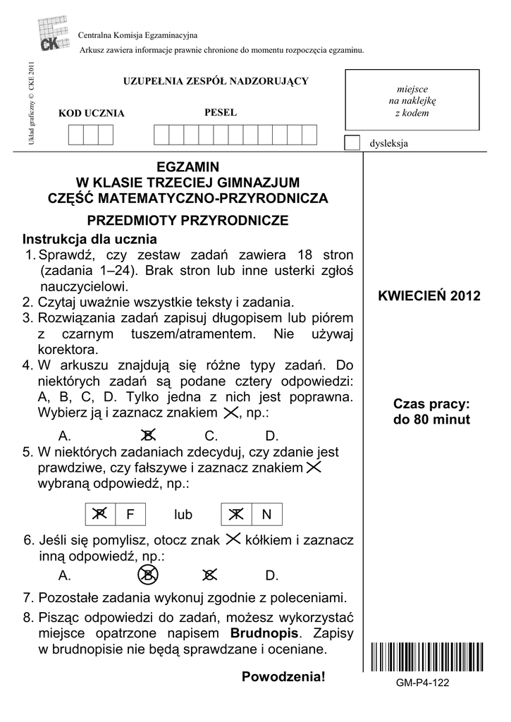 Centralna Komisja Egzaminacyjna Układ graficzny © CKE 2011 Arkusz zawiera informacje prawnie chronione do momentu rozpoczęcia egzaminu. UZUPEŁNIA ZESPÓŁ NADZORUJĄCY PESEL KOD UCZNIA miejsce na naklejkę z kodem dysleksja EGZAMIN W KLASIE TRZECIEJ GIMNAZJUM CZĘŚĆ MATEMATYCZNO-PRZYRODNICZA PRZEDMIOTY PRZYRODNICZE Instrukcja dla ucznia 1. Sprawdź, czy zestaw zadań zawiera 18 stron (zadania 1–24). Brak stron lub inne usterki zgłoś nauczycielowi. 2. Czytaj uważnie wszystkie teksty i zadania. 3. Rozwiązania zadań zapisuj długopisem lub piórem z czarnym tuszem/atramentem. Nie używaj korektora. 4. W arkuszu znajdują się różne typy zadań. Do niektórych zadań są podane cztery odpowiedzi: A, B, C, D. Tylko jedna z nich jest poprawna. Wybierz ją i zaznacz znakiem , np.: KWIECIEŃ 2012 Czas pracy: do 80 minut A. B. C. D. 5. W niektórych zadaniach zdecyduj, czy zdanie jest prawdziwe, czy fałszywe i zaznacz znakiem wybraną odpowiedź, np.: P F lub 6. Jeśli się pomylisz, otocz znak inną odpowiedź, np.: A. B. C. T N kółkiem i zaznacz D. 7. Pozostałe zadania wykonuj zgodnie z poleceniami. 8. Pisząc odpowiedzi do zadań, możesz wykorzystać miejsce opatrzone napisem Brudnopis. Zapisy w brudnopisie nie będą sprawdzane i oceniane. Powodzenia! GM-P4-122 Informacje do zadania 1. Jednokomórkowe glony żyjące w wodzie stawu rybnego wykorzystują promieniowanie słoneczne w procesie fotosyntezy. Od ilości glonów i od intensywności światła zależy ilość wydzielonego przez nie tlenu. Na wykresie przedstawiono badane (w tych samych dniach) wczesną wiosną dobowe zmiany ilości tlenu rozpuszczonego w powierzchniowej (0 0,5 m) warstwie wody w trzech sąsiednich stawach (o podobnej ilości glonów): A, B i C. Na podstawie: K. Bieniarz, A. Kownacki, P. Epler, Biologia stawów rybnych, Olsztyn 2003. Zadanie 1. Czy analiza tekstu i wykresu potwierdza prawdziwość poniższych stwierdzeń? Zaznacz T (tak), jeśli stwierdzenie jest uzasadnione, lub N (nie) – jeśli jest nieuzasadnione. Największe wytwarzanie dobowe tlenu jest w stawie C. T N Najwięcej rozpuszczonego tlenu zawiera woda stawów T pod koniec dnia. N Strona 2 z 18 Zadanie 2. Wybierz spośród podanych zestaw, w którym poprawnie przyporządkowano choroby do odpowiednich kategorii. A. B. C. D. Nowotworowe Genetyczne malaria hemofilia rak skóry mukowiscydoza AIDS rak skóry rak płuc opryszczka Informacje do zadań 3.–5. W futrze małej roślinożernej myszy, żyjącej w lasach Kostaryki, przebywa stale kilkanaście chrząszczy. Owady wczepiają się swymi silnymi żuwaczkami w jej uszy i kark. Chrząszcze te tylko bardzo rzadko można spotkać gdzie indziej niż w futrze myszy. Gryzoń podróżujący stale z gromadą pasażerów nie wykazuje bynajmniej oznak osłabienia ani niedokrwistości. Przeciwnie, tryska zdrowiem. Chrząszcze zaczynają żerować dopiero w ciągu dnia, gdy ich gospodarz przebywa w norze. Opuszczają wtedy jego futro i polują na krwiopijne pchły, od których aż roi się mysie gniazdo. Na podstawie: D. Attenborough, Na ścieżkach życia, Warszawa 1993. Zadanie 3. Poniższy schemat odpowiada opisanemu w tekście. I II III łańcuchowi pokarmowemu IV Na schemacie łańcucha pokarmowego mysz i chrząszcz zostały oznaczone odpowiednio numerami A. II i IV B. I i II C. III i IV D. III i II Strona 3 z 18 Zadanie 4. Wybierz T (tak), jeśli informacja jest prawdziwa, lub N (nie) – jeśli jest nieprawdziwa. Pchła, w zależnościach opisanych w tekście, jest pasożytem. ofiarą. T T N N Zadanie 5. Opisaną zależność między myszą a chrząszczami można nazwać A. symbiozą. B. pasożytnictwem. C. konkurencją. D. drapieżnictwem. Zadanie 6. Barwa oczu u ludzi dziedziczy się jednogenowo. Barwa oczu niebieska jest cechą recesywną (a) w stosunku do barwy brązowej (A). Matka ma oczy brązowe i jest homozygotą dominującą, a ojciec ma oczy niebieskie. Jaki kolor oczu będą miały ich dzieci? A. Wszystkie dzieci tych rodziców będą miały oczy niebieskie. B. Wszystkie dzieci tych rodziców będą miały oczy brązowe. C. 50% dzieci będzie miało oczy niebieskie i 50% dzieci będzie miało oczy brązowe. D. 75% dzieci będzie miało oczy brązowe, a 25% dzieci będzie miało oczy niebieskie. Strona 4 z 18 Zadanie 7. Na rysunku przedstawiono fragment układu okresowego pierwiastków. liczba atomowa 11Na Sód 23 1 1H 1 Wodór 2 1 3Li 4Be 2 Lit Beryl 7 9 11Na 12Mg 3 Sód Magnez 23 24 symbol pierwiastka nazwa pierwiastka masa atomowa (u) 18 2He Hel 14 15 16 17 4 6C 7N 8O 9F 10Ne Węgiel Azot Tlen Fluor Neon 12 14 16 19 20 14Si 15P 16S 17Cl 18Ar Krzem Fosfor Siarka Chlor Argon 28 31 32 35,5 40 W poniższych zdaniach podano informacje o pierwiastkach i ich tlenkach. Które to tlenki? Wybierz je spośród podanych A E. A. NO B. NO2 C. MgO D. SO2 E. SO3 W tym tlenku pierwiastek połączony z tlenem ma wartościowość równą II. 7.1. A B C D E W skład jądra atomu tego pierwiastka wchodzi 7 protonów. Pierwiastki tworzące ten związek leżą 7.2. w tej samej grupie układu okresowego. A B C D E Masa cząsteczkowa tlenku tego pierwiastka jest mniejsza od 70 u. Strona 5 z 18 Informacje do zadań 8. 9. Jacek zaplanował eksperyment z użyciem jednakowych gwoździ stalowych. Jego przebieg zilustrował rysunkiem. Po kilku dniach obserwacji Jacek zapisał następujące wyniki. Probówka 1. 2. 3. 4. 5. Wynik brak rdzy rdza brak rdzy brak rdzy bardzo dużo rdzy Zadanie 8. Zaznacz T (tak), jeśli uzasadnienie jest trafne, lub N (nie) – jeśli jest nietrafne w odniesieniu do wykonanego eksperymentu. Jacek wlał do probówki 4. wodę przegotowaną, ponieważ gotowanie niszczy bakterie i inne drobnoustroje. T N gotowanie usuwa powietrze rozpuszczone w wodzie. T N Strona 6 z 18 Zadanie 9. Które zdanie nie jest wnioskiem z eksperymentu Jacka? A. Stal rdzewieje szybciej, jeśli w wodzie jest sól. B. Stal nierdzewna jest bardziej odporna na korozję niż stal zwykła. C. Woda i powietrze to z