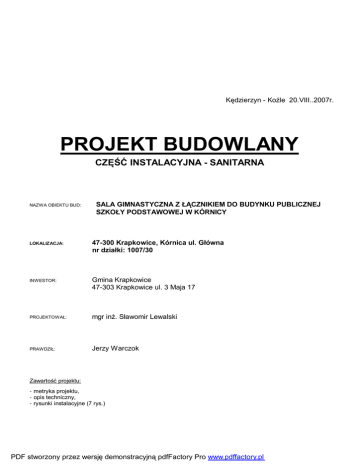 Kędzierzyn - Koźle 20.VIII..2007r. PROJEKT BUDOWLANY CZĘŚĆ INSTALACYJNA - SANITARNA NAZWA OBIEKTU BUD: SALA GIMNASTYCZNA Z ŁĄCZNIKIEM DO BUDYNKU PUBLICZNEJ SZKOŁY PODSTAWOWEJ W KÓRNICY LOKALIZACJA: 47-300 Krapkowice, Kórnica ul. Główna nr działki: 1007/30 INWESTOR: Gmina Krapkowice 47-303 Krapkowice ul. 3 Maja 17 PROJEKTOWAŁ: mgr inż. Sławomir Lewalski PRAWDZIŁ: Jerzy Warczok Zawartość projektu: - metryka projektu, - opis techniczny, - rysunki instalacyjne (7 rys.) PDF stworzony przez wersję demonstracyjną pdfFactory Pro www.pdffactory.pl OPIS TECHNICZNY CZĘŚĆ INSTALACYJNA SPIS TREŚCI CZĘŚĆ OPISOWA 1. Przedmiot opracowania. 2. Podstawa opracowania. 3. Zakres opracowania. 4. Charakterystyka ogólna obiektu oraz projektowanych sieci i instalacji. 5. Opis sieci i instalacji wewnętrznych. 5.1 Sieci zewnętrzne wod-kan. 5.2 Instalacja wod-kan. 5.3 Instalacja CO 5.4 Instalacja zasilania aparatów grzewczo-wentylacyjnych 5.5 Wentylacja mechaniczna sali gimnastycznej i pomieszczeń socjalno-sanitarnych. 5.6 Wytyczne sterowania i parametry zasilania urządzeń z napędem elektrycznym. 6. Opis wykonania sieci i instalacji wewnętrznych. 6.1 Sieci zewnętrzne wod-kan. 6.2 Instalacja wod-kan. 6.3 Instalacja CO i zasilania aparatów grzewczo-wentylacyjnych 6.4 Wentylacja mechaniczna sali gimnastycznej i pomieszczeń socjalno-sanitarnych. 7. Zestawienie materiałów. SPIS RYSUNKÓW 1i. Instalacja wod-kan. Rzut przyziemia. Poziom +1,00 2.i Instalacja CO. Rzut przyziemia. Poziom +1,00 3i. Rozwinięcie instalacji CO. 4i. Instalacja zasilania aparatów grzewczo-wentylacyjnych. Rzut przyziemia. Poziom +1,00 5i. Rozwinięcie instalacji zasilania aparatów grzewczo-wentylacyjnych. 6i. Instalacja wentylacji. Rzut przyziemia. Poziom +1,00 7i. Instalacja wentylacji. Przekrój A-A PDF stworzony przez wersję demonstracyjną pdfFactory Pro www.pdffactory.pl 1. Przedmiot opracowania. Przedmiotem opracowania jest projekt budowlany przyłącza kanalizacyjnego i instalacji wewnętrznych wod-kan, CO, zasilania cieplnego nagrzewnic aparatów grzewczo-wentylacyjnych oraz wentylacji mechanicznej dla sali gimnastycznej i pomieszczeń socjalno-sanitarnych dla budowanego obiektu: ‘’ Sala gimnastyczna z łącznikiem do budynku publicznej szkoły podstawowej 47-300 Krapkowice, Kórnica ul. Główna ‘’ 2. Podstawa opracowania Podstawę opracowania stanowią: • projekt architektoniczny rozbudowy obiektu • mapa sytuacyjno-wysokościowa z uzbrojeniem terenu • wizja lokalna 3. Zakres opracowania W zakres opracowania wchodzą: • przyłącze kanalizacyjne obiektu • instalacja wewnętrzna wod-kan obiektu [woda zimna, CWU, kanalizacja sanitarna] • instalacja CO obiektu • instalacja zasilania cieplnego aparatów grzewczo-wentylacyjnych sali gimnastycznej • instalacja wentylacji mechanicznej dla sali gimnastycznej i pomieszczeń socjalno-sanitarnych nowego zaplecza sali. Ścieki deszczowe z obiektu odprowadzane będą powierzchniowo. Szczegóły ich odprowadzania ujęto w części budowlanej projektu. PDF stworzony przez wersję demonstracyjną pdfFactory Pro www.pdffactory.pl 4. Charakterystyka ogólna obiektu oraz projektowanych sieci i instalacji. Projektowany obiekt obejmuje dobudowę sali gimnastycznej z zapleczem do istn budynku szkoły. Dla dostawy mediów [woda zimna, ciepło] oraz odbioru ścieków sanitarnych z nowego obiektu wykorzystana będzie istniejąca infrastruktura szkoły. • Ścieki sanitarne odprowadzane będą do istn. kanalizacji sanitarnej Ø200 biegnącej przy zachodniej ścianie proj. łącznika łączącego salę gimnastyczną z budynkiem szkoły. • Woda zimna doprowadzona będzie odrębnym przewodem z kotłowni w budynku szkoły gdzie doprowadzone jest przyłącze wody z wodociągu. Ze względu na zwiększenie zapotrzebowania na wodę zaprojektowano nowy odcinek instalacji wody zimnej łączący wlot przyłącza wodociągowego z istniejącą i projektowaną instalacją wody zimnej w kotłowni. Na odcinku tym przewidziano nowy wodomierz oraz zawór antyskażeniowy. • Ciepło dla potrzeb CO oraz nagrzewnic aparatów grzewczo-wentylacyjnych dla sali gimnastycznej doprowadzone będzie odrębnymi nitkami z kotłowni w budynku szkoły. Istniejąca kotłownia jest kotłownią węglową pracującą w układzie otwartym. Dla potrzeb sali gimnastycznej wykorzystana będzie rezerwa cieplna [zachowana jeszcze z okresu budowy szkoły] w istn kotłowni wynosząca ~100 kW [praktycznie jeden z dwu kotłów USP]. Dla potrzeb CO wymagane jest 42,6 kW a dla zasilania aparatów grzewczo-wentylacyjnych 60 kW. Zapotrzebowanie ciepła dla aparatów może być ograniczone w okresie wielkich mrozów poprzez zmniejszenie wymiany powietrza w sali gimnastycznej. Obydwa nowe obiegi wpięte zostaną do istn instalacji kotłowni w następujący sposób: Ø Przewody zasilania obiegów z pompami obiegowymi zostaną włączone do istn. rozdzielacza zasilania kotłów. Ø Przewody powrotu z obiegów zostaną włączone do istn. rozdzielacza powrotu kotłów. 5. Opis sieci i instalacji wewnętrznych. 5.1 Sieci zewnętrzne wod-kan. Przykanalik kanalizacji sanitarnej. • Przykanalik kanalizacji sanitarnej Ø 160 PVC podłączony będzie do istn. kanalizacji sanitarnej Ø 200 biegnącej przy zachodniej ścianie proj. łącznika łączącego salę gimnastyczną z budynkiem szkoły w studzience oznaczonej jako S1 ist. PDF stworzony przez wersję demonstracyjną pdfFactory Pro www.pdffactory.pl 5.2 Instalacja wod-kan. Projektowana instalacja wod-kan i CWU obejmuje swoim zasięgiem pomieszczenia socjalnosanitarne nowego zaplecza sali gimnastycznej. Woda zimna Woda zimna doprowadzona będzie odrębnym przewodem biegnącym częściowo w istn. kanale instalacyjnym w budynku szkoły. Przewód ten włączony będzie do nowoprojektowanego odcinka instalacji wodnej szkoły z nowym wodomierzem i zaworem antyskażeniowym podłączonego do istn. wlotu przyłącza wodnego. Schemat nowej instalacji wodnej