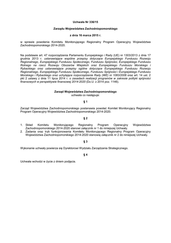 Uchwała Nr 336/15 Zarządu Województwa Zachodniopomorskiego z dnia 16 marca 2015 r. w sprawie powołania Komitetu Monitorującego Regionalny Program Operacyjny Województwa Zachodniopomorskiego 2014-2020. Na podstawie art. 47 rozporządzenia Parlamentu Europejskiego i Rady (UE) nr 1303/2013 z dnia 17 grudnia 2013 r. ustanawiające wspólne przepisy dotyczące Europejskiego Funduszu Rozwoju Regionalnego, Europejskiego Funduszu Społecznego, Funduszu Spójności, Europejskiego Funduszu Rolnego na rzecz Rozwoju Obszarów Wiejskich oraz Europejskiego Funduszu Morskiego i Rybackiego oraz ustanawiające przepisy ogólne dotyczące Europejskiego Funduszu Rozwoju Regionalnego, Europejskiego Funduszu Społecznego, Funduszu Spójności i Europejskiego Funduszu Morskiego i Rybackiego oraz uchylające rozporządzenie Rady (WE) nr 1083/2006 oraz art. 14 ust. 2 pkt 2 ustawy z dnia 11 lipca 2014 r. o zasadach realizacji programów w zakresie polityki spójności finansowych w perspektywie finansowej 2014-2020 (Dz.U. z 2014 poz. 1146). Zarząd Województwa Zachodniopomorskiego uchwala co następuje: §1 Zarząd Województwa Zachodniopomorskiego postanawia powołać Komitet Monitorujący Regionalny Program Operacyjny Województwa Zachodniopomorskiego 2014-2020. §2 1. Skład Komitetu Monitorującego Regionalny Program Operacyjny Województwa Zachodniopomorskiego 2014-2020 stanowi załącznik nr 1 do niniejszej Uchwały. 2. Zadania oraz tryb funkcjonowania Komitetu Monitorującego Regionalny Program Operacyjny Województwa Zachodniopomorskiego 2014-2020 stanowią załącznik nr 2 do niniejszej Uchwały. §3 Wykonanie uchwały powierza się Dyrektorowi Wydziału Zarządzania Strategicznego. §4 Uchwała wchodzi w życie z dniem podjęcia. Załącznik nr 1 do Uchwały nr 336/15 Zarządu Województwa Zachodniopomorskiego Skład Komitetu Monitorującego Regionalny Program Operacyjny Województwa Zachodniopomorskiego 2014-2020 Liczba członków: 39 l.p Przedstawiciel Instytucja Członek Zastępca Strona samorządowa 1. Olgierd Geblewicz - Marszałek Przewodniczący Komitetu, realizujący Województwa RPO WZ X Zachodniopomorskiego Tomasz Sobieraj – Wicemarszałek Zastępca przewodniczącego Województwa Komitetu, realizujący RPO WZ X Zachodniopomorskiego 2. Marcin Szmyt Wydział Zarządzania Strategicznego Marek Orszewski Urzędu Marszałkowskiego X WZ X realizujący RPO WZ 3. Piotr Maras Wydział Wdrażania RPO Urzędu Anna Łangowska Marszałkowskiego WZ realizujący RPO X X WZ 4. Jacek Chrzanowski Wojewódzki Fundusz Ochrony Sylwia Mickiewicz Środowiska w Szczecinie, realizujący X X RPO WZ 5. 6. Andrzej Przewoda Wojewódzki Urząd Pracy w Szczecinie, Katarzyna Brzychcy realizujący RPO WZ Roman Walaszkowski Związek ZIT SOM, realizujący RPO WZ X X X Magdalena Maik 7. X Maciej Berlicki – Burmistrz Gminy i Związek ZIT KKBOF, realizujący RPO Miasta Sianów WZ Andrzej Jakubowski – X Z-ca X Burmistrza Gościna 8. Stanisław Lipiński Unia Metropolii Polskich X Skarbnik Miasta Szczecin Michał Przepiera 9. Wojciech Długoborski X Unia Miasteczek Polskich X Z-ca Burmistrza Gminy Chojna Wacław Gołąb X Gmina Chojna 10. Krzysztof Majewski Związek Gmin Wiejskich RP X Wójt Gminy Rąbino Andrzej Leśniewicz X Wójt Gminy Biesiekierz 11. Janusz Gromek Związek Miast Polskich X Prezydent Miasta Kołobrzeg Janusz Żmurkiewicz X Prezydent Świnoujścia 12. Tomasz Tamborski Związek Powiatów Polskich X Starosta Kołobrzeski Andrzej Olichwiruk członek Zarządu X Powiatu Kołobrzeskiego 13. Teresa Kalina Związek Województw RP X Przewodnicząca Sejmiku WZ Witold Ruciński X Wiceprzewodniczący Sejmiku WZ 14. Piotr Jedliński Konwent Wójtów, Prezydent Miasta Koszalina Prezydentów WZ Burmistrzów i X Andrzej Kierzek X Z-ca Prezydenta Miasta Koszalina 15. Waldemar Miśko X Burmistrz Karlina Piotr Woś X Z-ca Burmistrza Karlina 16. Krzysztof Lis Konwent Starostów WZ X Starosta Szczecinecki Bogdan Wankiewicz X Starosta Wałecki 17. Arkadiusz Janowicz X Starosta Myśliborski Kazimierz Lipiński X Starosta Pyrzycki Strona rządowa 18. Agnieszka Dawydzik Ministerstwo właściwe do spraw Piotr Machański rozwoju regionalnego ds. koordynacji X X strategicznej 19. Aleksandra Dmitruk Ministerstwo właściwe do spraw Igor Kamieński rozwoju regionalnego ds. koordynacji X X wdrażania EFS 20. 21. 22. Krzysztof Rodzik Ministerstwo właściwe do spraw Agnieszka Piętal finansów Magdalena Szymańska Pełnomocnik Rządu do spraw Osób Krzysztof Kosiński Niepełnosprawnych Janusz Modrzejewski Pełnomocnik Nelli Kopańska Zachodniopomorskiego ds. Równego X X X X Wojewody X X Traktowania/ ds. Mniejszości Narodowych i Etnicznych 23. Marek Tałasiewicz Wojewoda Zachodniopomorski X Michał Włochal X Strona partnerów spoza administracji 24. 25. 26. Artur Gałęski Niezależny Samorząd Związku Mieczysław Jurek Zawodowego „Solidarność” Paweł Juras Ogólnopolskie Albin Majkowski Związków Zawodowych Roman Michalski Forum Związków Zawodowych Porozumienie X X X X X Paulina Zakrzewska X 27. Marek Kowalewski Pracodawcy RP X 28. Anna Kornacka Konfederacja Lewiatan X Roman Siedlikowski 29. Władysław Jefremienko X Związek Rzemiosła Polskiego X Rafał Dąbrowski X 30. Robert Woźniak Business Centre Club X 31. Renata Gryczka Północna Izba Gospodarcza X Dariusz Więcaszek 32. Julian Sierpiński X Zachodniopomorska Izba Rolnicza X Andrzej Karbowy 33. 34. X Wojciech Ślączka Konferencja Rektorów Akademickich Katarzyna Gawdzińska Szkól Wyższych Waldemar Gos X X X Andrzej Łuc 35. X Tomasz Królikowski X Jan Walkowicz 36. Bogna Czałczyńska X Fundacja CZAS DIALOGU X Piotr Lachowicz 37. Arkadiusz Porada Joanna Błachowska-Kurbiel X Polska Fundacja Ekologiczna X X 38. 39. Antoni Sobolewski Zachodniopomorska Federacja Katarzyna Jurewicz Pozarządowa Konrad Frontczak Stowarzyszenie Klaster ITC Pomorze Katarzyna Witkowska Zachodnie X X X X Obserwatorzy 1. [Brak wskazania imiennego] Komisja Europejska 2. Beata Kowalcz