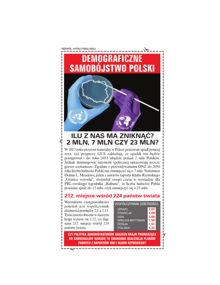 PRZEMYŚL, WYTNIJ I PODAJ DALEJ ! demografiCzne samobójstwo polski # Ilu z nas ma znIknąć? 2 mln, 7 mln czy 23 mln? W 2013 roku przyrost naturalny w Polsce ponownie spadł poniżej zera, zaś prognozy GUS zakładają, że spadek ten będzie postępował i do roku 2035 ubędzie ponad 2 mln Polaków. Jednak demiurgowie inżynierii społecznej opracowują jeszcze gorsze scenariusze. Zgodnie z przewidywaniami ONZ do 2050 roku liczba ludności Polski ma zmniejszyć się o 7 mln. Natomiast Dennis L. Meadows, jeden z autorów raportu Klubu Rzymskiego „Granice wzrostu”, stwierdził swego czasu w wywiadzie dla PRL-owskiego tygodnika „Kultura”, że liczba ludności Polski powinna spaść do 15 mln, czyli zmniejszyć się o 23 mln. 212. miejsce wśród 224 państw świata WSPÓŁCZYNNIK DZIETNOŚCI: IZRAEL FRANCJA USA WIELKA BRYTANIA ROSJA POLSKA 2,65 2,08 2,06 1,90 1,61 1,32 Czy polityka administratorów naszego kraju prowadząCa do samozagłady narodu to świadoma realizaCja planów znanyCh z raportów onz i klubu rzymskiego? # # Warunkiem zastępowalności pokoleń jest współczynnik dzietności pomiędzy 2,1 a 2,15. Tymczasem obecnie w naszym kraju wynosi on 1,32, co daje nam 212. miejsce wśród 224 państw świata.