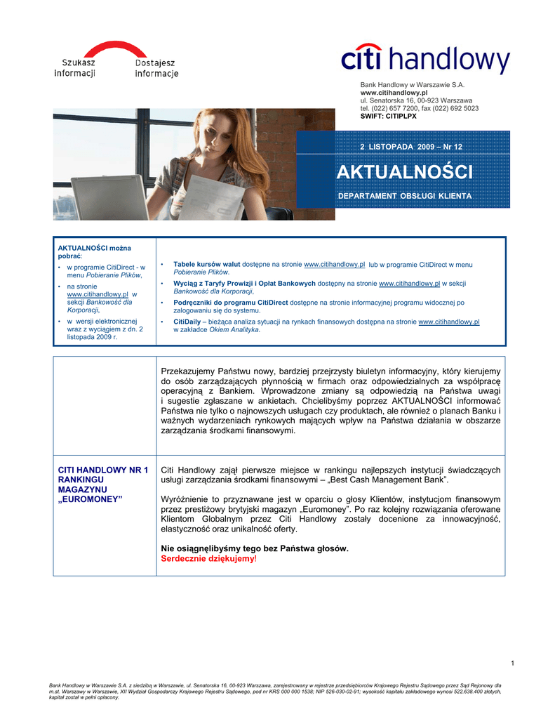 Bank Handlowy w Warszawie S.A. www.citihandlowy.pl ul. Senatorska 16, 00-923 Warszawa tel. (022) 657 7200, fax (022) 692 5023 SWIFT: CITIPLPX 2 LISTOPADA 2009 – Nr 12 AKTUALNOŚCI DEPARTAMENT OBSŁUGI KLIENTA AKTUALNOŚCI można pobrać: • w programie CitiDirect - w menu Pobieranie Plików, • Tabele kursów walut dostępne na stronie www.citihandlowy.pl lub w programie CitiDirect w menu Pobieranie Plików. • na stronie www.citihandlowy.pl w sekcji Bankowość dla Korporacji, • Wyciąg z Taryfy Prowizji i Opłat Bankowych dostępny na stronie www.citihandlowy.pl w sekcji Bankowość dla Korporacji, • Podręczniki do programu CitiDirect dostępne na stronie informacyjnej programu widocznej po zalogowaniu się do systemu. w wersji elektronicznej wraz z wyciągiem z dn. 2 listopada 2009 r. • CitiDaily – bieżąca analiza sytuacji na rynkach finansowych dostępna na stronie www.citihandlowy.pl w zakładce Okiem Analityka. • Przekazujemy Państwu nowy, bardziej przejrzysty biuletyn informacyjny, który kierujemy do osób zarządzających płynnością w firmach oraz odpowiedzialnych za współpracę operacyjną z Bankiem. Wprowadzone zmiany są odpowiedzią na Państwa uwagi i sugestie zgłaszane w ankietach. Chcielibyśmy poprzez AKTUALNOŚCI informować Państwa nie tylko o najnowszych usługach czy produktach, ale również o planach Banku i ważnych wydarzeniach rynkowych mających wpływ na Państwa działania w obszarze zarządzania środkami finansowymi. CITI HANDLOWY NR 1 RANKINGU MAGAZYNU „EUROMONEY” Citi Handlowy zajął pierwsze miejsce w rankingu najlepszych instytucji świadczących usługi zarządzania środkami finansowymi – „Best Cash Management Bank”. Wyróżnienie to przyznawane jest w oparciu o głosy Klientów, instytucjom finansowym przez prestiżowy brytyjski magazyn „Euromoney”. Po raz kolejny rozwiązania oferowane Klientom Globalnym przez Citi Handlowy zostały docenione za innowacyjność, elastyczność oraz unikalność oferty. Nie osiągnęlibyśmy tego bez Państwa głosów. Serdecznie dziękujemy! 1 Bank Handlowy w Warszawie S.A. z siedzibą w Warszawie, ul. Senatorska 16, 00-923 Warszawa, zarejestrowany w rejestrze przedsiębiorców Krajowego Rejestru Sądowego przez Sąd Rejonowy dla m.st. Warszawy w Warszawie, XII Wydział Gospodarczy Krajowego Rejestru Sądowego, pod nr KRS 000 000 1538; NIP 526-030-02-91; wysokość kapitału zakładowego wynosi 522.638.400 złotych, kapitał został w pełni opłacony. NOWA DOKUMENTACJA DOTYCZĄCA PRODUKTÓW OBSŁUGI HANDLU /PRZYPOMNIENIE/ Pragniemy przypomnieć, iż zgodnie z informacją podaną w Biuletynie Informacyjnym nr 11 z dnia 01 października 2009 od dnia 3 listopada 2009 roku obowiązuje nowa dokumentacja dotycząca produktów obsługi handlu tj. gwarancji bankowych, akredytyw zabezpieczających i dokumentowych oraz inkas dokumentowych/weksla. ELEKTRONICZNE BONY TOWAROWE Karta przedpłacona wykorzystywana jako karta podarunkowa stanowi idealny upominek z okazji zbliżających się Świąt Bożego Narodzenia. Dzięki prostej i wygodnej formie płatności, osoba obdarowana kartą może przeznaczyć znajdujące się na niej środki, na dowolny cel zgodnie ze swoimi preferencjami. Karta oferowana Klientom Banku może być wydana z góry określonym nominałem, jak również może być zasilona dowolną kwotą w dogodnym dla firmy terminie. Karty zostaną zasilone zgodnie z dyspozycją firmy, po przekazaniu odpowiedniej kwoty na wskazany przez Bank rachunek służący do rozliczenia kart. Z dniem 3 listopada 2009 r. Bank będzie honorował wyłącznie nowe formularze Wniosków/Zleceń. W sprawie nowej dokumentacji, prosimy o kontakt z Państwa Doradcą. Od 3 listopada 2009 nowa dokumentacja będzie również dostępna na stronie internetowej www.citihandlowy.pl. Dodatkowe korzyści płynące z finansowania elektronicznych bonów towarowych z funduszu świadczeń socjalnych to: 1) wartość bonów towarowych stanowi dla firmy koszt uzyskania przychodów, 2) wartość bonów towarowych nie powoduje zwiększenia wymiaru składki ZUS. W przypadku zainteresowania ofertą Elektronicznych Bonów Towarowych, prosimy o kontakt z Zespołem Obsługi Kart Business pod numerem telefonu + 48 22 692 24 39. Bank Handlowy w Warszawie S.A. z siedzibą w Warszawie, ul. Senatorska 16, 00-923 Warszawa, zarejestrowany w rejestrze przedsiębiorców Krajowego Rejestru Sądowego przez Sąd Rejonowy dla m.st. Warszawy w Warszawie, XII Wydział Gospodarczy Krajowego Rejestru Sądowego, pod nr KRS 000 000 1538; NIP 526-030-02-91; wysokość kapitału zakładowego wynosi 522.638.400 złotych, kapitał został w pełni opłacony. 2