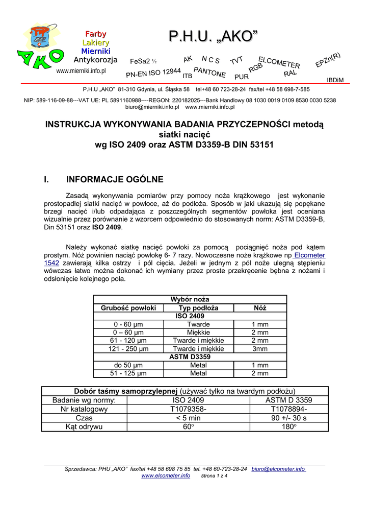 Farby Lakiery Mierniki Antykorozja www.mierniki.info.pl P.H.U. „AKO” FeSa2 ½ AK 944 PN-EN ISO 12 ITB P.H.U „AKO” 81-310 Gdynia, ul. Śląska 58 NCS PANT ONE TV T PUR ELCOM ETER B RG RAL Z EP ) n(R IBDiM tel+48 60 723-28-24 fax/tel +48 58 698-7-585 NIP: 589-116-09-88---VAT UE: PL 5891160988----REGON: 220182025---Bank Handlowy 08 1030 0019 0109 8530 0030 5238 [email protected] www.mierniki.info.pl INSTRUKCJA WYKONYWANIA BADANIA PRZYCZEPNOŚCI metodą siatki nacięć wg ISO 2409 oraz ASTM D3359-B DIN 53151 I. INFORMACJE OGÓLNE Zasadą wykonywania pomiarów przy pomocy noża krążkowego jest wykonanie prostopadłej siatki nacięć w powłoce, aż do podłoża. Sposób w jaki ukazują się popękane brzegi nacięć i/lub odpadająca z poszczególnych segmentów powłoka jest oceniana wizualnie przez porównanie z wzorcem odpowiednio do stosowanych norm: ASTM D3359-B, Din 53151 oraz ISO 2409. Należy wykonać siatkę nacięć powłoki za pomocą pociągnięć noża pod kątem prostym. Nóż powinien naciąć powłokę 6- 7 razy. Nowoczesne noże krążkowe np Elcometer 1542 zawierają kilka ostrzy i pól cięcia. Jeżeli w jednym z pól noże ulegną stępieniu wówczas łatwo można dokonać ich wymiany przez proste przekręcenie bębna z nożami i odsłonięcie kolejnego pola. Grubość powłoki 0 - 60 µm 0 – 60 µm 61 - 120 µm 121 - 250 µm do 50 µm 51 - 125 µm Wybór noża Typ podłoża ISO 2409 Twarde Miękkie Twarde i miękkie Twarde i miękkie ASTM D3359 Metal Metal Nóż 1 mm 2 mm 2 mm 3mm 1 mm 2 mm Dobór taśmy samoprzylepnej (używać tylko na twardym podłożu) Badanie wg normy: ISO 2409 ASTM D 3359 Nr katalogowy T1079358T1078894Czas < 5 min 90 +/- 30 s Kąt odrywu 60o 180o Sprzedawca: PHU „AKO” fax/tel +48 58 698 75 85 tel. +48 60-723-28-24 [email protected] www.elcometer.info strona 1 z 4 II. ZASADA POMIARU 1. Upewnij się, czy używany jest nóż o właściwych dla danej powłoki i podłoża odstępach między ostrzami. 2. Wykonaj serię nacięć równoległych na odcinku około 20 mm, a następnie drugą serię pod kątem prostym do pierwszej serii w celu uzyskania siatki nacięć. Nóż powinien być prowadzony jednym zdecydowanym ruchem jednostajnym o stałym nacisku tak dobranym aby przeciąć powłokę aż do podłoża. 3. Po wykonaniu siatki nacięć delikatnie oczyść powierzchnie powłoki miękką szczoteczką lub chusteczką aby usuń wszelkie luźne płatki powłoki. 4. Następnie przyklej i zgodnie z normą i usuń taśmę samoprzylepną. Porównaj wynik z tabelką załączoną do miernika. 60° EN ISO 2409 ASTM D 3359 180° Sprzedawca: PHU „AKO” fax/tel 058 698 75 85 tel. 060-723-28-24 [email protected] www.elcometer.info strona 2 z 4 III. OKREŚLENIE PRZYCZEPNOŚCI POWŁOKI METODĄ SIATKI NACIĘĆ. Opis Wygląd powierzchni Norma: BS/ISO/DIN Norma: ASTM 0 5B 1 4B 2 3B 3 4B 4 5B 5 0B Krawędzie nacięć są gładkie, żaden z kwadrat powłoki z siatki nacięć nie został oderwany. Oderwane jedynie niewielkie płatki powłoki na krawędziach siatki nacięć. Żaden kwadrat z prostokątnej siatki nacięć nie został oderwany. Całkowita powierzchnia uszkodzonej powłoki nie jest większa od 5% Powłoka odpada niewielkimi płatkami wzdłuż linii cięcia siatki oraz widoczne pęknięcia i oderwania małych kawałków powłoki pomiędzy liniami siatki. Łączna powierzchnia uszkodzeń większa od 5%, ale nie przekracza 15 %. Powłoka odpada płatkami wzdłuż nacięć częściowo lub w całości w postaci długich wstążek i/lub odrywa się płatkami w części lub całości z kwadratów siatki nacięć. Powierzchnia uszkodzeń większa niż 15 % a mniejsza niż 35%. Powłoka odpada płatkami wzdłuż nacięć w postaci długich wstążek i/lub odrywa się płatkami w części lub całości z kwadratów siatki nacięć. Powierzchnia uszkodzeń większa niż 35 % a mniejsza od 65 % Każdy stopień odrywania się powłoki, który nie może być zaklasyfikowany jako 4. Sprzedawca: PHU „AKO” fax/tel 058 698 75 85 tel. 060-723-28-24 [email protected] www.elcometer.info strona 3 z 4 Przykładowe noże do nacinania powłoki: Elcometer 1540 Nacinanie powłoki za pomocą TQC CC Elcometer 1542 KIT (szczotka lupa) TQC CC1000 VF Ostrze noża krążkowego TQC SP2000 1000TQC SP1660 Elcometer 1542 Zestaw noży krążkowych o rozstawie 1 2 i 3 mm Nóż BGV 1839C 1842C 1844C UWAGA: Szczegółowa instrukcja zawarta jest w tekście odpowiedniej normy wg której wykonywany jest pomiar. Sprzedawca: PHU „AKO” fax/tel 058 698 75 85 tel. 060-723-28-24 [email protected] www.elcometer.info strona 4 z 4
