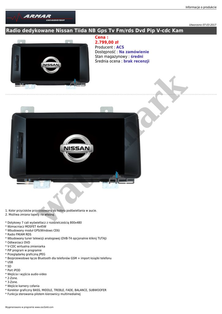 Informacje o produkcie Utworzono 07-03-2017 Radio dedykowane Nissan Tiida NB Gps Tv Fm/rds Dvd Pip V-cdc Kam Cena : 2.799,00 zł w at er m ar k Producent : ACS Dostępność : Na zamówienie Stan magazynowy : średni Średnia ocena : brak recenzji 1. Kolor przycisków przystosowany do koloru podświetlania w aucie. 2. Możliwa zmiana tapety na własną. * Dotykowy 7 cali wyświetlacz z rozdzielczością 800x480 * Wzmacniacz MOSFET 4x45W * Wbudowany moduł GPS(Windows CE6) * Radio FM/AM RDS * Wbudowany tuner telewizji analogowej (DVB-T4 opcjonalnie kliknij TUTAJ) * Odtwarzacz DVD * V-CDC wirtualna zmieniarka * PiP program w programie * Przeglądarkę graficzną JPEG * Bezprzewodowe łącze Bluetooth dla telefonów GSM + import książki telefonu * USB * SD * Port iPOD * Wejścia i wyjścia audio-video * 2-Zone. * 3-Zone. * Wejście kamery cofania * Korektor graficzny BASS, MIDDLE, TREBLE, FADE, BALANCE, SUBWOOFER * Funkcja sterowania pilotem kierownicy multimedialnej Wygenerowano w programie www.oscGold.com Urządzenie zostało wyposażone w : Dotykowy 7 cali wyświetlacz Active Matrix TFT o rozdzielczości 800x480, bardzo ciekawe rozwiązanie graficzne, charakteryzuje się bardzo dobra, jakością graficzna bardzo czuły i przyjemny w obsłudze, wzmacniacz MOSFET 4x45W, wbudowany moduł GPS(z Windows CE6), tuner FM/AM/RDS, tuner TV, odtwarzacz DVD, przeglądarkę graficzna JPEG, bezprzewodowe łącze Bluetooth dla telefonów GSM, port USD, slot SD, port iPOD wejścia i wyjścia audio-video (monitory w zagłówkach wejście AUX). Funkcja V-CDC pozwala na skopiowanie ulubionych płyty do pamięci urządzenia łączna pamięć to 2GB. PiP obraz w obrazie, w każdej z opcji możliwe jest podglądanie drugiej. Funkcja Dual-Zone w czasie działania nawigacji można słuchać radia lub muzyki z DVD, SD i USB, wejście kamery cofania, korektor graficzny BASS, MIDDLE, TREBLE, FADE, BALANCE, SUBWOOFER jak i również equalizer. JĘZYK URZĄDZENIA: angielski, włoski niemiecki. JĘZYK GPS: polski, angielski, niemiecki (komendy nawigacyjne w języku polskim). Matryca 8 cali TFT Active Matrix /16: 9 Zasilanie 12V DC (10, 8-14, 5V) max 15A Temperatura pracy urządzenia -20C ~ +70C. Moc wyjściowa 4*45W /4-8 Omów Encoder - Linear PCM, Dolby Digital/Dolby prof essional edit II/DTS er m ar k RADIO FM/AM FM/AM/RDS: bardzo czuły, cyfrowy tuner, jeszcze silniejszy sygnał, wyszukiwarka FM/AM, możliwość przechowywania danych, wyświetlanie częstotliwości, informacji RDS, możliwość zapisania 32 stacji. Naciśniecie przycisku PIP spowoduje otwarcie dodatkowego okna w funkcji radia, abyś mógł oglądać ulubiony program jednocześnie słuchając radia. DVD Wyposażony w czytnik płyt DVD+R, DVD+RW, DVD-R, DVD-RW CD, CD-R, CD-RW, CD-DA,MP3, WMA, SVCD, VCD, MPEG1, MPEG2, MPEG4, JPEG. W odtwarzaczu można odtwarzać płyty DVD z filmami o formacie DVD/MPEG-4 (DivX)/AVI/WMA/MP4 /VCD /CD /MP3 /JPEG. Odtwarzacz wyświetla ID-TAGI, czyli nazwy utworów MP3. Z myślą o użytkownikach producent zadbał o to, aby odtwarzacz posiada funkcje, dzięki której możemy chodzić po całej strukturze płyty. Cyfrowy equalizer barwy dźwięku, oraz wiele innych ustawień pozwala nam na optymalne ustawienie fonii w radiu. System video PAL/NTSC/AUTO. TV Radio zostało wyposażone w analogowy tuner telewizyjny. Po podłączeniu samochodowej anteny możemy oglądać kanały TV na wbudowanym w odtwarzacz monitorze. System: PAL D/K, PAL I, PAL BG, PAL-N, PAL-M, NTSC, SECAM. Dźwięk IF: PAL D/K, PAL I BLUETOOH - ZESTAW GŁOŚNO MÓWIĄCY Radio po sparowaniu z telefonem, który wyposażony jest w bluetooth, służy, jako zestaw głośnomówiący. Podczas gdy ktoś dzwoni do nas dzwonek telefonu słyszymy w głośnikach samochodu, jednym przyciskiem w panelu radia odbieramy rozmowę, my zaś naszego rozmówce słyszymy w głośnikach samochodowych. Po zakończeniu rozmowy bezpośrednio z panelu radia możemy wybrać numer telefonu, jaki chcemy wykonać. Urządzenie dodatkowo wyświetla, rozmowy wychodzące, przychodzące, połączenia nieodebrane i importuje książkę telefoniczna telefonu (NAZWA - NUMER). Wyposażony w funkcję multimedialna: słuchanie muzyki przez BT z telefonu, jeśli nasz telefon posiada odtwarzacz muzyczny możemy bezprzewodowo słuchać muzyki na urządzeniu, sterowanie cala muzyka odbywa się za pomocą dotykowego ekranu jak i naszego telefonu. at AUX Radio może pełnić funkcje monitora, możemy podłączyć dowolne urządzenie pod wejście AUX obraz będzie wyświetlany na monitorze dźwięk będziemy słyszeć w głośnikach. Funkcja dostępna po podaniu sygnału. USB SD Możliwość podłączania zewnętrznej pamięci SD, dodatkowo port USB może służyć, jako ładowarka telefonu, lub innych urządzeń. w Port SD obsługuje karty pamięci SD HCSD XCSD. V-CDC WIRTUALNA ZMIENIARKA Wirtualna zmieniarka V-CDC umożliwi nam skopiowanie ośmiu płyt CD do pamięci urządzenia. Pamięć magazynująca to 2GB. iPOD Po podłączaniu iPOD-a wszystkimi funkcjami sterujemy za pomocą dotykowego ekranu, sygnał audio przekierowany jest na głośniki radia. PIP (OBRAZ W OBRAZIE), DUAL-ZONE W każdej funkcji możemy włączyć drugie mniejsze okno, w którym możliwe będzie podglądanie innej funkcji. Okno to możemy przestawić, ustawić w miejscu, które nam odpowiada. Funkcja PIP umożliwi nam podgląd dwóch funkcji na raz, np. podczas nawigacji możemy oglądać film DVD lub odwrotnie. Funkcja DUAL-ZONE umożliwi nam jednoczesne nawigowanie jak i słuchanie muzyki z DVD, FM czy też TV. GPS Dzięki wbudowanemu modułowi GPS wyposażony w system operacyjny Windows CE. 6, Możemy zmieniać programy nawigacyjne (programy sprawdzone przez nas to: IGO, AutoMapa, TomTom, Road 66.) Program nawigacyjny wgrywamy na kartę SD w szybki sposób możemy przełączać pomiędzy programami map. Procesor AMR11 500MHz+250MHzDPS współpracuje z chipsetem Sirf Atlas IV i pamięcią DDR 128MB, oferuje on doskonałą czu