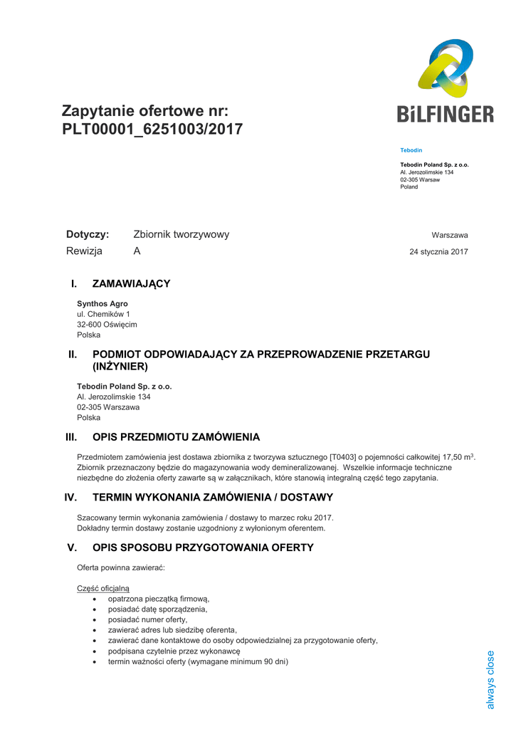 Zapytanie ofertowe nr: PLT00001_6251003/2017 Tebodin Tebodin Poland Sp. z o.o. Al. Jerozolimskie 134 02-305 Warsaw Poland Dotyczy: Zbiornik tworzywowy Rewizja A Warszawa 24 stycznia 2017 ZAMAWIAJĄCY I. Synthos Agro ul. Chemików 1 32-600 Oświęcim Polska II. PODMIOT ODPOWIADAJĄCY ZA PRZEPROWADZENIE PRZETARGU (INŻYNIER) Tebodin Poland Sp. z o.o. Al. Jerozolimskie 134 02-305 Warszawa Polska III. OPIS PRZEDMIOTU ZAMÓWIENIA Przedmiotem zamówienia jest dostawa zbiornika z tworzywa sztucznego [T0403] o pojemności całkowitej 17,50 m3. Zbiornik przeznaczony będzie do magazynowania wody demineralizowanej. Wszelkie informacje techniczne niezbędne do złożenia oferty zawarte są w załącznikach, które stanowią integralną część tego zapytania. IV. TERMIN WYKONANIA ZAMÓWIENIA / DOSTAWY Szacowany termin wykonania zamówienia / dostawy to marzec roku 2017. Dokładny termin dostawy zostanie uzgodniony z wyłonionym oferentem. V. OPIS SPOSOBU PRZYGOTOWANIA OFERTY Część oficjalną opatrzona pieczątką firmową, posiadać datę sporządzenia, posiadać numer oferty, zawierać adres lub siedzibę oferenta, zawierać dane kontaktowe do osoby odpowiedzialnej za przygotowanie oferty, podpisana czytelnie przez wykonawcę termin ważności oferty (wymagane minimum 90 dni) always close Oferta powinna zawierać: Tebodin Poland Sp z o.o. Zapytanie ofertowe nr: PLT00001_6251003/2017 Rewizja A January 24, 2017 Page 2 / 3 Część techniczną Wstępny rysunek techniczny urządzenia z rozmieszczonymi króćcami Materiał wykonania (dopasowany do magazynowanego medium) Wstępna waga pustego zbiornika Grubość ścianek płaszcza oraz dennic Zakres badań FAT Założenia dla posadowienia zbiornika Część handlową koszt urządzenia koszt dostawy (DDP Oświęcim) koszt montażu lub nadzoru nad montażem (jako opcja) cennik części zamiennych niezbędnych do prawidłowego funkcjonowania urządzenia w okresie 5 lat (jako opcja) koszt serwisów/przeglądów okresowych w okresie 5 lat od uruchomienia (jako opcja) koszty eksploatacyjne maszyny/urządzenia tj. zużycie mediów, materiałów eksploatacyjnych itp warunki i okres gwarancji referencje z ostatnich 5 lat VI. 1. 2. 3. 4. VII. MIEJSCE ORAZ TERMIN SKŁADANIA OFERT Oferta powinna być przesłana za pośrednictwem: poczty elektronicznej na adres: [email protected] oraz [email protected] do dnia 2017-02-10. Oferty złożone po terminie nie będą rozpatrywane Oferent może przed upływem terminu składania ofert zmienić lub wycofać swoją ofertę. W toku badania i oceny ofert Zamawiający lub Inżynier może żądać od oferentów wyjaśnień dotyczących treści złożonych ofert. OCENA OFERT Inżynier dokona oceny ważnych ofert na podstawie następujących kryteriów: CENA 80% JAKOŚĆ (na podstawie części technicznej oferty) i GWARANCJA (okres i zakres) 20% VIII. INFORMACJE DOTYCZĄCE WYBORU NAJKORZYSTNIEJSZEJ OFERTY Na podstawie oceny ofert Inżynier przedstawi swoją rekomendację Zamawiającemu. O wyborze najkorzystniejszej oferty Zamawiający zawiadomi oferentów poprzez pocztę elektroniczną za pośrednictwem Inżyniera. IX. DODATKOWE INFORMACJE Dodatkowych informacji udziela Pan Igor Piórkowski pod numerem telefonu +48 22 33 44 166 oraz adresem email: [email protected]. X. ZAŁĄCZNIKI Załącznik 1. Załącznik 2. Załącznik 3. Załącznik 4. 31 81 008 - Rev A - Zbiorniki tworzywowe (Specyfikacja techniczna) 26 51 401_Rysunek_założeniowy_aparatu_T0403 _Rev_A Formularz zadawania pytań Ogólne Warunki Zakupu Usług (OWZU) Tebodin Poland Sp z o.o. Zapytanie ofertowe nr: PLT00001_6251003/2017 Rewizja A January 24, 2017 Page 3 / 3 XI. 1. 2. 3. 4. 5. 6. 7. POSTANOWIENIA KOŃCOWE Zamawiający zastrzega sobie prawo do swobodnego wyboru ofert, składania zamówień częściowych, odwołania postępowania bez podania przyczyn oraz do zamknięcia postępowania bez wybrania oferty. Postępowanie nie podlega przepisom ustawy Prawo zamówień publicznych z dn. 29 stycznia 2004 r. (Dz. U. 2010r. Nr 113, poz. 759 ze z późn. zmianami). Zamawiający nie przewiduje zwrotu kosztów udziału w postępowaniu. Z tytułu nieuwzględnienia ofert, oferentom nie przysługują żadne roszczenia przeciwko Zamawiającemu. Zamawiający zastrzega sobie prawo do wnioskowania o dodatkowe informacje podczas oceny ofert złożonych przez firmy uczestniczące w przetargu. Zamawiający zastrzega sobie możliwość negocjacji z wybranym oferentem. Zamawiający zastrzega sobie prawo do modyfikacji zapisów niniejszej specyfikacji przed terminem wskazanym, jako data złożenia oferty. W przypadku wprowadzenia istotnych zmian, które mają wpływ na treść składanej oferty, Zamawiający dokona zmiany terminu składania ofert o czas umożliwiający wprowadzenie zmian do ofert przez Wykonawców.