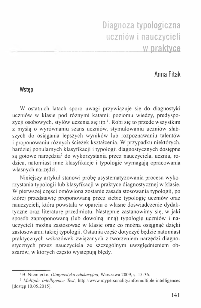 Diagnoza typologiczna uczniów i nauczycieli ________ w_praktyce Anna Fitak Wstęp W ostatnich latach sporo uwagi przywiązuje się do diagnostyki uczniów w klasie pod różnymi kątami: poziomu wiedzy, predyspo zycji osobowych, stylów uczenia się itp.1. Robi się to przede wszystkim z myślą o wyrównaniu szans uczniów, stymulowaniu uczniów słab szych do osiągania lepszych wyników lub rozpoznawaniu talentów i proponowaniu różnych ścieżek kształcenia. W przypadku niektórych, bardziej popularnych klasyfikacji i typologii diagnostycznych dostępne są gotowe narzędzia2 do wykorzystania przez nauczyciela, ucznia, ro dzica, natomiast inne klasyfikacje i typologie wymagają opracowania własnych narzędzi. Niniejszy artykuł stanowi próbę usystematyzowania procesu wyko rzystania typologii lub klasyfikacji w praktyce diagnostycznej w klasie. W pierwszej części omówiona zostanie zasada stosowania typologii, po której przedstawię proponowaną przez siebie typologię uczniów oraz nauczycieli, która powstała w oparciu o własne doświadczenie dydak tyczne oraz literaturę przedmiotu. Następnie zastanowimy się, w jaki sposób zaproponowaną (lub dowolną inną) typologię uczniów i na uczycieli można zastosować w klasie oraz co można osiągnąć dzięki zastosowaniu takiej typologii. Ostatnia część dotyczyć będzie natomiast praktycznych wskazówek związanych z tworzeniem narzędzi diagno stycznych przez nauczyciela ze szczególnym uwzględnieniem ob szarów, w których często występują błędy. 1B. Niemierko, Diagnostyka edukacyjna, Warszawa 2009, s. 15-36. 2 Multiple Intelligence Test, http://www.mypersonality.info/multiple-intelligences [dostęp 10.05.2015]. 141 Typy uczniów Przed przystąpieniem do omówienia różnych typologii uczniów należy przypomnieć, iż mówiąc o typologii, mamy na myśli podział o nieostrych granicach. W przeciwieństwie do klasyfikacji, w której poszczególne klasy są względem siebie rozłączne (jeśli coś należy do A, to nie należy do B), typologię charakteryzuje pewna płynność (jed nostka może spełniać wszystkie kryteria typu A, wybrane kryteria typu B, a nawet nieliczne typu C). W związku z tym diagnoza ucznia pod kątem określonej typologii będzie miała formę profilu, w którym nasz uczeń będzie w mniejszym lub większym stopniu spełniał kryteria prze widziane dla poszczególnych typów, a nie prostej kwalifikacji ucznia do określonej kategorii. Istnieje wiele typologii uczniów, dotyczących różnych obszarów ich funkcjonowania. Do popularnych należy podział ze względu na typy inteligencji wg H. Gardnera, który wyróżnił 8 podstawowych typów in teligencji odpowiadających określonym stylom uczenia się człowieka: logiczno-matematyczną, językową, przyrodniczą, interpersonalną, intrapersonalną, ruchową, wizualno-przestrzenną i muzyczną3. Z kolei R. Riebisch i H. Luszczynski przytaczają takie typy uczniów, jak intelektu alny, emocjonalny, działający i współpracujący4 Można zaproponować również inne typologie. Na potrzeby niniej szych rozważań przyjmę zatem typologię własną, nieco odmienną od przedstawionych powyżej, a zorientowaną przede wszystkim na styl funkcjonowania ucznia na lekcji i jego relacji z nauczycielem. Odwołam się w tym przypadku do metafory wojny, nie jako pola walki, ale jako szczególnej sytuacji wymagającej podjęcia określonych strategii w celu przetrwania, utrzymania własnego terytorium oraz pola nieustannej konfrontacji. W ten sposób wyróżnić można 5 typów uczniów: wojow nika, dezertera, stratega, partyzanta, przykładnego obywatela. 3 H. Gardner, Inteligencje wielorakie, przel. A. Jankowski, Warszawa 2009, s. 32. 4 R. Riebisch, H. Luszczynski, Diagnoza typów uczniów, przet. D. Michalska-Niedenthal, Sopot 2014, s. 25. 142 Uczeń-wojownik Jest to uczeń, który traktuje szkołę, jako pole nieustannej walki — z nauczycielami, systemem szkolnictwa, ideologiami, a nawet z innymi uczniami. Walki takiego ucznia dotyczą częściej sfery emocjonalnej niż sfery poznawczej. Wojownik stara się wyróżniać na tle klasy, nie podążać ścieżkami obranymi przez jego kolegów, często manifestując, nawet przesadnie swoją odmienność. Lubi wchodzić w dyskusje z na uczycielami, nawet jeśli zdaje sobie sprawę, że nie ma racji. Zdarza się, że prezentuje skrajne stanowiska w sprawach kontrowersyjnych i za ciekle ich broni. Uczeń-strateg Jest to uczeń, który ma dobrze przemyślany plan postępowania w różnych sytuacjach klasowych, co ma swoje dobre i złe strony. Jeśli jego celem jest opanowanie materiału i uzyskanie pozytywnej oceny, jest w stanie systematycznie pracować, aktywnie uczestniczyć w lekcji i konsekwentnie realizować swoje zamierzenie. Bywa jednak, że stra tegia naszego ucznia skupia się na „przetrwaniu” roku szkolnego i uzy skaniu pozytywnych wyników przy możliwie najmniejszym wkładzie pracy. Wówczas taki uczeń, często niezauważalnie, manipuluje swoją relacją z nauczycielem i uczestnictwem w zajęciach, aby osiągnąć swój cel. Tego rodzaju strategia może objawiać się na przykład zgłaszaniem się na początku semestru, gdy materiału jest niewiele, aby uzyskać dobrą ocenę z nadzieją, że nauczyciel nie będzie pytał po raz drugi ucznia, który ma już jedną ocenę z odpowiedzi itp. W niektórych przypadkach taką strategię przyjmują dzieci, które są nadmiernie obciążone obowiąz kami pozaszkolnymi, takimi jak zajęcia dodatkowe. Należy również nadmienić, że strateg jest osobą, która w swoje plany często angażuje innych uczniów i bywa, że stanowi ogniwo inicjujące wspólne działania klasy zmierzające do zmiany terminów sprawdzianów lub nakłonienia nauczyciela do odstępstwa od reguł. 143 Uczeń-partyzant Uczeń tego typu na ogół nie wyróżnia się niczym szczególnym na tle klasy, wręcz może sprawiać wrażenie osoby wycofanej, jednak oka zjonalni