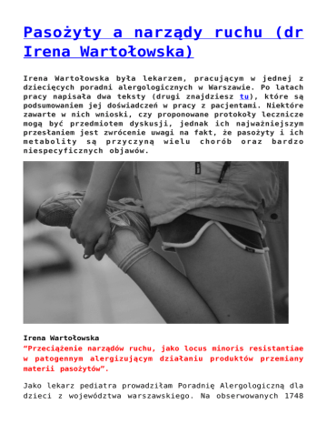 Pasożyty a narządy ruchu (dr Irena Wartołowska) Irena Wartołowska była lekarzem, pracującym w jednej z dziecięcych poradni alergologicznych w Warszawie. Po latach pracy napisała dwa teksty (drugi znajdziesz tu), które są podsumowaniem jej doświadczeń w pracy z pacjentami. Niektóre zawarte w nich wnioski, czy proponowane protokoły lecznicze mogą być przedmiotem dyskusji, jednak ich najważniejszym przesłaniem jest zwrócenie uwagi na fakt, że pasożyty i ich metabolity są przyczyną wielu chorób oraz bardzo niespecyficznych objawów. Irena Wartołowska “Przeciążenie narządów ruchu, jako locus minoris resistantiae w patogennym alergizującym działaniu produktów przemiany materii pasożytów”. Jako lekarz pediatra prowadziłam Poradnię Alergologiczną dla dzieci z województwa warszawskiego. Na obserwowanych 1748 dzieciach poczyniłam spostrzeżenia, że metabolity pasożytów są głównym alergenem uczulającym ludzki organizm. Usuwając pasożyty w całej rodzinie leczę wiele chorób, między innymi ustępują bóle kręgosłupa u rodziców chorych dzieci. Zmiany mogą zachodzić na zasadzie alergii komórkowej, która początkowo objawia się stanem zapalnym, przechodzącym potem w stan degeneracyjny. Działoby się to w locus minoris resistentiae w najbardziej obciążonej części układu kostnego. Jestem lekarzem pediatrą od 30 lat zajmuję się dziećmi chorymi na astmę. Poczyniłam pewne spostrzeżenia w alergii układu oddechowego, które mogą być wykorzystane przy leczeniu chorób układu kostnego. Ośmielam się twierdzić, że poza bakteriami, wirusami, grzybami alergenem uczulającym organizm ludzki są produkty przemiany materii pasożytów. Przedstawię obecnie wyniki leczenia w Poradni. W stanie astmatycznym po podaniu antybiotyku i ustąpieniu duszności podaje środki przeciw pasożytom nie tylko chorym dzieciom, ale i całemu otoczeniu dziecka. Takie odrobaczanie daje trwałe ustąpienie duszności zarówno u dzieci jak i u ich rodziców. Ponieważ leki podaję całej rodzinie, zauważyłam zaskakujące zjawiska. W najbliższym otoczeniu dzieci uzyskują wyleczenie wielu chorób: 1. Ustępuje nie tylko astma, ale wszelkie nawrotowe infekcje dróg oddechowych, mijają ostre nawrotowe zapalenia krtani i tchawicy, mijają nawrotowe anginy ropne; 2. Mijają choroby psychiczne, mijają drgawki, nadciśnienie, ruchy mimowolne, bóle głowy, wymioty związane z chorobą lokomocyjną, u dwojga dzieci ustąpiły spacery somnambuliczne, mija moczenie nocne: – opisałam 94 przypadki, a wśród nich u jednego 17-letniego astmatyka, moczącego się od urodzenia, ustąpiły obie te dolegliwości; 3. Mija niedotlenienie serca – zmiany alergiczne zachodzące w ścianie naczyń daje ich przepuszczalność, w związku z czym płyn surowiczy wychodzi z łożyska naczyniowego do przestrzeni międzykomórkowych i odsuwa komórkę serca od naczynia odżywiającego; 4. Mijają choroby nerek. Już Pirquet pisał, że zmiany w nerkach to nie tylko sprawa infekcji, ale przede wszystkim zachodzą tu zmiany alergiczne; 5. Ustępują choroby skóry od banalnych pokrzywek do najcięższych postaci o charakterze atopowym. Mija łuszczyca, mijają plamy bielacze; 6. Ustępują choroby przewodu pokarmowego (wyprowadziłam nawet troje dzieci z zespołu upośledzonego wchłaniania); 7. Mija anemia, lamblie dywanowo wyścielając kosmki jelita cienkiego, zwłaszcza w jego górnym odcinku, stanowią mechaniczną przeszkodę we wchłanianiu żelaza, (żelazo wchłania się w górnym odcinku jelita cienkiego). Mam wszelkie podejrzenie, że przyczyną białaczki są pasożyty. Jestem przekonana, że w patogenezie krzywicy utrudnione wchłanianie witaminy D3 jest również spowodowane obecnością lamblii; 8. Pasożyty torują drogę wirusom i blokują ciała odpornościowe. Przeleczone dzieci i ich rodzice nie zapadają na grypę. Dzieci nie chorują w czasie epidemii na świnkę, ospę wietrzną, na odrę. Może w tych spostrzeżeniach leży jakaś nadzieja w walce z wirusowym zapaleniem wątroby; 9. Normalizują się wyniki badań laboratoryjnych (OB, ASO, obniża się poziom seromukoidu); 10. U rodziców ustępują bóle kręgosłupa. Jaki może być mechanizm powstawania tych bólów? Można je tłumaczyć zmianami alergicznymi o typie komórkowym. Metabolity tych pasożytów jako mocny antygen krążący we krwi, powodują powstawanie przeciwciał na powierzchni komórek tucznych tkanki łącznej tego narządu, który w danym momencie jest miejscem najmniejszego oporu. W naszym przypadku w miejscu najbardziej obciążonej części kręgosłupa lub innego odcinka układu kostnego. Na skutek zaistniałego fenomenu łączenia się antygenu z przeciwciałem rozpada się komórka tuczna i uwalnia dotąd nietoksyczną część białkową histydynę, która zamienia się na toksyczną dla organizmu histaminę i na toksyczne ciała histaminopodobne. Powstaje stan zapalny sąsiednich tkanek, który z czasem przechodzi w proces degeneracyjny. Statystyki nie robiłam, zdjęć nie wykonywałam, ale w tym miejscu chcę dać świadectwo o szerokim wachlarzu patogennego oddziaływania pasożytów na organizm ludzki zwracając szczególną uwagę na układ kostny. Miałam w obserwacji 4 przypadki gośćca pierwotnego postępującego, oto jeden z nich: ojciec i syn astmatycy, obaj leczyli się u mnie. Po kuracji przeciw pasożytom u ojca i syna ustąpiła duszność, a u matki, o której chorobie nawet nie wiedziałam, minęły objawy daleko posuniętego gośćca przewlekłego postępującego. Zdjęcie rentgenowskie wykazywało geody w drobnych kościach dłoni i stóp. Po trzech latach kontrolne zdjęcie ujawniło: “zejście nekrotycznych, aspektycznych ognisk w kościach drobnych dłoni i stóp”. Matka wyleczona zaocznie. Rodzina ta po 5 latach ponownie zgłosiła się do mnie, tym razem z powodu stanu depresyjno-maniakalnego u matki. Powtórzenie pełnej kuracji przeciw paso