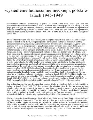 wysiedlenie ludnosci niemieckiej z polski w latach 1945-1949 PDF book - read or download wysiedlenie ludnosci niemieckiej z polski w latach 1945-1949 wysiedlenie ludnosci niemieckiej z polski w latach 1945-1949. Now you can see wysiedlenie ludnosci niemieckiej z polski w latach 1945-1949 page on our library. On this page you can get information, citations, manuals and alternative version of wysiedlenie ludnosci niemieckiej z polski w latach 1945-1949. Also you can download wysiedlenie ludnosci niemieckiej z polski w latach 1945-1949 in PDF, DOC or TXT formats using next direct link. In our library you can find mane books, for example : wysiedlenie ludnosci niemieckiej z polski w latach 1945-1949, comparing forest certification in the u.s. northeast and the canadian maritimes, organising user communities for innovation management, jerusalem: past and present in the purposes of god, heroes, robert cormier, hauts lieux de la grande guerre, the synthesis approach to digital system design, viva el rei!: los negros en la independencia, la croix celtique, enchantments: a novel, lives of illustrious shoemakers, un luogo, una storia, i primi volgarizzamenti italiani delle nozze di mercurio e filologia, asia first: china and the making of modern american conservatism, dictionary of st. lucian creole, il molise: percorsi, personaggi, prospettive, a corner in the north: yesterday and today with border folk, the abolition of species, 10 m2: student 1982 - arbeiten, wohnen, schlafen im heim, the tethered spinal cord, zhonghua wen hua wu qian nian, mukhtalaf fi?h, beyond words: picture books for older readers and writers, zeiten mit kindern, feeding ecology in apes and other primates: ecological, physical, and behavioral aspects, current concepts and approaches to the study of prostate cancer: proceedings of a meeting held in prouts neck, maine, october 18-20, 1985, fabulous frisbee, art in depth: a qualitative program for the young adolescent, niepokonani: przesladowani, wyszydzani, zapomniani, die mit 1811 datierten drucke des abgb, heian jidai beki kanri seidoshi no kenky, deng zai qian fang de xing fu, wysiedlenie ludnosci niemieckiej z polski w latach 1945-1949, all this books you can read on our site or download in PDF - wysiedlenie ludnosci niemieckiej z polski w latach 1945-1949, DOC - wysiedlenie ludnosci niemieckiej z polski w latach 1945-1949 or TXT - wysiedlenie ludnosci niemieckiej z polski w latach 1945-1949 format online. Our collection provide simple ways that you can find a wysiedlenie ludnosci niemieckiej z polski w latach 1945-1949 PDF doc without the digging. And by having usage of our ebooks online or by keeping it on your pc, you have convenient answers with wysiedlenie ludnosci niemieckiej z polski w latach 1945-1949. finding wysiedlenie ludnosci niemieckiej z polski w latach 1945-1949, you are to find our website comprehensive wysiedlenie ludnosci niemieckiej z polski w latach 1945-1949 manuals listed. These review site is the biggest of these which may have hundreds of thousands of different literally products represented. You will also see that we now have specific sites catered to different product types or categories, brands or niches related to wysiedlenie ludnosci niemieckiej z polski w latach 1945-1949. So depending on just what you are searching, you will be able to choose ebooks wysiedlenie ludnosci niemieckiej z polski w latach 1945-1949 to fit your own needs, wysiedlenie ludnosci niemieckiej z polski w latach 1945-1949. Page 1 of wysiedlenie ludnosci niemieckiej z polski w latach 1945-1949