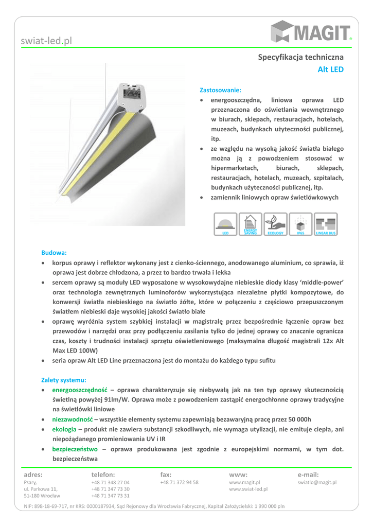 Specyfikacja techniczna Alt LED Zastosowanie: energooszczędna, liniowa oprawa LED przeznaczona do oświetlania wewnętrznego w biurach, sklepach, restauracjach, hotelach, muzeach, budynkach użyteczności publicznej, itp. ze względu na wysoką jakość światła białego można ją z powodzeniem stosować w hipermarketach, biurach, sklepach, restauracjach, hotelach, muzeach, szpitalach, budynkach użyteczności publicznej, itp. zamiennik liniowych opraw świetlówkowych Budowa: korpus oprawy i reflektor wykonany jest z cienko-ściennego, anodowanego aluminium, co sprawia, iż oprawa jest dobrze chłodzona, a przez to bardzo trwała i lekka sercem oprawy są moduły LED wyposażone w wysokowydajne niebieskie diody klasy ‘middle-power’ oraz technologia zewnętrznych luminoforów wykorzystująca niezależne płytki kompozytowe, do konwersji światła niebieskiego na światło żółte, które w połączeniu z częściowo przepuszczonym światłem niebieski daje wysokiej jakości światło białe oprawę wyróżnia system szybkiej instalacji w magistralę przez bezpośrednie łączenie opraw bez przewodów i narzędzi oraz przy podłączeniu zasilania tylko do jednej oprawy co znacznie ogranicza czas, koszty i trudności instalacji sprzętu oświetleniowego (maksymalna długość magistrali 12x Alt Max LED 100W) seria opraw Alt LED Line przeznaczona jest do montażu do każdego typu sufitu Zalety systemu: energooszczędność – oprawa charakteryzuje się niebywałą jak na ten typ oprawy skutecznością świetlną powyżej 91lm/W. Oprawa może z powodzeniem zastąpić energochłonne oprawy tradycyjne na świetlówki liniowe niezawodność – wszystkie elementy systemu zapewniają bezawaryjną pracę przez 50 000h ekologia – produkt nie zawiera substancji szkodliwych, nie wymaga utylizacji, nie emituje ciepła, ani niepożądanego promieniowania UV i IR bezpieczeństwo – oprawa produkowana jest zgodnie z europejskimi normami, w tym dot. bezpieczeństwa Dane techniczne: Model oprawy Alt LED Źródło światła LED Napięcie zasilania 220-240V AC, 50-60Hz Korekcja współczynnika mocy tak LAL-P028 LAL-P041 LAL-P055 LAL-P069 Strumień świetlny op. (4 000K, Ra>80) 2 500lm 3 800lm 5 000lm 6 300lm Strumień świetlny op. (3 000K, Ra>90) 1 900lm 2 900lm 3 800lm 4 800lm Temperatura barwowa Moc oprawy 3 000K / 4 000K 28W 41W 55W Skuteczność świetlna oprawy (4 000K) 91lm/W Skuteczność świetlna oprawy (3 000K) 69lm/W Kąt świecenia 90° Ra>80 (4 000K) Ra>90 (3 000K) Wskaźnik oddawania barw Szczelność oprawy IP40 Zakres temperatur pracy od +5 do +40°C Trwałość źródła światła 50 000h Długość oprawy [mm] Waga 69W 630 930 1230 1530 2 000g 2 800g 3 600g 4 400g Dane techniczne: Model oprawy Alt Max LED Źródło światła LED Napięcie zasilania 220-240V AC, 50-60Hz Korekcja współczynnika mocy tak LAML-P040 LAML-P060 LAML-P080 LAML-P100 Strumień świetlny op. (4 000K, Ra>80) 3 600lm 5 400lm 7 200lm 9 000lm Strumień świetlny op. (3 000K, Ra>90) 2 700lm 4 100lm 5 500lm 6 900lm Temperatura barwowa Moc oprawy 3 000K / 4 000K 40W 60W 80W Skuteczność świetlna oprawy (4 000K) 91lm/W Skuteczność świetlna oprawy (3 000K) 69lm/W Kąt świecenia 90° Ra>80 (4 000K) Ra>90 (3 000K) Wskaźnik oddawania barw Szczelność oprawy IP40 Zakres temperatur pracy od +5 do +35°C Trwałość źródła światła 50 000h Długość oprawy [mm] Waga 100W 630 930 1230 1530 1 500g 2 300g 4 100g 4 900g Warianty wykonania: Systemy montażu: