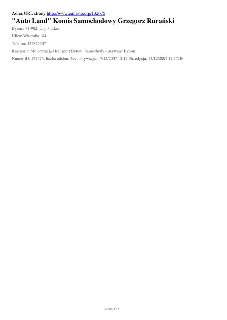 Adres URL strony http://www.emiasto.org/132675 "Auto Land" Komis Samochodowy Grzegorz Rurański Bytom, 41-902, woj. śląskie Ulica: Witczaka 184 Telefon: 322825307 Kategorie: Motoryzacja i transport Bytom, Samochody - używane Bytom Numer ID: 132675, liczba odsłon: 409, aktywacja: 17/12/2007 12:17:36, edycja: 13/12/2007 12:17:36 Strona 1 / 1