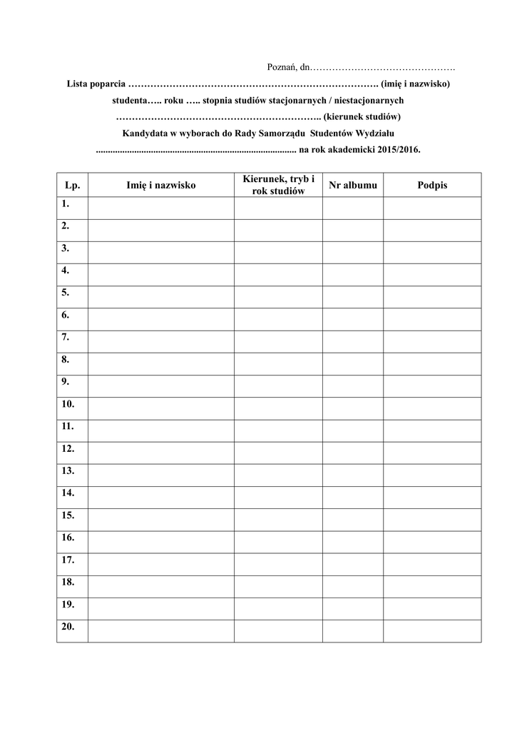 Poznań, dn………………………………………. Lista poparcia ……………………………………………………………………. (imię i nazwisko) studenta….. roku ….. stopnia studiów stacjonarnych / niestacjonarnych ……………………………………………………….. (kierunek studiów) Kandydata w wyborach do Rady Samorządu Studentów Wydziału .................................................................................... na rok akademicki 2015/2016. Lp. 1. 2. 3. 4. 5. 6. 7. 8. 9. 10. 11. 12. 13. 14. 15. 16. 17. 18. 19. 20. Imię i nazwisko Kierunek, tryb i rok studiów Nr albumu Podpis