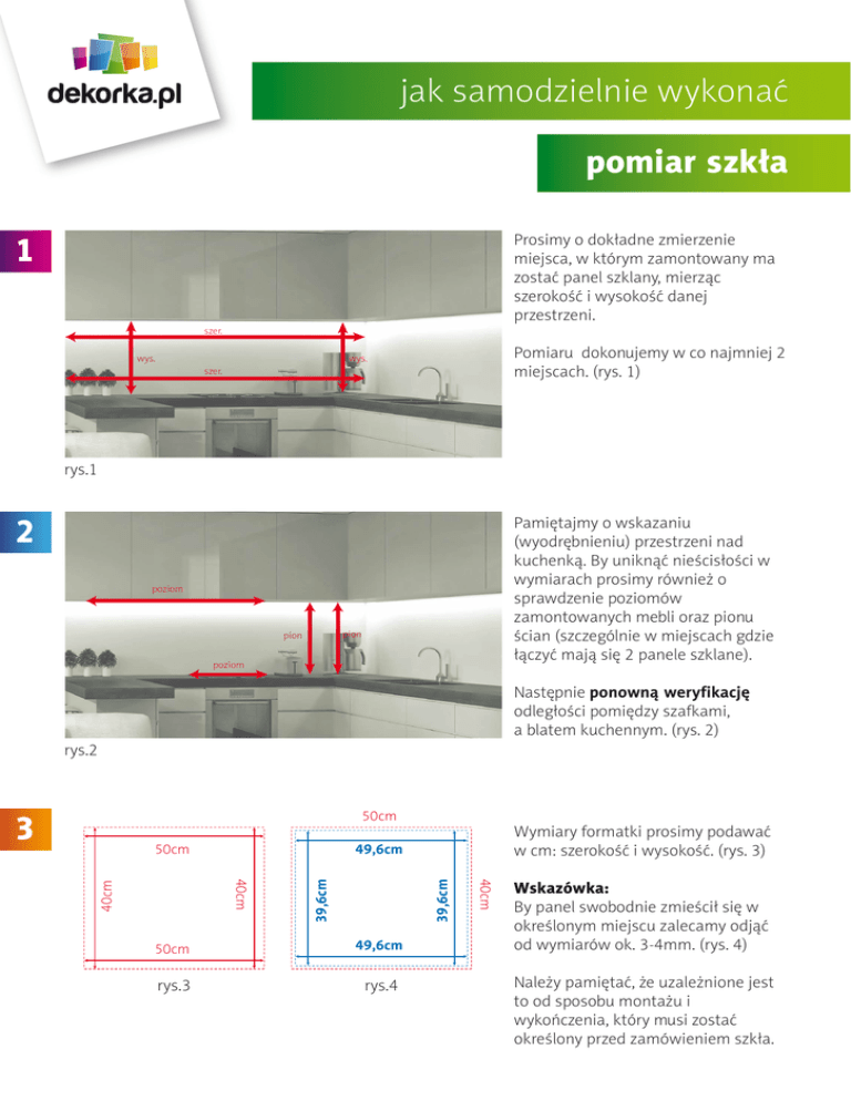 jak samodzielnie wykonać pomiar szkła 1 Prosimy o dokładne zmierzenie miejsca, w którym zamontowany ma zostać panel szklany, mierząc szerokość i wysokość danej przestrzeni. szer. wys. Pomiaru dokonujemy w co najmniej 2 miejscach. (rys. 1) wys. szer. rys.1 2 Pamiętajmy o wskazaniu (wyodrębnieniu) przestrzeni nad kuchenką. By uniknąć nieścisłości w wymiarach prosimy również o sprawdzenie poziomów zamontowanych mebli oraz pionu ścian (szczególnie w miejscach gdzie łączyć mają się 2 panele szklane). poziom pion pion poziom Następnie ponowną weryfikację odległości pomiędzy szafkami, a blatem kuchennym. (rys. 2) rys.2 3 50cm 49,6cm rys.3 rys.4 39,6cm 40cm 40cm 39,6cm 50cm Wskazówka: By panel swobodnie zmieścił się w określonym miejscu zalecamy odjąć od wymiarów ok. 3-4mm. (rys. 4) 50cm 40cm 49,6cm Wymiary formatki prosimy podawać w cm: szerokość i wysokość. (rys. 3) Należy pamiętać, że uzależnione jest to od sposobu montażu i wykończenia, który musi zostać określony przed zamówieniem szkła. jak samodzielnie wykonać pomiar szkła 4 Jeśli w szkle mają zostać wycięte otwory np. na gniazdka elektryczne prosimy o podanie wymiarów od najbliższej krawędzi - dolnej lub górnej i bocznej - do osi gniazdka elektrycznego. (rys. 5) rys.5 200cm UWAGA! Odległość od krawędzi otworu powinna być dwa razy większa niż szerokość otworu. (rys. 6) >2x >2x x rys.6 102cm 135cm 15cm 25cm 25cm 10cm 54,5cm 10cm 54,5cm 54,5cm 6,5cm 54,5cm 5 Przy składaniu zamówienia na druk na szkle, ZAWSZE prosimy o przesłanie rysunku z zaznaczonymi wymiarami. (rys. 7) 6,5cm 15cm 102cm 135cm UWAGA! Powierzchnia na której zamontowane zostanie szkło powinna być właściwie przygotowana. Ściany powinny być suche, wolne od kurzu i odpowiednio wcześniej pomalowane z zachowaniem sztuki malarskiej. Ich powierzchnia powinna być równa - niedopuszczalne są wszelkiego rodzaju odpryski, łuszcząca się farba, tłuste plamy itd. By odwzorowanie kolorystyczne paneli było właściwe zalecamy pomalowanie ścian na biały kolor.
