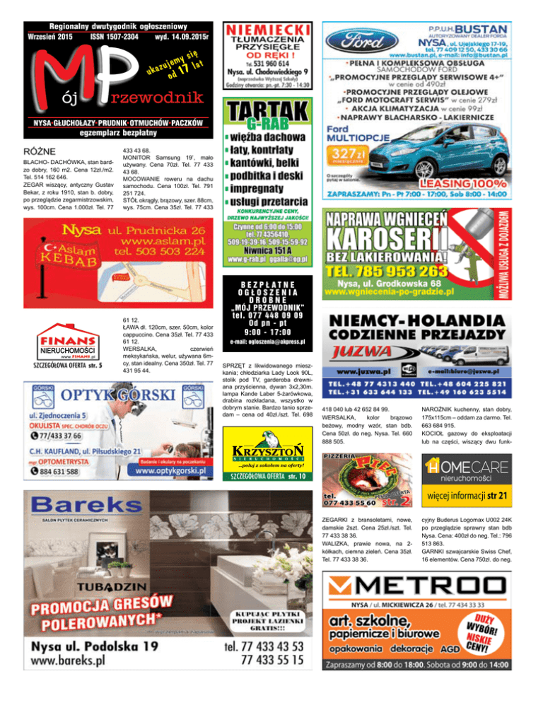 Regionalny dwutygodnik og³oszeniowy Wrzesień 2015 ISSN 1507-2304 wyd. 14.09.2015r siê y m e uj lat ukaz od 17 NYSA G£UCHO£AZY PRUDNIK OTMUCHÓW PACZKÓW egzemplarz bezp³atny RÓŻNE BLACHO- DACHÓWKA, stan bardzo dobry, 160 m2. Cena 12zł./m2. Tel. 514 162 646. ZEGAR wiszący, antyczny Gustav Bekar, z roku 1910, stan b. dobry, po przeglądzie zegarmistrzowskim, wys. 100cm. Cena 1.000zł. Tel. 77 SZCZEGÓŁOWA OFERTA str. 5 433 43 68. MONITOR Samsung 19’, mało używany. Cena 70zł. Tel. 77 433 43 68. MOCOWANIE roweru na dachu samochodu. Cena 100zł. Tel. 791 251 724. STÓŁ okrągły, brązowy, szer. 88cm, wys. 75cm. Cena 35zł. Tel. 77 433 61 12. ŁAWA dł. 120cm, szer. 50cm, kolor cappuccino. Cena 35zł. Tel. 77 433 61 12. WERSALKA, czerwień meksykańska, welur, używana 6mcy, stan idealny. Cena 350zł. Tel. 77 431 95 44. BEZPŁATNE OGŁOSZENIA DROBNE „MÓJ PRZEWODNIK” tel. 077 448 09 09 Od pn - pt 9:00 - 17:00 e-mail: [email protected] SPRZĘT z likwidowanego mieszkania; chłodziarka Lady Look 90L, stolik pod TV, garderoba drewniana przyścienna, dywan 3x2,30m. lampa Kande Laber 5-żarówkowa, drabina rozkładana, wszystko w dobrym stanie. Bardzo tanio sprzedam – cena od 40zł./szt. Tel. 698 418 040 lub 42 652 84 99. WERSALKA, kolor brązowo beżowy, modny wzór, stan bdb. Cena 50zł. do neg. Nysa. Tel. 660 888 505. NAROŻNIK kuchenny, stan dobry, 175x115cm – oddam za darmo. Tel. 663 684 915. KOCIOŁ gazowy do eksploatacji lub na części, wiszący dwu funk- nieruchomosci SZCZEGÓŁOWA OFERTA str. 10 2 ZEGARKI z bransoletami, nowe, damskie 2szt. Cena 25zł./szt. Tel. 77 433 38 36. WALIZKA, prawie nowa, na 2kółkach, ciemna zieleń. Cena 35zł. Tel. 77 433 38 36. więcej informacji str 21 cyjny Buderus Logomax U002 24K po przeglądzie sprawny stan bdb Nysa. Cena: 400zł do neg. Tel.: 796 513 863. GARNKI szwajcarskie Swiss Chef, 16 elementów. Cena 750zł. do neg. BEZPŁATNE OGŁOSZENIA DROBNE „MÓJ PRZEWODNIK” tel. 077 448 09 09 [email protected] Tel. 77 448 39 78 lub 665 933 585 od 12.00 – 24.00. PERUKA damska, nowa, krótka, włos koloru blond. Cena 200zł. Tel. 606 108 312. UBRANKA dla dziewczynki, rozm. 146-152 + buty. Cena 5zł./szt. Tel. 530 356 129. PIEC CO węglowy, ogrzewa do 100m2, posiada żeliwne ruszta, zawór do spuszczania wody jest przy piecu, nie posiada tabliczki znami- str. eniowej. Cena 300zł. do neg. Tel. 788 821 707 lub sms. SOFA skórzana + 2 fotele skóra, dąb,. Stan bdb. Cena 1.000zł. Tel. 784 002 809. MASZYNA do szycia Singer, walizkowa, z przybornikiem, stan idealny. Cena 120zł. Tel.: 601 069 092. PLECAK duży, ze stelażem – oddam. Tel. 692 934 696. ROWER górski, męski, 26’, z fotelikiem dla dziecka. Cena 160zł. Tel. 600 772 865. ROWEREK dziecięcy na wiek 47lat, stan dobry. Cena 270zł. Tel. 725 443 191. PANELE ścienne kolor olcha górska, pow. pokrycia ok 20m2 nieużywane Cena: 180zł. Tel.: 726 335 419. WERSALKĘ – oddam, kolor pomarańcz jasny + zieleń jasna, na nóżkach metalowych, stan dobry. Tel. 507 929 591. APARAT fotograficzny Canon AL.-1 LENS FD 500mm 1:1,4, sprawny technicznie, oryginalna skórzana torba i emblematy MS. Cena 140zł. Tel. 600 464 347. KRZESŁO skórzane, kolor niebieski. Cena 40zł. Tel. 600 464 347. STÓŁ na 12osób, rozsuwany + 6krzeseł. Cena 1000zł. Tel. 785 715 885. BRAMY metalowe, motyw kwiatowy z furtkami, szer. bramy 3,5m – 2szt – 3000zł. i 2.500zł. Tel. 785 715 885. KOMIKSY min. Bolek i Atomek”, „Kajko i Kokosz”. Cena od 5zł./szt. Tel. 531 059 036. NAWIGACJA sam. GPS Fun Rood 4.3 – zamienię na miernik gr. lakieru. Tel. 604 638 469. MONITOR model EV700 100-240 V-2.0A, 50-60Hz. Cena 100zł. Tel. 661 707 422. MEBLE biurowe, używane – kupię. Tel. 604 065 217. ROWER Monza, koła 26’, męski MTB break er. Cena 180zł. Tel. 608 065 497. ZAMRAŻARKA Wirpool. Cena 800zł. Tel. 503 307 062. PRALKA Frania. Cena 100zł. Tel. 503 307 062. WIRÓWKA. Cena 150zł. Tel. 503 307 062. WÓZEK Conecto Toledo, głęboko spacerowy, czerwono czarny z ochraniaczami, śpiwór. Cena 220zł. Tel. 600 629 535. CHODZIK do nauki chodzenia dla dziecka, zielono-pomarańczowy Cena: 60zł. Tel.: 600 629 535. LEŻACZEK bujaczek Fischer Price, z wibracjami, 3zabawkami. Cena 60zł. Tel. 600 629 535. MATERAC kokos grykos. Cena 40zł. Tel. 600 629 535. UBRANKA do chrztu dla chłopca, białe buciki i czapeczka – 50zł. Tel. BEZPŁATNE OGŁOSZENIA DROBNE, tel. 77 448 09 09 pn. - pt. od 9.00 - 17.00, [email protected], www.mojprzewodnik.pl 600 629 535. KARUZELA grająca, nowa, z delfinami - -50zł., ubranka do chrztu dla dziewczynki, biała sukieneczka + buciki i czapeczka – 60zł. Tel. 600 629 535. ŁÓŻKO drewniane, młodzieżowe + materac 90x200. Cena 250zł. do neg. Tel. 660 582 562. WÓZEK inwalidzki, stan dobry. Cena 300zł. do neg. Tel. 660 582 562. UBRANKA dla chłopczyka od 1roku do 5lat; koszulki, bluzki, bluzy, spodnie, buty, kurtki wiosenne i zimowe itp. Cena od 3zł./szt. Tel. 798 277 139. BECZKI na wodę, plastikowe, metalowe, 220l. Cena 50zł. Tel. 660 BEZPŁATNE OGŁOSZENIA DROBNE, tel. 77 448 09 09 pn. - pt. od 9.00 - 17.00, [email protected], www.mojprzewodnik.pl str. BEZPŁATNE OGŁOSZENIA DROBNE „MÓJ PRZEWODNIK” tel. 077 448 09 09 [email protected] 791 279. AGROWŁÓKNINA wiosenna 1,5 x 250m. Cena 150zł. Tel. 660 791 279. FOTEL bujany – kupię do 50zł. Tel. 660 791 279. PŁASZCZ zimowy 164 z wycierusa, obszyty białym kręconym misiem, bardzo ciekawy i ładny. Cena 30zł. Tel. 728 457 149. KURTKA skóro podobna, kolor; kawa z mlekiem, kupiona na targu grodkowskim, pikowana z zamkami, rozm. 42-44, nowa. Cena 70zł. Tel. 728 457 149. SUKIENKA komunijna, ozdobiona koralikami i pasmanterią jedwabną, dół sukienki usztywniony kołem, rękawki do łokcia z falbanką, wianek. Cena 60zł. do neg. Tel. 728 str. 457 149. KOŁNIERZ rehabilitacyjny, na szyję, stan bdb. Cena 40zł. do neg. Tel. 728 457 149. SUKIENKI, bluzki i inne rzeczy, rozm. XL, na 164-170cm wzrostu; buty r