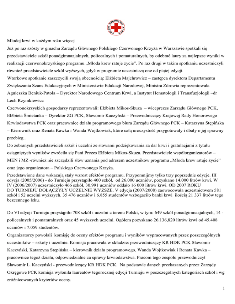 Młodej krwi w każdym roku więcej Już po raz szósty w gmachu Zarządu Głównego Polskiego Czerwonego Krzyża w Warszawie spotkali się przedstawiciele szkół ponadgimnazjalnych, policealnych i pomaturalnych, by odebrać laury za najlepsze wyniki w realizacji czerwonokrzyskiego programu „Młoda krew ratuje życie”. Po raz drugi w takim spotkaniu uczestniczyli również przedstawiciele szkół wyższych, gdyż w programie uczestniczą one od piątej edycji. Wtorkowe spotkanie zaszczycili swoją obecnością: Elżbieta Majchrowicz – zastępca dyrektora Departamentu Zwiększania Szans Edukacyjnych w Ministerstwie Edukacji Narodowej, Ministra Zdrowia reprezentowała Agnieszka Beniuk-Patoła – Dyrektor Narodowego Centrum Krwi, a Instytut Hematologii i Transfuzjologii –dr Lech Rzymkiewicz Czerwonokrzyskich gospodarzy reprezentowali: Elżbieta Mikos-Skuza – wiceprezes Zarządu Głównego PCK, Elżbieta Śmietanka – Dyrektor ZG PCK, Sławomir Kaczyński – Przewodniczący Krajowej Rady Honorowego Krwiodawstwa PCK oraz pracownice działu programowego biura Zarządu Głównego PCK – Katarzyna Stępińska – Kierownik oraz Renata Kawka i Wanda Wojtkowiak, które całą uroczystość przygotowały i dbały o jej sprawny przebieg.. Do zebranych przedstawicieli szkół i uczelni ze słowami podziękowania za dar krwi i gratulacjami z tytułu osiągniętych wyników zwróciła się Pani Prezes Elżbieta Mikos-Skuza. Przedstawiciele współorganizatorów – MEN i MZ -również nie szczędzili słów uznania pod adresem uczestników programu „Młoda krew ratuje życie” oraz jego organizatora – Polskiego Czerwonego Krzyża. Przedstawione dane wskazują stały wzrost efektów programu. Przypomnijmy tylko trzy poprzednie edycje. III edycja (2005/2006) - do Turnieju przystąpiło 400 szkół, od 26.000 uczniów, pozyskano 14.000 litrów krwi. W IV (2006/2007) uczestniczyło 466 szkół, 30.991 uczniów oddało 16 000 litrów krwi. OD 2007 ROKU DO TURNIEJU DOŁĄCZYŁY UCZELNIE WYŻSZE. V edycja (2007/2008) zaowocowała uczestnictwem 581 szkół i 52 uczelni wyższych. 35 476 uczniów i 6.855 studentów wzbogaciło banki krwi ilością 21 337 litrów tego bezcennego leku. Do VI edycji Turnieju przystąpiło 708 szkół i uczelni z terenu Polski, w tym: 649 szkół ponadgimnazjalnych, 14 policealnych i pomaturalnych oraz 45 wyższych uczelni. Ogółem pozyskano 26.136,820 litrów krwi od 45.408 uczniów i 7.059 studentów. Organizatorzy powołali komisję do oceny efektów programu i wyników wypracowanych przez poszczególnych uczestników – szkoły i uczelnie. Komisja pracowała w składzie: przewodniczący KR HDK PCK Sławomir Kaczyński, Katarzyna Stępińska – kierownik działu programowego, Wanda Wojtkowiak i Renata Kawka – pracownice tegoż działu, odpowiedzialne za sprawy krwiodawstwa. Pracom tego zespołu przewodniczył Sławomir L. Kaczyński - przewodniczący KR HDK PCK. Na podstawie danych przekazanych przez Zarządy Okręgowe PCK komisja wyłoniła laureatów tegorocznej edycji Turnieju w poszczególnych kategoriach szkół i wg zróżnicowanych kryteriów oceny. 1 I. KATEGORIA: szkoły ponadgimnazjalne 1. Procent uczniów krwiodawców do ogólnej liczby pełnoletnich uczniów w szkole wg stanu na dzień 31.03.2009 r. poszczególne miejsca zajęły szkoły: Miejsce I - Liceum Ogólnokształcące w Dobroniu, okręg łódzki. Miejsce II – Zespół Szkół Zawodowych w Brodnicy, okręg kujawsko-pomorski. Miejsce III – Zespół Szkół Budowlanych w Olsztynie, okręg warmińsko-mazurski. 2. Ilość krwi oddanej w ramach Turnieju, w przeliczeniu na jednego pełnoletniego ucznia w szkole wg stanu na dzień 31.03.2009 r. poszczególne miejsca zajęły szkoły: Miejsce I – I Liceum Ogólnokształcące w Błoniu, okręg mazowiecki. Miejsce II – Zespół Szkół Zawodowych w Brodnicy, okręg kujawsko-pomorski. Miejsce III – Zespół Szkół Technicznych w Wodzisławiu, okręg śląski. 3. Wyróżnienie dodatkowe za Największą ilość pozyskanej krwi w ramach Turnieju poszczególne miejsca zajęły szkoły: Miejsce I - Zespół Szkół Technicznych w Wodzisławiu, okręg śląski. Miejsce II - Zespół Szkół Technicznych w Leżajsku, okręg podkarpacki. Miejsce III - Zespół Szkół Zawodowych nr 1 i II Liceum Ogólnokształcące we Włodawie, okręg lubelski. II. KATEGORIA: szkoły policealne, pomaturalne 1. Procent uczniów krwiodawców do ogólnej liczby pełnoletnich uczniów w szkole wg stanu na dzień 31.03.2009 r. poszczególne miejsca zajęły szkoły: Miejsce I - Szkoła Policealna Ochrony Zdrowia w Łomży, okręg podlaski. Miejsce II – Policealna Szkoła Medyczna w Kołobrzegu, okręg zachodniopomorski. Miejsce III – Szkoła Policealna im. K.A. Bahrkego w Ełku, okręg warmińsko-mazurski. 2. Ilość krwi oddanej w ramach Turnieju, w przeliczeniu na jednego pełnoletniego ucznia w szkole wg stanu na dzień 31.03.2009 r. poszczególne miejsca zajęły szkoły: Miejsce I - Policealna Szkoła Medyczna w Kołobrzegu, okręg zachodniopomorski. Miejsce II - Szkoła Policealna Ochrony Zdrowia w Łomży, okręg podlaski. Miejsce III - Szkoła Policealna im. K.A. Bahrkego w Ełku, okręg warmińsko-mazurski. 3. Wyróżnienie dodatkowe za Największą ilość pozyskanej krwi w ramach Turnieju poszczególne miejsca zajęły szkoły: Miejsce I – Medyczna Szkoła Policealna w Rzeszowie, okręg podkarpacki. Miejsce II – Policealna Szkoła Medyczna w Kołobrzegu, okręg zachodniopomorski. Miejsce III - Szkoła Policealna Ochrony Zdrowia w Łomży, okręg podlaski. 2 III. KATEGORIA: uczelnie / szkoły wyższe 1. Procent studentów krwiodawców do ogólnej liczby studentów na uczelni wg stanu na dzień 31.03.2009 r. poszczególne miejsca zajęły uczelnie: Miejsce I - Wyższe Seminarium Duchowne w Łomży, okręg podlaski. Miejsce II – Państwowa Wyższa Szkoła Zawodowa w Gnieźnie, okręg wielkopolski. Miejsce III – Uniwersytet Kazimierza Wielkiego