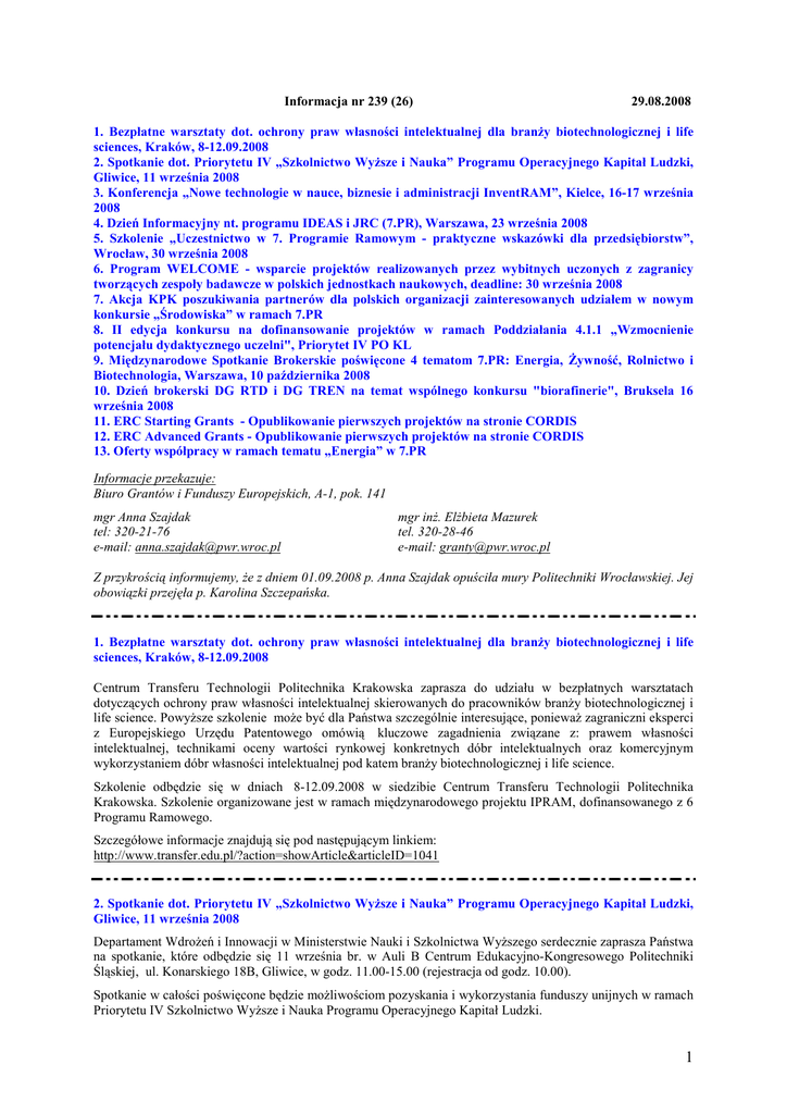 Informacja nr 239 (26) 29.08.2008 1. Bezpłatne warsztaty dot