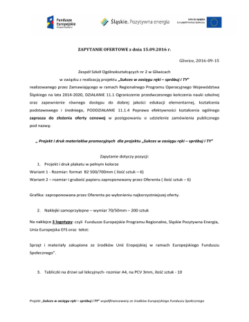 ZAPYTANIE OFERTOWE z dnia 15.09.2016 r. Gliwice, 2016-09-15 Zespół Szkół Ogólnokształcących nr 2 w Gliwicach w związku z realizacją projektu „Sukces w zasięgu ręki – spróbuj i TY” realizowanego przez Zamawiającego w ramach Regionalnego Programu Operacyjnego Województwa Śląskiego na lata 2014-2020, DZIAŁANIE 11.1 Ograniczenie przedwczesnego kończenia nauki szkolnej oraz zapewnienie równego dostępu do dobrej jakości edukacji elementarnej, kształcenia podstawowego i średniego, PODDZIAŁANIE 11.1.4 Poprawa efektywności kształcenia ogólnego zaprasza do złożenia oferty cenowej w postępowaniu o udzielenie zamówienia publicznego pod nazwą: „ Projekt i druk materiałów promocyjnych dla projektu „Sukces w zasięgu ręki – spróbuj i TY” Zapytanie dotyczy pozycji: 1. Projekt i druk plakatu w pełnym kolorze Wariant 1 - Rozmiar: format B2 500/700mm ( ilość sztuk – 6) Wariant 2 – rozmiar i grubość papieru zaproponowany przez Oferenta ( ilość sztuk – 6) Grafika: zaproponowana przez Oferenta po wyłonieniu najkorzystniejszej oferty. 2. Naklejki samoprzylepne – wymiar 70/50mm – 200 sztuk Na naklejce 3 logotypy: czyli Fundusze Europejskie Programu Regionalne, Sląskie Pozytywna Energia, Unia Europejska EFS oraz tekst: Sprzęt i materiały zakupione ze środków Unii Eropejskiej w ramach Europejskiego Funduszu Społecznego”. 3. Tabliczki na drzwi sal lekcyjnych- rozmiar A4, na PCV 3mm, ilość sztuk - 10 Projekt „Sukces w zasięgu ręki – spróbuj i TY” współfinansowany ze środków Europejskiego Funduszu Społecznego Opis sposobu obliczenia ceny. 1) Cenę oferty należy podać w złotych polskich z dokładnością do dwóch miejsc po przecinku. 2) W przypadku pozycji 1 – plakat – należy podac cenę dla wariantu nr 1 oraz zaproponować cenę dla wariantu nr 2 podając rozmiar i inne parametry techniczne plakatu. 3) Łączna cena oferty musi obejmować cały zakres zamówienia, określony w zapytaniu ofertowym, czyli projekt materiałów, druk, dostarczenie materiałów do Zamawiajacego. Ofertę cenową należy przesłać w terminie do dnia 23 września 2016 r. do godziny 11.00 drogą elektroniczną na adres: [email protected] Informacje dodatkowe: Postępowanie może zostać zamknięte bez dokonania wyboru, w szczególności w przypadku, gdy oferta najkorzystniejsza, przekracza kwotę jaką można przeznaczyć na sfinansowanie zamówienia, postępowanie może zostać zamknięte bez wybrania którejkolwiek oferty. Wykonawca, którego oferta zostanie wybranaѯ będzie zobowiązany przesłać drogą mailową do akceptacji projekty materiałów promocyjnych w terminie do 30.09.2016 r. Wzory logotypów Unijnych i wizualizcję można pobrać na stronie: https://rpo.slaskie.pl/czytaj/poznaj_zasady_promowania_projektu Osoba uprawniona do kontaktów: Jolanta Stąpór, tel/fax: 32 234 25 53, e-mail: [email protected] Projekt „Sukces w zasięgu ręki – spróbuj i TY” współfinansowany ze środków Europejskiego Funduszu Społecznego