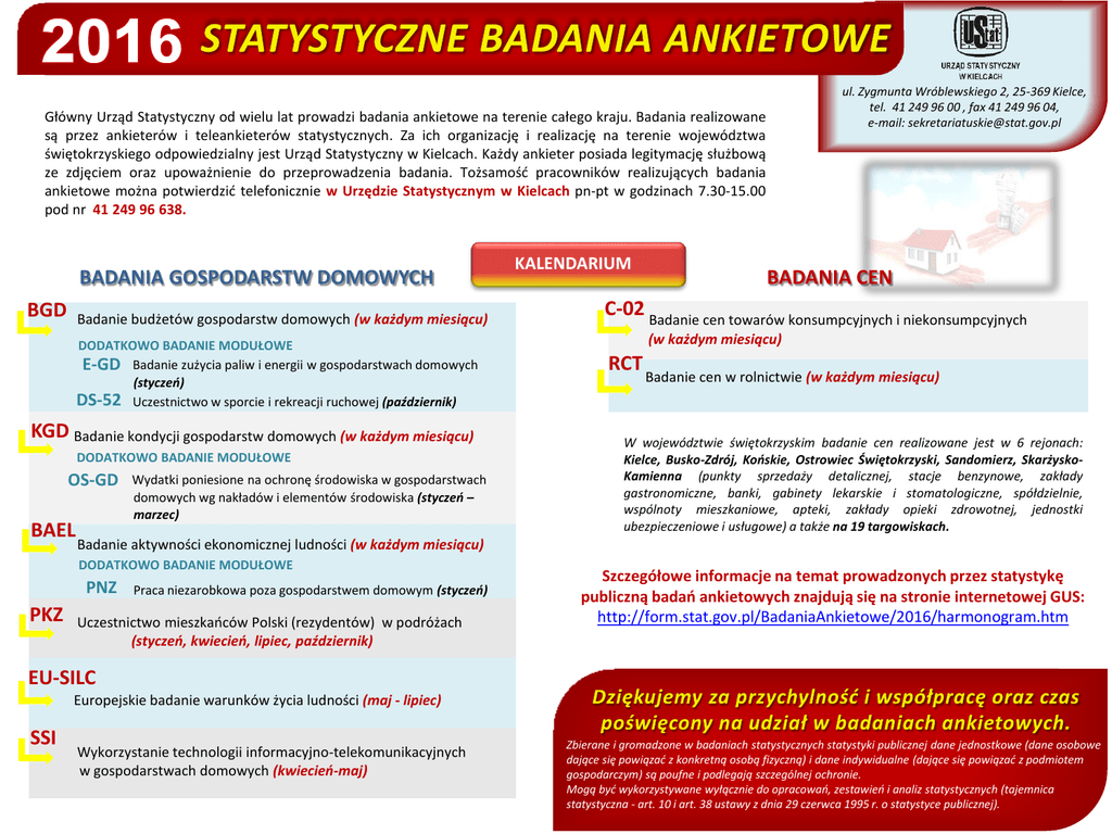 ul. Zygmunta Wróblewskiego 2, 25-369 Kielce, tel. 41 249 96 00 , fax 41 249 96 04, e-mail: [email protected] Główny Urząd Statystyczny od wielu lat prowadzi badania ankietowe na terenie całego kraju. Badania realizowane są przez ankieterów i teleankieterów statystycznych. Za ich organizację i realizację na terenie województwa świętokrzyskiego odpowiedzialny jest Urząd Statystyczny w Kielcach. Każdy ankieter posiada legitymację służbową ze zdjęciem oraz upoważnienie do przeprowadzenia badania. Tożsamość pracowników realizujących badania ankietowe można potwierdzić telefonicznie w Urzędzie Statystycznym w Kielcach pn-pt w godzinach 7.30-15.00 pod nr 41 249 96 638. BADANIA GOSPODARSTW DOMOWYCH BGD Badanie budżetów gospodarstw domowych (w każdym miesiącu) DODATKOWO BADANIE MODUŁOWE E-GD Badanie zużycia paliw i energii w gospodarstwach domowych (styczeń) DS-52 Uczestnictwo w sporcie i rekreacji ruchowej (październik) KGD Badanie kondycji gospodarstw domowych (w każdym miesiącu) DODATKOWO BADANIE MODUŁOWE OS-GD BAEL Wydatki poniesione na ochronę środowiska w gospodarstwach domowych wg nakładów i elementów środowiska (styczeń – marzec) BADANIA CEN C-02 Badanie cen towarów konsumpcyjnych i niekonsumpcyjnych (w każdym miesiącu) RCT Badanie cen w rolnictwie (w każdym miesiącu) W województwie świętokrzyskim badanie cen realizowane jest w 6 rejonach: Kielce, Busko-Zdrój, Końskie, Ostrowiec Świętokrzyski, Sandomierz, SkarżyskoKamienna (punkty sprzedaży detalicznej, stacje benzynowe, zakłady gastronomiczne, banki, gabinety lekarskie i stomatologiczne, spółdzielnie, wspólnoty mieszkaniowe, apteki, zakłady opieki zdrowotnej, jednostki ubezpieczeniowe i usługowe) a także na 19 targowiskach. Badanie aktywności ekonomicznej ludności (w każdym miesiącu) DODATKOWO BADANIE MODUŁOWE PNZ PKZ KALENDARIUM Praca niezarobkowa poza gospodarstwem domowym (styczeń) Uczestnictwo mieszkańców Polski (rezydentów) w podróżach (styczeń, kwiecień, lipiec, październik) Szczegółowe informacje na temat prowadzonych przez statystykę publiczną badań ankietowych znajdują się na stronie internetowej GUS: http://form.stat.gov.pl/BadaniaAnkietowe/2016/harmonogram.htm EU-SILC Europejskie badanie warunków życia ludności (maj - lipiec) SSI Wykorzystanie technologii informacyjno-telekomunikacyjnych w gospodarstwach domowych (kwiecień-maj) Zbierane i gromadzone w badaniach statystycznych statystyki publicznej dane jednostkowe (dane osobowe dające się powiązać z konkretną osobą fizyczną) i dane indywidualne (dające się powiązać z podmiotem gospodarczym) są poufne i podlegają szczególnej ochronie. Mogą być wykorzystywane wyłącznie do opracowań, zestawień i analiz statystycznych (tajemnica statystyczna - art. 10 i art. 38 ustawy z dnia 29 czerwca 1995 r. o statystyce publicznej).