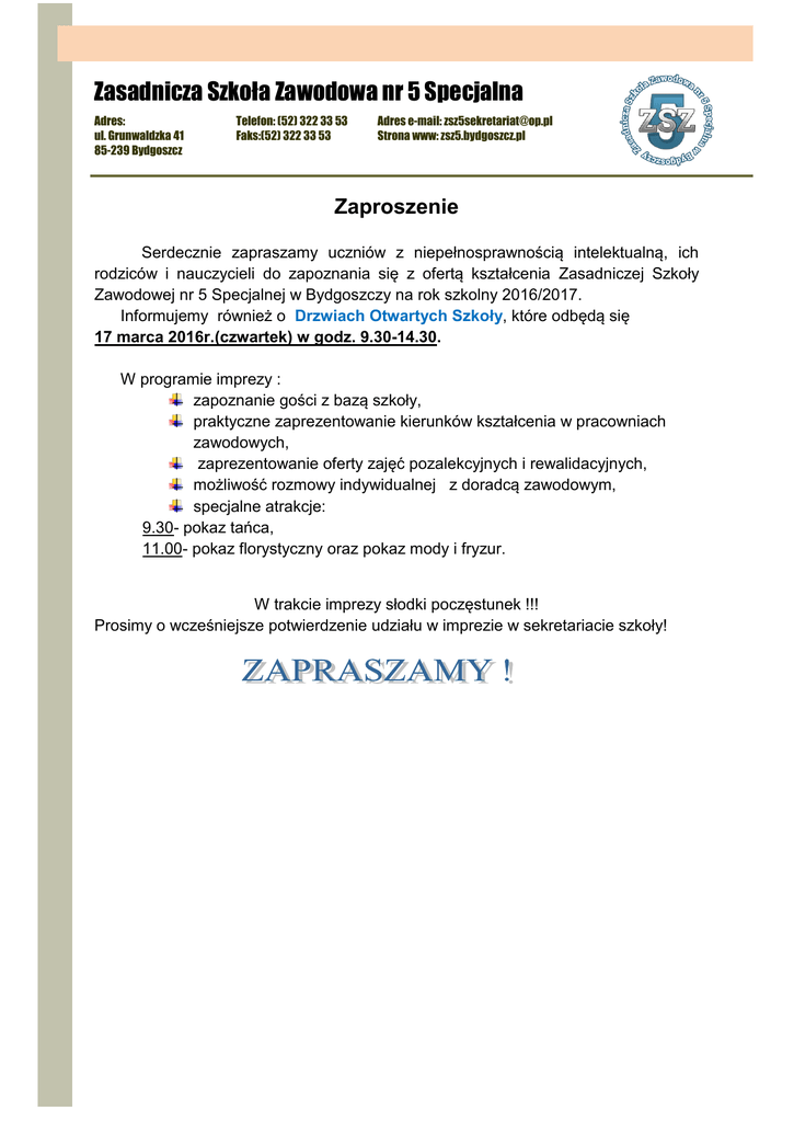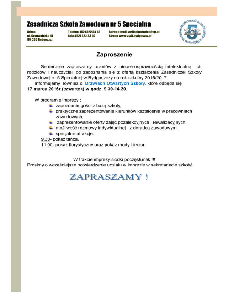 Zaproszenie do pobrania - Zasadnicza Szkoła Zawodowa nr 5
