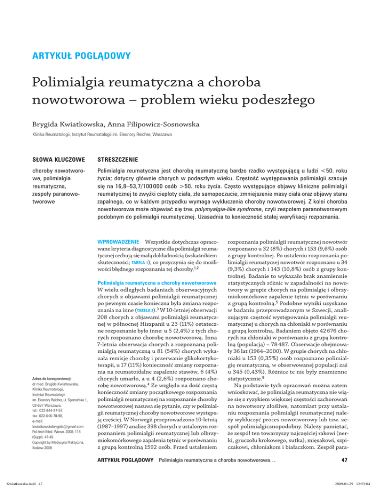 ARTYKUŁ POGLĄDOWY Polimialgia reumatyczna a choroba nowotworowa – problem wieku podeszłego Brygida Kwiatkowska, Anna Filipowicz‑Sosnowska Klinika Reumatologii, Instytut Reumatologii im. Eleonory Reicher, Warszawa SŁOWA KLUCZOWE STRESZCZENIE choroby nowotworowe, polimialgia reumatyczna, zespoły paranowotworowe Polimialgia reumatyczna jest chorobą reumatyczną bardzo rzadko występującą u ludzi <50. roku życia; dotyczy głównie chorych w podeszłym wieku. Częstość występowania polimialgii szacuje się na 16,8–53,7/100 000 osób >50. roku życia. Często występujące objawy kliniczne polimialgii reumatycznej to zwyżki ciepłoty ciała, złe samopoczucie, zmniejszenie masy ciała oraz objawy stanu zapalnego, co w każdym przypadku wymaga wykluczenia choroby nowotworowej. Z kolei choroba nowotworowa może objawiać się tzw. polymyalgia-like syndrome, czyli zespołem paranotworowym podobnym do polimialgii reumatycznej. Uzasadnia to konieczność stałej weryfikacji rozpoznania. WPROWADZENIE Wszystkie dotychczas opraco‑ wane kryteria diagnostyczne dla polimialgii reuma‑ tycznej cechują się małą dokładnością (wskaźnikiem skuteczności; TABELA 1), co przyczynia się do możli‑ wości błędnego rozpoznania tej choroby.1,2 Adres do korespondencji: dr med. Brygida Kwiatkowska, Klinika Reumatologii, Instytut Reumatologii im. Eleonory Reicher, ul. Spartańska 1, 02-637 Warszawa, tel.: 022‑844‑87‑57, fax: 022‑646‑78‑98, e‑mail: [email protected] Pol Arch Med. Wewn. 2008; 118 (Suppl): 47-49 Copyright by Medycyna Praktyczna, Kraków 2008 Polimialgia reumatyczna a choroby nowot worowe W wielu odległych badaniach obserwacyjnych chorych z objawami polimialgii reumatycznej po pewnym czasie konieczna była zmiana rozpo‑ znania na inne (TABELA 2).3 W 10‑letniej obserwacji 208 chorych z objawami polimialgii reumatycz‑ nej w północnej Hiszpanii u 23 (11%) ostatecz‑ ne rozpoznanie było inne: u 5 (2,4%) z tych cho‑ rych rozpoznano chorobę nowotworową. Inna 7‑letnia obserwacja chorych z rozpoznaną poli‑ mialgią reumatyczną u 81 (54%) chorych wyka‑ zała remisję choroby i przerwanie glikokortyko terapii, u 17 (11%) konieczność zmiany rozpozna‑ nia na reumatoidalne zapalenie stawów, 6 (4%) chorych umarło, a u 4 (2,6%) rozpoznano cho‑ robę nowotworową.4 Ze względu na dość częstą konieczność zmiany początkowego rozpoznania polimialgii reumatycznej na rozpoznanie choroby nowotworowej nasuwa się pytanie, czy w polimial‑ gii reumatycznej choroby nowotworowe występu‑ ją częściej. W Norwegii przeprowadzono 10‑letnią (1987–1997) analizę 398 chorych z ustalonym roz‑ poznaniem polimialgii reumatycznej lub olbrzy‑ miokomórkowego zapalenia tętnic w porównaniu z grupą kontrolną 1592 osób. Przed ustaleniem rozpoznania polimialgii reumatycznej nowotwór rozpoznano u 32 (8%) chorych i 153 (9,6%) osób z grupy kontrolnej. Po ustaleniu rozpoznania po‑ limialgii reumatyczej nowotwór rozpoznano u 34 (9,3%) chorych i 143 (10,8%) osób z grupy kon‑ trolnej. Badanie to wykazało brak znamiennie statystycznych różnic w zapadalności na nowo twory w grupie chorych na polimialgię i olbrzy‑ miokomórkowe zapalenie tętnic w porównaniu z grupą kontrolną.5 Podobne wyniki uzyskano w badaniu przeprowadzonym w Szwecji, anali‑ zującym częstość występowania polimialgii reu‑ matycznej u chorych na chłoniaki w porównaniu z grupą kontrolną. Badaniem objęto 42 676 cho‑ rych na chłoniaki w porównaniu z grupą kontro‑ lną (populacją) – 78 487. Obserwacje obejmowa‑ ły 36 lat (1964–2000). W grupie chorych na chło‑ niaki u 153 (0,35%) osób rozpoznano polimial‑ gię reumatyczną, w obserwowanej populacji zaś u 345 (0,43%). Różnice te nie były znamienne statystycznie.6 Na podstawie tych opracowań można zatem wnioskować, że polimialgia reumatyczna nie wią‑ że się z ryzykiem większej częstości zachorowań na nowotwory złośliwe, natomiast przy ustala‑ niu rozpoznania polimialgii reumatycznej nale‑ ży wykluczyć proces nowotworowy lub tzw. ze‑ spół polimialgicznopodobny. Należy pamiętać, że zespół ten towarzyszy najczęściej rakowi (ner‑ ki, gruczołu krokowego, sutka), mięsakowi, szpi‑ czakowi, chłoniakom i białaczkom. Zespół para ARTYKUŁ POGLĄDOWY Polimialgia reumatyczna a choroba nowotworowa… Kwiatkowska.indd 47 47 2009-01-29 12:53:04 Tabela 1 Czułość, swoistość i dokładność kryteriów diagnostycznych dla polimialgii reumatycznej Autorzy Czułość (%) Swoistość (%) Dokładność (%) Healer 42,9 100 71,5 Bird 100 60,2 80,1 Jones 48,0 100 74,0 Chuang 89,7 95,0 92,4 nowotworowy ma pewne charakterystyczne ob‑ jawy, które mogą ułatwić różnicowanie z choro‑ bą reumatyczną, w tym polimialgią reumatyczną (TABELA 3).7-9 Istnieją również istotne różnice w ob‑ razie klinicznym polimialgii reumatycznej w po‑ równaniu z chorobą nowotworową, mogące uła‑ twić ustalenie prawidłowego rozpoznania na po‑ czątku choroby (TABELA 4 ).10 PIŚMIENNICTWO Tabela 2 Rozpoznania ostateczne u 50 chorych z bólem i sztywnością mięśni proksymalnych, spełniających kryteria Birda dla polimialgii reumatycznej Rozpoznanie Liczba chorych Liczba chorych spełniająca kryteria Birda polimialgia reumatyczna 40 38 bez zapalenia stawów 31 30 z zapaleniem stawów 9 8 zapalenie tętnicy skroniowej 2 2 kolagenoza 1 1 koksartroza 1 1 zespół bolesnego barku 1 1 choroba nowotworowa 5 5 rak gruczołu krokowego 1 1 przerzuty do wątroby z nieznanego ogniska pierwotnego 1 1 mielodysplazja 2 2 1 1 chłoniak 1 Chuang T, Hunter GG, Ilstrup DM, et al. Polymyalgia rheumatica. A 10 year epidemiologic and clinical study. Ann Intern Med. 1982; 97: 672. 2 Nobunaga M, Yoshioka K, Yasuda M, et al. Clinical studies of polymyalgia rheumatica. A proposal of diagnostic criteria. Jpn J Med. 1989; 4: 452‑456. 3 Bahlas S, Ramos‑Remus C, Davis P. Clinical outco
