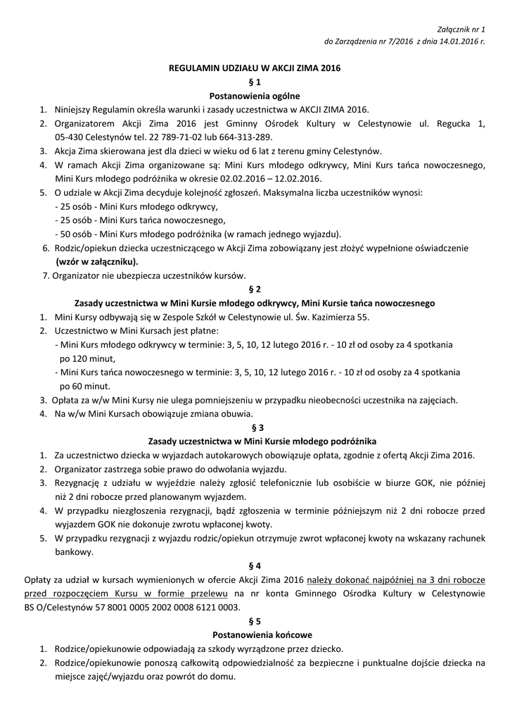 Załącznik nr 1 do Zarządzenia nr 7/2016 z dnia 14.01.2016 r. REGULAMIN UDZIAŁU W AKCJI ZIMA 2016 §1 Postanowienia ogólne 1. Niniejszy Regulamin określa warunki i zasady uczestnictwa w AKCJI ZIMA 2016. 2. Organizatorem Akcji Zima 2016 jest Gminny Ośrodek Kultury w Celestynowie ul. Regucka 1, 05-430 Celestynów tel. 22 789-71-02 lub 664-313-289. 3. Akcja Zima skierowana jest dla dzieci w wieku od 6 lat z terenu gminy Celestynów. 4. W ramach Akcji Zima organizowane są: Mini Kurs młodego odkrywcy, Mini Kurs tańca nowoczesnego, Mini Kurs młodego podróżnika w okresie 02.02.2016 – 12.02.2016. 5. O udziale w Akcji Zima decyduje kolejność zgłoszeń. Maksymalna liczba uczestników wynosi: - 25 osób - Mini Kurs młodego odkrywcy, - 25 osób - Mini Kurs tańca nowoczesnego, - 50 osób - Mini Kurs młodego podróżnika (w ramach jednego wyjazdu). 6. Rodzic/opiekun dziecka uczestniczącego w Akcji Zima zobowiązany jest złożyć wypełnione oświadczenie (wzór w załączniku). 7. Organizator nie ubezpiecza uczestników kursów. §2 Zasady uczestnictwa w Mini Kursie młodego odkrywcy, Mini Kursie tańca nowoczesnego 1. Mini Kursy odbywają się w Zespole Szkół w Celestynowie ul. Św. Kazimierza 55. 2. Uczestnictwo w Mini Kursach jest płatne: - Mini Kurs młodego odkrywcy w terminie: 3, 5, 10, 12 lutego 2016 r. - 10 zł od osoby za 4 spotkania po 120 minut, - Mini Kurs tańca nowoczesnego w terminie: 3, 5, 10, 12 lutego 2016 r. - 10 zł od osoby za 4 spotkania po 60 minut. 3. Opłata za w/w Mini Kursy nie ulega pomniejszeniu w przypadku nieobecności uczestnika na zajęciach. 4. Na w/w Mini Kursach obowiązuje zmiana obuwia. §3 Zasady uczestnictwa w Mini Kursie młodego podróżnika 1. Za uczestnictwo dziecka w wyjazdach autokarowych obowiązuje opłata, zgodnie z ofertą Akcji Zima 2016. 2. Organizator zastrzega sobie prawo do odwołania wyjazdu. 3. Rezygnację z udziału w wyjeździe należy zgłosić telefonicznie lub osobiście w biurze GOK, nie później niż 2 dni robocze przed planowanym wyjazdem. 4. W przypadku niezgłoszenia rezygnacji, bądź zgłoszenia w terminie późniejszym niż 2 dni robocze przed wyjazdem GOK nie dokonuje zwrotu wpłaconej kwoty. 5. W przypadku rezygnacji z wyjazdu rodzic/opiekun otrzymuje zwrot wpłaconej kwoty na wskazany rachunek bankowy. §4 Opłaty za udział w kursach wymienionych w ofercie Akcji Zima 2016 należy dokonać najpóźniej na 3 dni robocze przed rozpoczęciem Kursu w formie przelewu na nr konta Gminnego Ośrodka Kultury w Celestynowie BS O/Celestynów 57 8001 0005 2002 0008 6121 0003. §5 Postanowienia końcowe 1. Rodzice/opiekunowie odpowiadają za szkody wyrządzone przez dziecko. 2. Rodzice/opiekunowie ponoszą całkowitą odpowiedzialność za bezpieczne i punktualne dojście dziecka na miejsce zajęć/wyjazdu oraz powrót do domu.