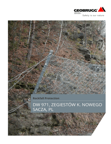 Rockfall Protection DW 971, ZEGIESTÓW K. NOWEGO SACZA, PL DW 971, ZEGIESTÓW K. NOWEGO SACZA Rockfall Protection Project Place Country/Region DW 971, Zegiestów k. Nowego Sacza Province road No. 971, Żegiestów City Poland Year of installation 2006 Customer Engineering Contractor Małopolska Province Road Department ZSRW Jacek Bosak, Geobrugg ZSRW Jacek Bosak, Geobrugg Protected object Systems Road RXI-025 Corrosion protection Galvanized System height System length 3.0 m 80 m For questions please contact our Geobrugg specialist at your side: Alexander Bittendorfer Project Manager Bavaria Phone +41 71 466 84 29 Mobile +41 78 601 06 14 [email protected] Geobrugg AG Aachstrasse 11 | 8590 Romanshorn | Switzerland [email protected] | www.geobrugg.com A company of the BRUGG Group | Certified to ISO 9001 Rockfall Protection | DW 971, Zegiestów k. Nowego Sacza, PL 2/2