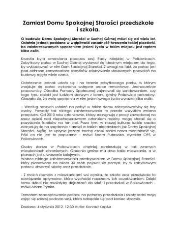 Zamiast Domu Spokojnej Starości przedszkole i szkoła. O budowie Domu Spokojnej Starości w Suchej Górnej mówi się od wielu lat. Ostatnio jednak poddano w wątpliwość zasadność tworzenia takiej placówki, bo zainteresowanych spędzeniem jesieni życia w takim miejscu jest raptem kilka osób. Kwestia była omawiana podczas sesji Rady Miejskiej w Polkowicach. Zabytkowy pałac w Suchej Górnej wydawał się idealnym miejscem do tego, by wybudować w nim Dom Spokojnej Starości. Z uwagi na fakt, że pałac jest pod ochroną konserwatora zabytków zdobywanie stosownych pozwoleń na budowę zajęło wiele czasu. Ostatecznie jednak udało się i na terenie zabytkowego parku, w którym znajduje się pałac wykonano wstępne prace remontowe. Jednocześnie pracownicy Ośrodka Pomocy Społecznej zajmowali się sondowaniem, czy tego typu obiekt jest ludziom starszym z terenu gminy Polkowice potrzebny. Okazało się, że wolę spędzenia w nim jesieni swego życia wyraziło kilka osób. – Według naszych ustaleń na pobyt w takim domu zdecydowałyby się trzy osoby. Powody tak nikłego zainteresowania to przede wszystkim zmiana przepisów. Od 2010 roku członkowie, którzy zrezygnują z pracy zawodowej na rzecz opieki nad niepełnosprawnym członkiem rodziny mogą starać się o pozyskanie środków na ten cel. Poza tym, w naszej kulturze ludzie rzadko decydują się na spędzanie starości w takich placówkach jak Domy Spokojnej Starości. Myślę, że upłynie jeszcze trochę czasu zanim nasza mentalność się. Póki co nie jest to popularne – mówi Beata Puławska, dyrektor OPS w Polkowicach. Osoby starsze w Polkowicach chętniej zamieszkują w tak zwanych mieszkaniach chronionych. Obecnie gmina ma dwa takie mieszkania, a w planach jest utworzenie kolejnych. Wobec nikłego zainteresowania przebywaniem w Domu Spokojnej Starości, który planowano na około 30 osób pojawił się pomysł, by w zabytkowym pałacu utworzyć szkołę oraz przedszkole. - Z moich rozmów z mieszkańcami wsi wynika, że szkoła oraz przedszkole to rozwiązanie optymalne, które wychodzi naprzeciw ich oczekiwaniom. Dzięki temu dzieci nie musiałyby dojeżdżać do szkół i przedszkoli w Polkowicach – mówi Adam Trybka. Tematem zaadoptowania pałacu na potrzeby przedszkola i szkoły radni mają zając się szerzej podczas sesji, która odbędzie się pod koniec stycznia. Dodano: 4 stycznia 2012, 12:30 Autor: Konrad Kaptur