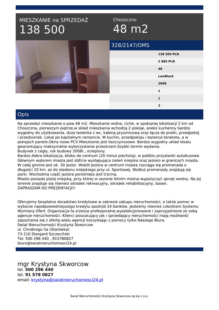 MIESZKANIE na SPRZEDAŻ 138 500 Choszczno 48 m2 328/2147/OMS 138 500 PLN 2 885 PLN 48 LowBlock 2008 1 1 2 Opis Na sprzedaż mieszkanie o pow.48 m2. Mieszkanie widne, ciche, w spokojnej lokalizacji 2 km od Choszczna, pierwszym piętrze,w skład mieszkania wchodzą 2 pokoje, aneks kuchenny bardzo wygodny do użytkowania, duża łazienka z wc, kabiną prysznicową oraz łącza do pralki, przedpokój i przedsionek. Lokal po kapitalnym remoncie. W kuchni, przedpokoju i łazience terakota, a w pokojach panele.Okna nowe PCV.Mieszkanie jest bezczynszowe. Bardzo wygodny układ lokalu gwarantujący maksymalne wykorzystanie przestrzeni.Szybki termin wydania. Budynek z cegły, rok budowy 2008r., ocieplony. Bardzo dobra lokalizacja, blisko do centrum (20 minut piechotą), w pobliżu przystanki autobusowe. Głównym walorem miasta jest obficie występująca zieleń miejska oraz jezioro w granicach miasta. W całej gminie jest ok. 30 jezior. Wokół jeziora w centrum miasta rozciąga się promenada o długości 10 km. aż do stadionu miejskiego przy ul. Sportowej. Wzdłuż promenady znajdują się parki. Wschodnia część jeziora porośnięta jest trzciną. Miasto posiada plażę miejską, przy której w sezonie letnim można wypożyczyć sprzęt wodny. Na jej terenie znajduje się również ośrodek rekreacyjny, ośrodek rehabilitacyjny, basen. ZAPRASZAM DO PREZENTACJI!! Oferujemy bezpłatne doradztwo kredytowe w zakresie zakupu nieruchomości, a także pomoc w wyborze najodpowiedniejszego kredytu spośród 24 banków. Jesteśmy również członkiem Systemu Wymiany Ofert. Organizacja ta zrzesza profesjonalne,wyselekcjonowane i zaprzyjaźnione ze sobą agencje nieruchomości. Klienci poszukujący jak i sprzedający nieruchomości mają możliwość zapoznania się z ofertą wielu agencji korzystając z pomocy tylko Naszego Biura. Świat Nieruchomości Krystyna Skworcow ul. Chrobrego 5a (Starówka) 73-110 Stargard Szczeciński Tel: 500 296 440 , 915780827 [email protected] mgr Krystyna Skworcow tel. 500 296 440 tel. 91 578 0827 email: [email protected] Świat Nieruchomości Krystyna Skworcow sp-ka z o.o. Świat Nieruchomości Krystyna Skworcow sp-ka z o.o. Powered by TCPDF (www.tcpdf.org)