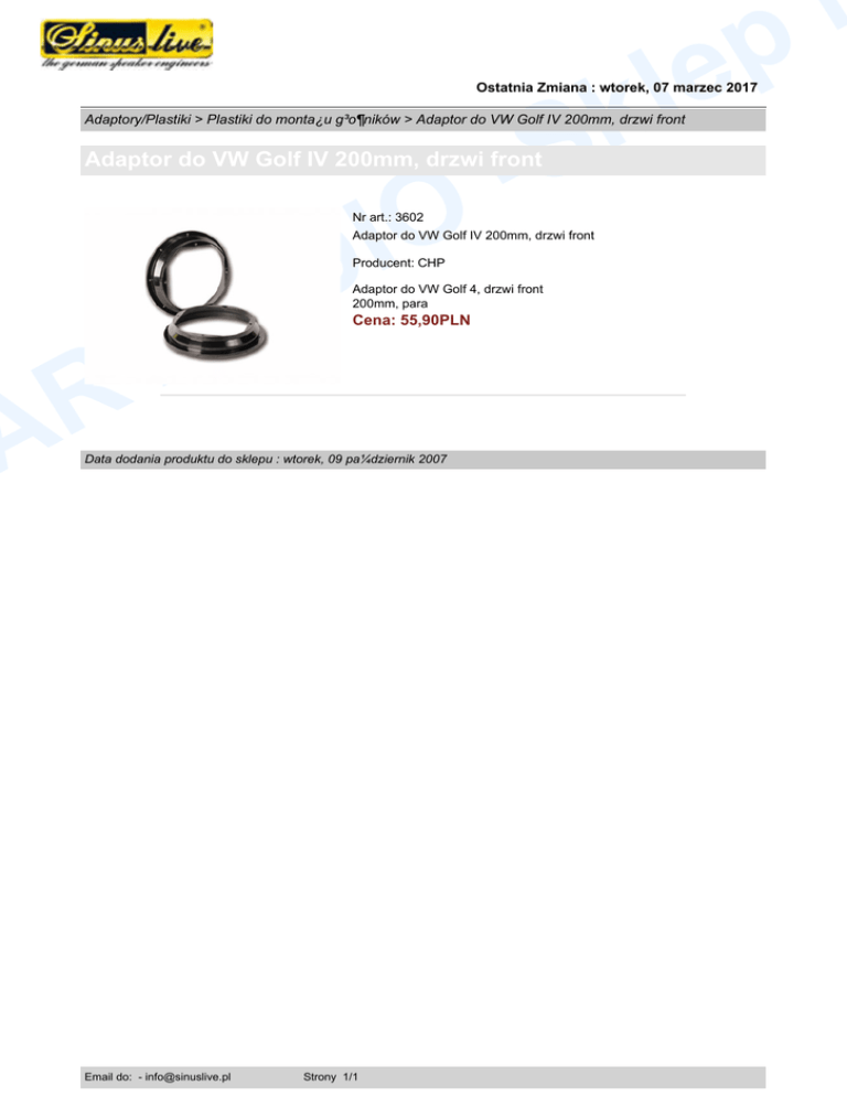 e l k -S i p Ostatnia Zmiana : wtorek, 07 marzec 2017 Adaptory/Plastiki > Plastiki do monta¿u g³o¶ników > Adaptor do VW Golf IV 200mm, drzwi front Adaptor do VW Golf IV 200mm, drzwi front O I D Nr art.: 3602 Adaptor do VW Golf IV 200mm, drzwi front Producent: CHP A U A R Adaptor do VW Golf 4, drzwi front 200mm, para Cena: 55,90PLN Data dodania produktu do sklepu : wtorek, 09 pa¼dziernik 2007 Email do: - [email protected] Strony 1/1