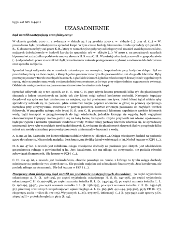 Sygn. akt XIV K 44/12 UZASADNIENIE Sąd ustalił następujący stan faktyczny: W okresie grudnia 2010 r., a zwłaszcza w dniach 23 i 24 grudnia 2010 r. w sklepie (...) przy ul. (...) w W. prowadzona była przedświąteczna sprzedaż karpi. W tym czasie funkcję kierownika działu sprzedaży ryb pełnił A. R.. K. dostarczane były zaś przez K. R., który w ramach tej współpracy oddelegowywał również swoich pracowników, mających doświadczenie w hodowli karpia do sprzedaży ryb w sklepie (...). W 2010 r. na powyższych zasadach hipermarket zatrudnił na podstawie umowy zlecenia H. S. oraz C. H.. Wcześniej oskarżeni pracowali w gospodarstwie (...) odpowiednio przez 10 oraz 8 lat i byli przeszkoleni w zakresie postępowania z rybami, a zwłaszcza ich dobrostanu oraz sposobu zabijania. Sprzedaż karpi odbywała się w namiocie ustawionym na zewnątrz, bezpośrednio przy budynku sklepu. Był on przedzielony ladą na dwie części, z których jedna przeznaczona była dla pracowników, zaś druga dla klientów. Ryby przetrzymywano w trzech szczelnych basenach, o gładkich ścianach i gładko zakończonych krawędziach wypełnionych czystą, stale napowietrzaną wodą o odpowiedniej temperaturze, a do tego przy odpowiednim zagęszczeniu zwierząt. Oddzielnie umiejscowiono za parawanem stanowisko do uśmiercania karpi. Sprzedaż odbywała się w ten sposób, że H. S. oraz C. H. przy użyciu kasara przenosili kilka ryb do plastikowych skrzynek z lodem ustawionych na ladzie tak aby klient mógł wybrać konkretne osobniki. Następnie kupujący decydował czy ryba ma być uśmiercona na miejscu, czy też przekazana mu żywa. Jeżeli klient żądał zabicia ryby sprzedawcy udawali się za parawan, gdzie uśmiercali karpie poprzez uderzenie w głowę za pomocą specjalnego narzędzia przy utrzymywaniu zwierzęcia w pozycji pionowej. Martwe zwierzęta pakowano do zwykłych torebek foliowych. W przypadku zakupu ryby żywej H. S. oraz C. H. proponowali klientom napełnianie worków foliowych wodą, bądź transport w przygotowanych do tego wiaderkach, jednakże kierując się wygodą, bądź względami ekonomicznymi kupujący rzadko godzili się na taką formę transportu. Często przynosili oni własne opakowania, bądź po wyjściu z namiotu opróżniali wiaderka z wody. Wobec takiej postawy klientów zdarzało się, że sprzedawcy umieszczali żywe ryby w zwykłych torebkach foliowych. K. wyłożone do plastikowych skrzynek i które po upływie kilku minut nie zostały sprzedane pracownicy ponownie umieszczali w basenach z wodą. A. R. ma 49 lat. Z zawodu jest kierownikiem na dziale rybnym w sklepie (...). Osiąga miesięczny dochód na poziomie 2200 złotych netto. Nie posiada majątku. Jest żonaty, ma dwójkę dzieci w wieku 22 i 17 lat. Nie był leczony w PZP i (...). H. S. ma 47 lat. Z zawodu jest rolnikiem, osiąga miesięczne dochody na poziomie 500 złotych, jest właścicielem gospodarstwa rolnego o powierzchni 3 ha. Jest kawalerem, nie ma nikogo na utrzymaniu, nie posiada również zobowiązań finansowych. Nie leczony w PZP i (...). C. H. ma 49 lat, z zawodu jest budowlańcem, obecnie pozostaje na rencie, z którego to tytułu osiąga dochody miesięczne na poziomie 700 złotych netto. Nie posiada majątku ani zobowiązań finansowych. Jest kawalerem, nie posiada nikogo na utrzymaniu. Nie był leczony w PZP i (...). Powyższy stan faktyczny Sąd ustalił na podstawie następujących dowodów: po części wyjaśnienia oskarżonego A. R. (k. 128-129), po części wyjaśnienia oskarżonego H. S. (k. 157-158), po części wyjaśnienia oskarżonego C. H. (k.197-198), po części zeznania świadka R. L. (k. 243-245, 6), po części zeznania świadka L. L. (k. 198-199, 55-56), po części zeznania świadka S. L. (k. 258-259), po części zeznania świadka K. R. (k. 245-248, 52), pisemnej oraz ustnych uzupełniających opinii biegłego A. L. (k. 365-368, 441-444, 305-316), płyty CD (k. 27), ekspertyzy audio – video (k. 171-175), Wytycznych (...) (k. 273-276), informacji (...) (k. 353-359), z akt sprawy 3 Ds. 2640/11/II – protokołu oględzin płyty (k. 15). Oskarżony A. R. przesłuchiwany na rozprawie przed Sądem nie przyznał się do popełnienia zarzucanych mu czynów. Wyjaśnił, że na stoisku przeznaczonym do sprzedaży karpi w sklepie (...) znajdowały się 3 baseny ze stale napowietrzaną wodą, w których przetrzymywane były ryby. Za basenami znajdowało się natomiast oddzielone parawanem stanowisko do ich uśmiercania. Oskarżony podał, że bezpośrednio przed sprzedażą karpie wyławiano z basenu i przekładano do plastikowych skrzynek umieszczonych bez wody tak aby klient mógł wybrać osobnika, którego chce nabyć. Ryby, które nie zostały sprzedane po około 5 minutach trafiały do innego basenu niż ten, z którego były wyławiane. Taka praktyka pozwalała uniknąć sytuacji, w której ten sam karp był wyławiany ponownie. Oskarżony stwierdził, że żywe ryby sprzedawane były najczęściej w reklamówkach, do których wkładano siatkę umożliwiającą im oddychanie przez skórę. Z tych względów nie wlewano do nich już wody. Nie były również zawiązywane. Dodał, że wprawdzie sklep posiadał wiaderka z wodą, jednakże klienci nie chcieli korzystać z tej formy transportu. Zdarzało się bowiem, iż niezwłocznie po wyjściu z namiotu kupujący wylewali ją, gdyż wiaderka były zbyt ciężkie. Ryby uśmiercone sprzedawane były w ocenie oskarżonego w zwykłych, zawiązanych workach foliowych. A. R. wskazał również, że co roku sklep nabywał karpie od tego samego dostawcy, który przysyłał pracowników odpowiednio przygotowanych do uśmiercania i sprzedaży ryb. Zdaniem oskarżonego sprzedaż odbywała się sprawnie, pomimo iż ruch w okresie świąt Bożego Narodzenia był duży. Jego zdaniem na stanowisku zawsze musiało znajdować się dwóch pracowników. H. S. również nie przyznał się do popełnienia zarzucanego mu czynu. Oskarżon