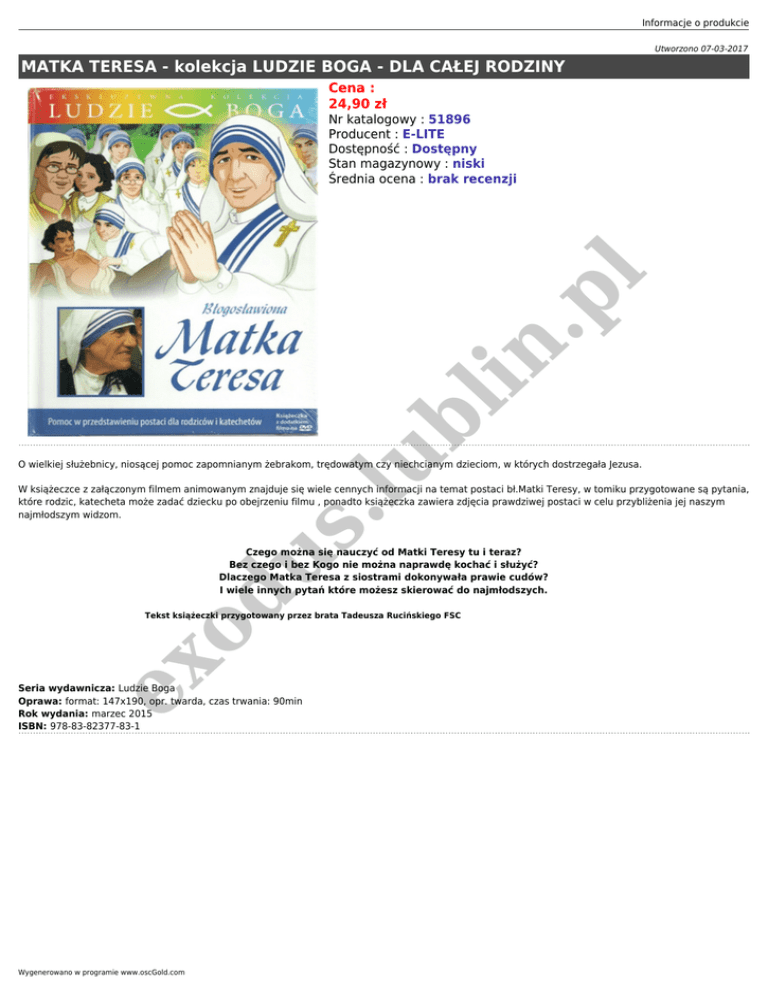 Informacje o produkcie Utworzono 07-03-2017 MATKA TERESA - kolekcja LUDZIE BOGA - DLA CAŁEJ RODZINY Cena : 24,90 zł .lu bl in .p l Nr katalogowy : 51896 Producent : E-LITE Dostępność : Dostępny Stan magazynowy : niski Średnia ocena : brak recenzji O wielkiej służebnicy, niosącej pomoc zapomnianym żebrakom, trędowatym czy niechcianym dzieciom, w których dostrzegała Jezusa. od us W książeczce z załączonym filmem animowanym znajduje się wiele cennych informacji na temat postaci bł.Matki Teresy, w tomiku przygotowane są pytania, które rodzic, katecheta może zadać dziecku po obejrzeniu filmu , ponadto książeczka zawiera zdjęcia prawdziwej postaci w celu przybliżenia jej naszym najmłodszym widzom. Czego można się nauczyć od Matki Teresy tu i teraz? Bez czego i bez Kogo nie można naprawdę kochać i służyć? Dlaczego Matka Teresa z siostrami dokonywała prawie cudów? I wiele innych pytań które możesz skierować do najmłodszych. ex Tekst książeczki przygotowany przez brata Tadeusza Rucińskiego FSC Seria wydawnicza: Ludzie Boga Oprawa: format: 147x190, opr. twarda, czas trwania: 90min Rok wydania: marzec 2015 ISBN: 978-83-82377-83-1 Wygenerowano w programie www.oscGold.com