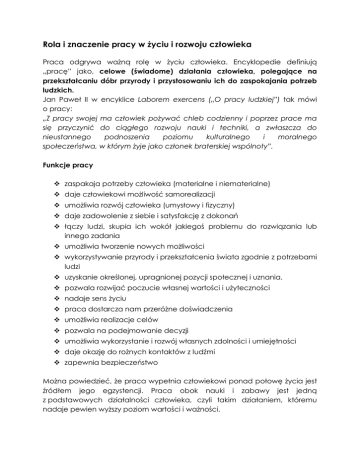 Rola i znaczenie pracy w życiu i rozwoju człowieka Praca odgrywa ważną rolę w życiu człowieka. Encyklopedie definiują „pracę” jako, celowe (świadome) działania człowieka, polegające na przekształcaniu dóbr przyrody i przystosowaniu ich do zaspokajania potrzeb ludzkich. Jan Paweł II w encyklice Laborem exercens („O pracy ludzkiej”) tak mówi o pracy: „Z pracy swojej ma człowiek pożywać chleb codzienny i poprzez prace ma się przyczynić do ciągłego rozwoju nauki i techniki, a zwłaszcza do nieustannego podnoszenia poziomu kulturalnego i moralnego społeczeństwa, w którym żyje jako członek braterskiej wspólnoty”. Funkcje pracy zaspakaja potrzeby człowieka (materialne i niematerialne) daje człowiekowi możliwość samorealizacji umożliwia rozwój człowieka (umysłowy i fizyczny) daje zadowolenie z siebie i satysfakcję z dokonań łączy ludzi, skupia ich wokół jakiegoś problemu do rozwiązania lub innego zadania umożliwia tworzenie nowych możliwości wykorzystywanie przyrody i przekształcenia świata zgodnie z potrzebami ludzi uzyskanie określonej, upragnionej pozycji społecznej i uznania. pozwala rozwijać poczucie własnej wartości i użyteczności nadaje sens życiu praca dostarcza nam przeróżne doświadczenia umożliwia realizacje celów pozwala na podejmowanie decyzji umożliwia wykorzystanie i rozwój własnych zdolności i umiejętności daje okazję do rożnych kontaktów z ludźmi zapewnia bezpieczeństwo Można powiedzieć, że praca wypełnia człowiekowi ponad połowę życia jest źródłem jego egzystencji. Praca obok nauki i zabawy jest jedną z podstawowych działalności człowieka, czyli takim działaniem, któremu nadaje pewien wyższy poziom wartości i ważności. Pracę można traktować jako powołanie, źródło zarobkowania i szansę samorealizacji. Dzięki pracy powstają dobra materialne, tworzone są też wartości kulturowe i społecznie znaczące usługi. Dzisiaj stojąc u progu nowego wieku wiemy, że rola pracy w życiu każdego człowieka jest ogromna, jest to wyznacznik miejsca człowieka w społeczeństwie. Praca dostarcza nam przeżyć estetycznych, przynosi zadowolenie i radość, niekiedy stanowi źródło trudności i zmartwień, a często wprowadza w stan niezadowolenia, zniechęcenia a nawet frustracji.