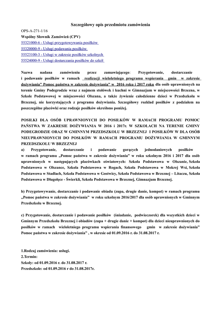Szczegółowy opis przedmiotu zamówienia OPS-A-271-1/16 Wspólny Słownik Zamówień (CPV) 55321000-6 - Usługi przygotowywania posiłków 55320000-9 - Usługi podawania posiłków 55523100-3 - Usługi w zakresie posiłków szkolnych 55524000-9 - Usługi dostarczania posiłków do szkół Nazwa nadana zamówieniu i podawanie posiłków w ramach przez zamawiającego: Przygotowanie, realizacji wieloletniego programu wspierania dostarczanie gmin w zakresie dożywiania” Pomoc państwa w zakresie dożywiania” w 2016 roku i 2017 roku dla osób uprawnionych na terenie Gminy Podegrodzie wraz z najmem stołówek i kuchni w Gimnazjum w miejscowości Brzezna, w Szkole Podstawowej w miejscowości Olszana, a także żywienie całodzienne dzieci w Przedszkolu w Brzeznej, nie korzystających z programu dożywiania. Szczegółowy rozkład posiłków z podziałem na poszczególne placówki oraz rodzaje posiłków określono poniżej. POSIŁKI DLA OSÓB UPRAWNIONYCH DO POSIŁKÓW W RAMACH PROGRAMU POMOC PAŃSTWA W ZAKRESIE DOŻYWIANIA W 2016 i 2017r. W SZKOŁACH NA TERENIE GMINY PODEGRODZIE ORAZ W GMINNYM PRZEDSZKOLU W BRZEZNEJ I POSIŁKÓW W DLA OSÓB NIEUPRAWNIONYCH DO POSŁKÓW W RAMACH PROGRAMU DOŻYWIANIA W GMINNYM PRZEDSZKOLU W BRZEZNEJ a) Przygotowanie, dostarczanie i podawanie gorących jednodaniowych posiłków w ramach programu „Pomoc państwa w zakresie dożywiania” w roku szkolnym 2016 i 2017 dla osób uprawnionych w następujących placówkach oświatowych: Szkoła Podstawowa w Olszanie, Szkoła Podstawowa w Olszance, Szkoła Podstawowa w Rogach, Szkoła Podstawowa w Mokrej Wsi, Szkoła Podstawowa w Stadłach, Szkoła Podstawowa w Gostwicy, Szkoła Podstawowa w Brzeznej – Litaczu, Szkoła Podstawowa w Długołęce - Świerkli, Szkoła Podstawowa w Brzeznej, Gimnazjum Brzeznej. b) Przygotowywanie, dostarczanie i podawanie obiadu (zupa, drugie danie, kompot) w ramach programu „Pomoc państwa w zakresie dożywiania” w roku szkolnym 2016/2017 dla osób uprawnionych w Gminnym Przedszkolu w Brzeznej. c) Przygotowanie, dostarczanie i podawanie posiłków (śniadanie, podwieczorek) dla wszystkich dzieci w Gminnym Przedszkolu Brzeznej i obiadów (zupa + drugie danie + kompot) dla dzieci nieuprawnionych do posiłków w ramach wieloletniego programu wspierania finansowego gmin w zakresie dożywiania” Pomoc państwa w zakresie dożywiania” , w okresie od 01.09.2016 r. do 31.08.2017 r. 1.Rodzaj zamówienia: usługi. 2.Termin: Szkoły: od 01.09.2016 r. do 31.08.2017 r. Przedszkole: od 01.09.2016 r do 31.08.2017r. 3.Opis przedmiotu oraz wielkości lub zakresu zamówienia: POSIŁKI DLA OSÓB UPRAWNIONYCH DO POSIŁKÓW W RAMACH PROGRAMU „POMOC PAŃSTWA W ZAKRESIE DOŻYWIANIA” W 2016 / 2017 ROKU W SZKOŁACH NA TERENIE GMINY PODEGRODZIE ORAZ W GMINNYM PRZEDSZKOLU W BRZEZNEJ I POSIŁKÓW W DLA OSÓB NIEUPRAWNIONYCH DO POSŁKÓW W RAMACH PROGRAMU DOŻYWIANIA W GMINNYM PRZEDSZKOLU W BRZEZNEJ. Przygotowanie dostarczanie i podawanie posiłków w ramach realizacji wieloletniego programu wspierania gmin w zakresie dożywiania „Pomoc państwa w zakresie dożywiania” w roku szkolnym 2016 i 2017 w następujących placówkach ( szacunkowa liczba dzieci uprawnionych w poszczególnych placówkach): Część I a) a') Szkoła Podstawowa w Olszanie – 32 osoby b') Szkoła Podstawowa w Olszance – 23 osoby, c') Szkoła Podstawowa w Rogach – 24 osoby, d') Szkoła Podstawowa w Mokrej Wsi – 18 osób, e') Szkoła Podstawowa w Stadłach – 6 osób, f') Szkoła Podstawowa w Gostwicy – 5 osób, g') Szkoła Podstawowa w Brzeznej - Litaczu – 20 osób, h') Szkoła Podstawowa w Długołęce Świerkli – 7 osób, i') Szkoła Podstawowa w Brzeznej – 13 osób, j') Gimnazjum Brzezna – 22 osób, Część I b: Gminne Przedszkole w Brzeznej: 5 osób. Część I c: Gminne Przedszkole w Brzeznej (nieuprawnione do dożywiania): 43 osoby. Przewidywana liczba osób w tej części zamówienia objętych programem dożywiania to około 175 osób, poza programem 43 osoby. WYMAGANIA DOTYCZĄCE POSIŁKÓW: Część I a) 1. W szkołach (Szkoła Podstawowa w Olszanie, Szkoła Podstawowa w Olszance, Szkoła Podstawowa w Rogach, Szkoła Podstawowa w Mokrej Wsi, Szkoła Podstawowa w Stadłach, Szkoła Podstawowa w Gostwicy, Szkoła Podstawowa w Długołęce Świerkli, Szkoła Podstawowa w Brzeznej – Litaczu, Szkoła Podstawowa w Brzeznej, Gimnazjum w Brzeznej) wykonawca zobowiązany będzie przygotowywać, dostarczyć i podać dla osób uprawnionych w ramach dożywiania posiłek jednodaniowy. Wymagania dotyczące posiłku jednodaniowego dla osób uprawnionych w szkołach – ilość, rodzaj i gramatura: 1.1 2 razy w tygodniu drugie danie z kompotem , 3 razy w tygodniu zupa + kompot. Jedna porcja zupy powinna mieć objętość 400 ml + kromka chleba 100 g lub bułka. Drugie danie o gramaturze nie mniejszej niż 400 gramów: - ziemniaki lub zamiennik (ryż, kasza, makaron lub inne) - 200g , - mięso 100g - dania mięsne powinny zawierać sztukę mięsa na osobę. Podawane mięso nie może być tłuste i przerośnięte (stek z kurczaka, kotlet mielony, udziec z kurczaka, kotlet schabowy, bitki wołowe, gulasz, ryba, filet z kurczaka lub indyka). Nie dopuszcza się podawania parówek o zawartości mięsa poniżej 70% produktów z glutaminianem sodu. 1.2 - surówka 100g, 1.3 - kompot – 250 ml. 1.4 Drugie danie raz na 2 tygodnie mogą stanowić: pierogi, naleśniki, placki ziemniaczane, kopytka, krokiety, gołąbki o wadze 400g. 1.5 Drugim daniem nie może być kiszka, wątróbka lub inne podroby oraz ryż ze słodkim dodatkiem (z sosem lub galaretką), 1.6 Posiłki muszą być dostarczane zgodnie z przedstawionym jadłospisem na dany dzień. 1.7 Posiłki muszą posiadać wymaganą przepisami kaloryczność i muszą być sporządzane zgodnie z wymogami sztuki kulinarnej. Zamawiający wymaga aby surowcowy uśredniony tzw. Wsad do kotła umożliwiający wyprodukowanie 1 porcji gorącego posiłku o charakterze obiadu jednod