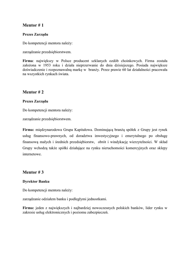 Mentor # 1 Prezes Zarządu Do kompetencji mentora należy: zarządzanie przedsiębiorstwem. Firma: największy w Polsce producent szklanych ozdób choinkowych. Firma została założona w 1953 roku i działa nieprzerwanie do dnia dzisiejszego. Posiada największe doświadczenie i rozpoznawalną markę w branży. Przez prawie 60 lat działalności pracowała na wszystkich rynkach świata. Mentor # 2 Prezes Zarządu Do kompetencji mentora należy: zarządzanie przedsiębiorstwem. Firma: międzynarodowa Grupa Kapitałowa. Dominującą branżą spółek z Grupy jest rynek usług finansowo-prawnych, od doradztwa inwestycyjnego i emerytalnego po obsługę finansową małych i średnich przedsiębiorstw, obrót i windykację wierzytelności. W skład Grupy wchodzą także spółki działające na rynku nieruchomości komercyjnych oraz sklepy internetowe. Mentor # 3 Dyrektor Banku Do kompetencji mentora należy: zarządzanie odziałem banku i podległymi jednostkami. Firma: jeden z największych i najbardziej nowoczesnych polskich banków, lider rynku w zakresie usług elektronicznych i poziomu zabezpieczeń. Mentor # 4 Pedagog, logopeda, doradca zawodowy Do kompetencji mentora należy: Prowadzenie indywidualnego i grupowego poradnictwa zawodowego, realizacja zadań w ramach projektów współfinansowanych ze środków UE. Firma: Instytucja Rynku Pracy. Mentor # 5 Psycholog, doradca zawodowy Do kompetencji mentora należy: Prowadzenie indywidualnego i grupowego poradnictwa zawodowego, realizacja zadań w ramach projektów współfinansowanych ze środków UE. Firma: Instytucja Rynku Pracy. Mentor # 6 Dyrektor placówki medycznej Do kompetencji mentora należy: Zarządzanie placówką medyczną. Firma: Placówka medyczna Mentor # 7 Doradca zawodowy Do kompetencji mentora należy Prowadzenie indywidualnego i grupowego poradnictwa zawodowego. Wieloletni dyrektor placówki. Firma – Poradnia Psychologiczno-Pedagogiczna Mentor # 8 Trener rozwoju osobistego Do kompetencji mentora należy Prowadzenie firmy zajmującej się szkoleniami interpersonalnymi, animacją społeczną oraz pozyskiwaniem funduszy zewnętrznych. Aktywny członek wielu stowarzyszeń, fundacji i organizacji pozarządowych. Firma – Legnickie Centrum Wolontariatu Mentor # 9 Pełnomocnik zarządu Do kompetencji mentora należy Koordynacja działalności w zakresie ochrony przyrody i edukacji ekologicznej na obszarze woj. Dolnośląskiego. Firma – Wojewódzki Fundusz Ochrony Środowiska