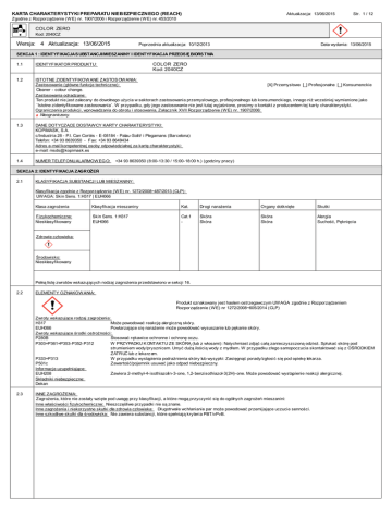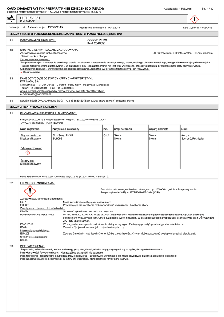 KARTA CHARAKTERYSTYKI PREPARATU NIEB EZPIECZN EGO (REACH) Aktualizacja: 13/06/2015 Str. 1 / 12 Zgodnie z Rozporządzenie (W E) nr. 1907/2006 i Rozporządzenie (W E) nr. 453/2010 COLOR ZERO Kod: 2040CZ Wersja: 4 Aktualizacja: 13/06/2015 Poprzednia aktualizacja: 10/12/2013 Data wydania: 13/06/2015 SEKCJA 1 : IDENTYFIKACJA S UBSTANCJI/MIESZANINY I IDENTYFIKACJA PRZEDS IĘ BIORS TWA COLOR ZERO Kod: 2040CZ 1.1 IDENTYFIKATOR PRODUKTU: 1.2 ISTOTNE ZIDENTYFIKOW ANE ZASTOS OW ANIA: Zastosowanie (główne funkcje techniczne): [X] Przemysłowe [_] Profesjonalne [_] Konsumenckie Cleaner - colour change. Zastosowania odradzane: Ten produkt nie jest zalecany do dowolnego użycia w sektorach zastosowania przemysłowego, profesjonalnego lub konsumenckiego, innego niż wcześniej wymienione jako ´Istotne zidentyfikowane zastosowania´. W przypadku, gdy jego zastosowanie nie jest tutaj wyjaśnione, prosimy o kontakt z producentem tej karty charakterystyki. Ograniczenia produkcji, wprowadzania do obrotu i stosowania, Załącznik XVII Rozporządzenie (W E) nr. 1907/2006: # Nieograniczony. 1.3 DANE DOTYCZĄCE DOSTAW CY KARTY CHARAKTERYSTYKI: KOPIMASK, S.A. c/Industria 28 - P.I. Can Cortés - E-08184 - Palau-Solitŕ i Plegamans (Barcelona) Telefon: +34 93 8639350 - Fax: +34 93 8649434 Adres e-mail kompetentnej osoby odpowiedzialnej za kartę charakterystyki: e-mail: [email protected] 1.4 NUMER TELEFONU ALARMOW EG O: +34 93 8639350 (8:00-13:30 / 15:00-18:00 h.) (godziny pracy) SEKCJA 2: IDENTYFIKACJA ZAGROŻEŃ 2.1 KLASYFIKACJA SUBSTANCJI LUB MIESZANINY: Klasyfikacja zgodnie z Rozporządzenie (W E) nr. 1272/2008~487/2013 (CLP): UW AGA: Skin Sens. 1:H317 | EUH066 Klasa zagrożenia Klasyfikacja mieszaniny Kat. Drogi narażenia Organy dotknięte Skutki Fizykochemiczne: Niesklasyfikowany Skin Sens. 1:H317 EUH066 Cat.1 - Skóra Skóra Skóra Skóra Alergia Suchość, Pęknięcia Zdrowie człowieka: Środowisko: Niesklasyfikowany Pelną listę zwrotów wskazujących rodzaj zagrożenia przedstawiono w sekcji 16. 2.2 ELEMENTY OZNAKOW ANIA: Produkt oznakowany jest haslem ostrzegawczym UW AGA zgodnie z Rozporządzeniem Rozporządzenie (W E) nr 1272/2008~605/2014 (CLP) Zwroty wskazujące rodzaj zagrożenia: H317 Może powodować reakcję alergiczną skóry. EUH066 Powtarzające się narażenie może powodować wysuszanie lub pękanie skóry. Zwroty wskazujące środki ostrożności: P280B Stosować rękawice ochronne i ochronę oczu. P303+P361+P353-P352-P312 W PRZYPADKU K ONTAKTU ZE SKÓRĄ (lub z włosami): Natychmiast zdjąć całą zanieczyszczoną odzież. Spłukać skórę pod strumieniem wody/prysznicem. Umyć dużą ilością wody z mydłem. W przypadku złego samopoczucia skontaktować się z OŚRODKIEM ZATRUĆ lub z leka rz em. P333+P313 W przypadku wystąpienia podrażnienia skóry lub wysypki: Zasięgnąć porady/zgłosić się pod opiekę lekarza. P501c Zawartość/pojemnik usuwać jako odpad niebezpieczny. Informacje uzupełniające: EUH208 Zawiera 2-methyl-4-isothiazolin-3-one, 1,2-benzisothiazol-3(2H)-one. Może powodować wystąpienie reakcji alergicznej. Składniki niebezpieczne: Dekan 2.3 INNE ZAGROŻENIA: Zagrożenia, które nie zostały wzięte pod uwagę przy klasyfikacji, a które mogą przyczynić się do ogólnych zagrożeń mieszanini: Inne właściwości fizykochemiczne: Nieszczęśliwe przypadki nie są znane. Inne zagrożenia i niekorzystne skutki dla zdrowia człowieka: Długotrwałe wchłanianie par może powodować przemijające uczucie senności. Inne szkodliwe skutki dla środowiska: Nie zawiera substancji, które spełniają kryteria PBT/vPvB. KARTA CHARAKTERYSTYKI PREPARATU NIEB EZPIECZN EGO (REACH) Aktualizacja: 13/06/2015 Str. 2 / 12 Zgodnie z Rozporządzenie (W E) nr. 1907/2006 i Rozporządzenie (W E) nr. 453/2010 COLOR ZERO Kod: 2040CZ SEKCJA 3: SKŁAD/INFORMACJA O SKŁADNIKACH 3.1 SUBSTANCJE: Nie dotyczy (mieszanina). 3.2 MIESZANINY: Ten produkt jest mieszanina. Opis chemiczny: Rozpuszczalnosc productos químicos. SUBSTANCJE STW ARZAJACE ZAGROŻENIE: Substancje, które zawartością procentową przekraczają wartość dopuszczalną: 25 < 30 % 2,5 < 5 % Dekan CAS: 124-18-5 , EC: 204-686-4 REACH: 01-211947 419 9- 26 CLP: Niebezpieczeństwo: Flam. Liq. 3:H226 | Asp. Tox. 1:H304 | EUH066 Klasyfikacja własna < REACH Hydrocarbons, C12-C15, n-alkanes, isoalkanes, cyclics, <2% aromatics (CAS: 64742-47-8) , List No. 920-107-4 REACH: 01-211945 341 4- 43 CLP: Niebezpieczeństwo: Asp. Tox. 1:H304 | EUH066 Klasyfikacja własna < REACH Zanieczyszczenia: Nie zawiera innych składników ani zanieczyszczeń, które mogłyby mieć wpływ na klasyfikację produktu. Stabilizatory: Brak Odniesienia do innych sekcji: Dalsze informacje patrz: paragrafy 8, 11, 12 i 16. SUBSTANCJE W Z BUDZAJĄCE SZ CZEG ÓLNIE DUŻE OBAW Y (SVHC): # Zaktualizowana lista ECHA 17/12/2014. Substancje SVHC podlegąjące autoryzacji, zawarte w Załączniku XIV Rozporządzenie (W E) nr. 1907/2006: Brak Substancje SVHC kandydat do włączenia do Załącznika XIV Rozporządzenie (W E) nr. 1907/2006: Brak SUBSTANCJE TRW AŁE, ZDOLNE DO BIOAKUMULACJI I TOKSYCZNE LUB BARDZO TRW AŁE O BARDZO DUŻEJ ZDOLNOŚCI DO BIOKUMULACJI: Nie zawiera substancji, które spełniają kryteria PBT/vPvB. KARTA CHARAKTERYSTYKI PREPARATU NIEB EZPIECZN EGO (REACH) Aktualizacja: 13/06/2015 Str. 3 / 12 Zgodnie z Rozporządzenie (W E) nr. 1907/2006 i Rozporządzenie (W E) nr. 453/2010 COLOR ZERO Kod: 2040CZ SEKCJA 4: ŚRODKI PIERWSZEJ POMOCY 4.1 4.2 OPIS ŚRODKÓW PIERW SZEJ POMOCY I NAJW AŻNIEJSZE NATYCHMIASTOW E I OPÓŹNIONE OBJAW Y ORAZ SKUTKI NARAŻENIA: Objawy mogą ujawnić się po ekspozycji, dlatego też, w przypadku bezpośredniego narażenia na działanie produktu, w razie wątpliwości, albo gdy utrzymują się objawy złego samopoczucia, należy wezwać pomoc medyczną. W żadnym wypadku nie podawać niczego doustnie osobie nieprzytomnej. W przypadku, gdy istnieje możliwość ekspozycji, osoby udzielające pierwszej pomocy powinny zwracać 