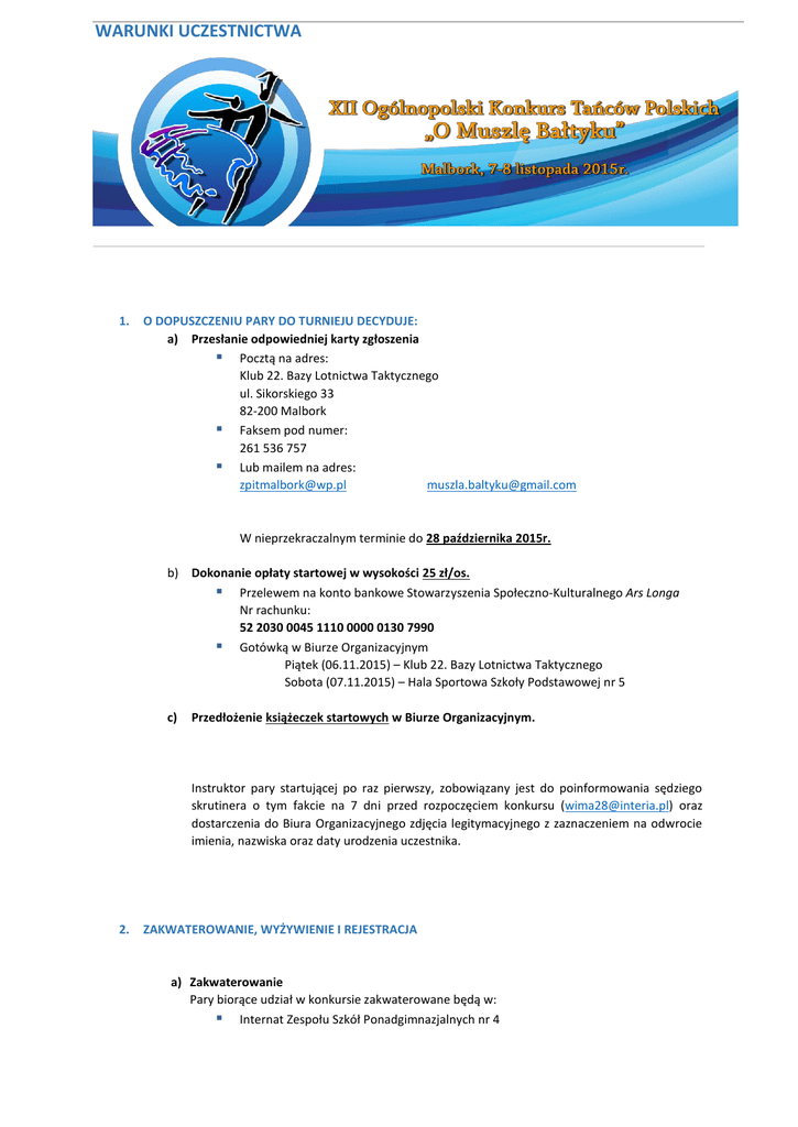WARUNKI UCZESTNICTWA 1. O DOPUSZCZENIU PARY DO TURNIEJU DECYDUJE: a) Przesłanie odpowiedniej karty zgłoszenia Pocztą na adres: Klub 22. Bazy Lotnictwa Taktycznego ul. Sikorskiego 33 82-200 Malbork Faksem pod numer: 261 536 757 Lub mailem na adres: [email protected] [email protected] W nieprzekraczalnym terminie do 28 października 2015r. b) Dokonanie opłaty startowej w wysokości 25 zł/os. Przelewem na konto bankowe Stowarzyszenia Społeczno-Kulturalnego Ars Longa Nr rachunku: 52 2030 0045 1110 0000 0130 7990 Gotówką w Biurze Organizacyjnym Piątek (06.11.2015) – Klub 22. Bazy Lotnictwa Taktycznego Sobota (07.11.2015) – Hala Sportowa Szkoły Podstawowej nr 5 c) Przedłożenie książeczek startowych w Biurze Organizacyjnym. Instruktor pary startującej po raz pierwszy, zobowiązany jest do poinformowania sędziego skrutinera o tym fakcie na 7 dni przed rozpoczęciem konkursu ([email protected]) oraz dostarczenia do Biura Organizacyjnego zdjęcia legitymacyjnego z zaznaczeniem na odwrocie imienia, nazwiska oraz daty urodzenia uczestnika. 2. ZAKWATEROWANIE, WYŻYWIENIE I REJESTRACJA a) Zakwaterowanie Pary biorące udział w konkursie zakwaterowane będą w: Internat Zespołu Szkół Ponadgimnazjalnych nr 4 ul. Mazurów 1, 82-200 Malbork Szkolne Schronisko Młodzieżowe ul. Żeromskiego 45, 82-200 Malbork Decyzję o przydziale grup do poszczególnych miejsc noclegowych podejmuje organizator biorąc pod uwagę kolejność zgłoszeń. Jednocześnie organizator zastrzega, że ilość miejsc jest ograniczona – decyduje kolejność zgłoszeń. b) c) Wyżywienie śniadania, obiady (Klub 22.BLT) i kolacje – Restauracja „Galeria Cafe”, ul. Sikorskiego 33 Rejestracja Piątek (06.11.2015): od godz. 17:00 – Klub 22. Bazy Lotnictwa Taktycznego ul. Sikorskiego 33 Sobota (07.11.2015): od godz. 8:00 – Hala Sportowa Szkoły Podstawowej nr 5 ul. Józefa Wybickiego 32 3. KOSZTY a) b) c) 4. INFORMACJE DODATKOWE a) 5. Opłata startowa – 25zł/os. Opłata akredytacyjna: Dla uczestników konkursu – 110zł/os. (obejmuje 2 noclegi, wyżywienie od kolacji w dniu 06.11 do obiadu 08.11) Dla osób towarzyszących – 135zł/os. (obejmuje 2 noclegi, wyżywienie od kolacji w dniu 06.11 do obiadu 08.11) Jeden instruktor z każdego zespołu zwolniony jest z wszelkich opłat. Uczestnicy przyjeżdżają na koszt własny i ubezpieczają się we własnym zakresie. DANE KONTAKTOWE Klub 22. Bazy Lotnictwa Taktycznego ul. Gen. Wł. Sikorskiego 33 82-200 Malbork Anetta Ciok Dyrektor Artystyczny tel. 501076337 [email protected] Dominika Grenda Dyrektor Organizacyjny tel. 502002297 [email protected] Po wysłaniu zgłoszenia prosimy o kontakt telefoniczny w celu potwierdzenia udziału.