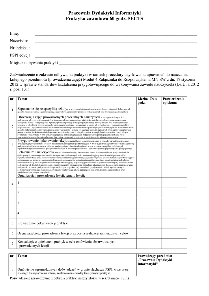 Pracownia Dydaktyki Informatyki Praktyka zawodowa 60 godz. 5ECTS Imię: _____________________________________________________________________________ Nazwisko: _____________________________________________________________________________ Nr indeksu: _____________________________________________________________________________ PSPI edycja: _____________________________________________________________________________ Miejsce odbywania praktyki __________________________________________________________________ Zaświadczenie o zakresie odbywania praktyki w ramach procedury uzyskiwania uprawnień do nauczania kolejnego przedmiotu (prowadzenia zajęć) Moduł 4 Załącznika do Rozporządzenia MNiSW z dn. 17 stycznia 2012 w sprawie standardów kształcenia przygotowującego do wykonywania zawodu nauczyciela (Dz.U. z 2012 r. poz. 131) nr Temat Liczba Data godz. Potwierdzenie opiekuna Zapoznanie się ze specyfiką szkoły, 1 w szczególności poznanie realizowanych przez nią zadań dydaktycznych, sposobu funkcjonowania, organizacji pracy pracowników, uczestników procesów pedagogicznych oraz prowadzonej dokumentacji. 2 , w szczególności czynności podejmowanych przez opiekuna praktyk w toku prowadzonych przez niego lekcji; toku metodycznego lekcji; stosowanych przez nauczyciela metod i form pracy oraz wykorzystywanych pomocy dydaktycznych; interakcji dorosły-dziecko oraz interakcji między uczniami w toku lekcji; procesu komunikowania interpersonalnego i społecznego w klasie, ich prawidłowości i zakłóceń; sposobów aktywizowania i dyscyplinowania uczniów oraz różnicowania poziomu aktywności poszczególnych uczniów; sposobu oceniania uczniów; sposobu zadawania i kontrolowania pracy domowej; dynamiki i klimatu społecznego klasy; ról pełnionych przez uczniów; zachowania i postaw uczniów; funkcjonowania i aktywności w czasie zajęć poszczególnych uczniów, z uwzględnieniem uczniów za specjalnymi potrzebami edukacyjnymi w tym uczniów szczególnie uzdolnionych; działań podejmowanych przez opiekuna praktyk na rzecz zapewnienia bezpieczeństwa i zachowania dyscypliny; organizacji przestrzeni w klasie i sposobu jej zagospodarowania; 3 , w szczególności organizowanie pracy w grupach; przygotowanie pomocy dydaktycznych; wykorzystanie środków multimedialnych i technologii informacyjnej w pracy dydaktycznej; kontroli i oceniania uczniów; podejmowanie działań na rzecz uczniów ze specjalnymi potrzebami edukacyjnymi, w tym uczniów szczególnie uzdolnionych; organizowanie przestrzeni klasy; podejmowanie działań w zakresie projektowania i udzielania pomocy psychologiczno-pedagogicznej; Obserwacja zajęć prowadzonych przez innych nauczycieli Przygotowanie i planowanie lekcji Pełnienie roli nauczyciela poprzez planowanie zajęć, formułowanie celów, dobór metod i form pracy oraz środków dydaktycznych; dostosowywanie metod i form pracy do realizowanych treści, etapu edukacyjnego oraz dynamiki grupy uczniów; wykorzystanie w toku lekcji środków multimedialnych i technologii informacyjnej; dostosowywanie sposobu komunikacji w toku zajęć do poziomu rozwoju uczniów; animowanie aktywności poznawczej i współdziałania uczniów; rozwijanie umiejętności samodzielnego zdobywania wiedzy z wykorzystaniem technologii informacyjnej; organizację pracy uczniów w grupach zadaniowych; dostosowywanie podejmowanych działań do możliwości i ograniczeń uczniów ze specjalnymi potrzebami edukacyjnymi; diagnozowanie poziomu wiedzy i umiejętności uczniów; podejmowanie indywidualnej pracy dydaktycznej z uczniami; podejmowanie działań wychowawczych; podejmowanie współpracy z innymi nauczycielami, wychowawcą szkoły, pedagogiem szkolnym, psychologiem szkolnym oraz specjalistami pracującymi z uczniami. Organizacja i prowadzenie lekcji, tematy lekcji: 4 1 2 3 4 5 Prowadzenie dokumentacji praktyki 6 Ocena przebiegu prowadzenia lekcji oraz ocena realizacji zamierzonych celów 7 Konsultacje z opiekunem praktyk w celu omówienia obserwowanych i prowadzonych lekcji nr 8 Temat Omówienie zgromadzonych doświadczeń w grupie słuchaczy PSPI, w tym ocena własnego funkcjonowania w toku, konfrontowanie wiedzy teoretycznej z praktyką Poświadczone sprawozdanie z odbycia praktyki należy złożyć w sekretariacie PSPI) Prowadzący przedmiot „Pracownia Dydaktyki Informatyki” Uwagi opiekuna praktyki: _________________________________________________________________________________________ _________________________________________________________________________________________ _________________________________________________________________________________________ _________________________________________________________________________________________ _________________________________________________________________________________________ _________________________________________________________________________________________ _________________________________________________________________________________________ _________________________________________________________________________________________ _________________________________________________________________________________________ _________________________________________________________________________________________ _________________________________________________________________________________________ _________________________________________________________________________________________ _________________________________________________________________________________________ _________________________________________________________________________________________ _________________________________________________________________________________________ _________________________________________________________________________________________ _________________________________________________________________________________________ _______________________________________________________________________________