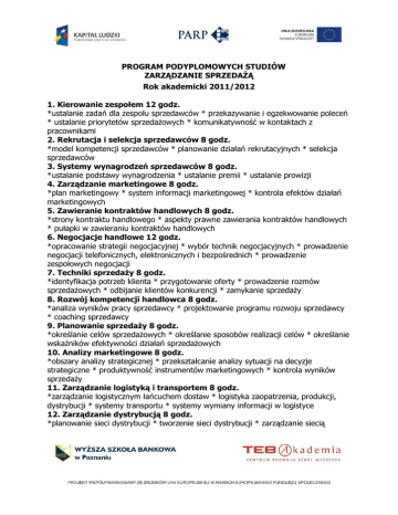 PROGRAM PODYPLOMOWYCH STUDIÓW ZARZĄDZANIE SPRZEDAŻĄ Rok akademicki 2011/2012 1. Kierowanie zespołem 12 godz. *ustalanie zadań dla zespołu sprzedawców * przekazywanie i egzekwowanie poleceń * ustalanie priorytetów sprzedażowych * komunikatywność w kontaktach z pracownikami 2. Rekrutacja i selekcja sprzedawców 8 godz. *model kompetencji sprzedawców * planowanie działań rekrutacyjnych * selekcja sprzedawców 3. Systemy wynagrodzeń sprzedawców 8 godz. *ustalanie podstawy wynagrodzenia * ustalanie premii * ustalanie prowizji 4. Zarządzanie marketingowe 8 godz. *plan marketingowy * system informacji marketingowej * kontrola efektów działań marketingowych 5. Zawieranie kontraktów handlowych 8 godz. *strony kontraktu handlowego * aspekty prawne zawierania kontraktów handlowych * pułapki w zawieraniu kontraktów handlowych 6. Negocjacje handlowe 12 godz. *opracowanie strategii negocjacyjnej * wybór technik negocjacyjnych * prowadzenie negocjacji telefonicznych, elektronicznych i bezpośrednich * prowadzenie zespołowych negocjacji 7. Techniki sprzedaży 8 godz. *identyfikacja potrzeb klienta * przygotowanie oferty * prowadzenie rozmów sprzedażowych * odbijanie klientów konkurencji * zamykanie sprzedaży 8. Rozwój kompetencji handlowca 8 godz. *analiza wyników pracy sprzedawcy * projektowanie programu rozwoju sprzedawcy * coaching sprzedawcy 9. Planowanie sprzedaży 8 godz. *określanie celów sprzedażowych * określanie sposobów realizacji celów * określanie wskaźników efektywności działań sprzedażowych 10. Analizy marketingowe 8 godz. *obszary analizy strategicznej * przekształcanie analizy sytuacji na decyzje strategiczne * produktywność instrumentów marketingowych * kontrola wyników sprzedaży 11. Zarządzanie logistyką i transportem 8 godz. *zarządzanie logistycznym łańcuchem dostaw * logistyka zaopatrzenia, produkcji, dystrybucji * systemy transportu * systemy wymiany informacji w logistyce 12. Zarządzanie dystrybucją 8 godz. *planowanie sieci dystrybucji * tworzenie sieci dystrybucji * zarządzanie siecią dystrybucji 13. Zarządzanie relacjami z klientem CRM 8 godz. *identyfikacja pożądanych relacji * projektowanie narzędzi budowania relacji z klientami * wykorzystanie technologii IT w zarządzaniu relacjami * analiza efektywności działań i rozwiązań CRM 14. Zarządzanie obsługą klienta 4 godz. *planowanie jakości obsługi klienta * zarządzanie procesem obsługi klienta * bieżące zarządzanie personelem obsługi klienta * analiza jakości obsługi klienta 15. Trening interpersonalny 12 godz. *komunikatywność w kontaktach biznesowych * wrażliwość ekonomiczna * elastyczność zachowań * współpraca zespołowa * kreatywność 16. Windykacja należności 8 godz. *dokumentacja wierzytelności handlowych * kontakt z dłużnikiem i negocjacje * postępowania sądowe 17. Badanie satysfakcji klienta 8 godz. *określanie przedmiotu badań * analiza procesu obsługi klienta * projektowanie narzędzi badawczych * analiza wyników * prezentacja wyników na spotkaniach * określanie inicjatyw w zakresie poprawy klienta 18. Motywowanie i ocena sprzedawców 8 godz. *przygotowanie do rozmowy oceniającej * wyciąganie wniosków z rozmowy oceniającej * styl kierowania jako narzędzie motywacji * pozamaterialne narzędzia motywacji sprzedawców 19. Kalkulacja kosztów 8 godz. 20. Gra biznesowa PROMAR 16 godz. 21. Aspekty międzykulturowe w handlu 8 godz. *komunikacja międzykulturowa * prowadzenie biznesu w środowisku międzynarodowym * etykieta w kontaktach międzykulturowych. 22. Seminarium podyplomowe 4 godz. Liczba godzin 188, 13 zjazdów