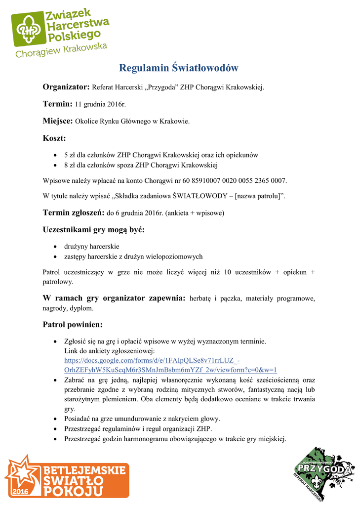 a Regulamin Światłowodów Organizator: Referat Harcerski „Przygoda” ZHP Chorągwi Krakowskiej. Termin: 11 grudnia 2016r. Miejsce: Okolice Rynku Głównego w Krakowie. Koszt: 5 zł dla członków ZHP Chorągwi Krakowskiej oraz ich opiekunów 8 zł dla członków spoza ZHP Chorągwi Krakowskiej Wpisowe należy wpłacać na konto Chorągwi nr 60 85910007 0020 0055 2365 0007. W tytule należy wpisać „Składka zadaniowa ŚWIATŁOWODY – [nazwa patrolu]”. Termin zgłoszeń: do 6 grudnia 2016r. (ankieta + wpisowe) Uczestnikami gry mogą być: drużyny harcerskie zastępy harcerskie z drużyn wielopoziomowych Patrol uczestniczący w grze nie może liczyć więcej niż 10 uczestników + opiekun + patrolowy. W ramach gry organizator zapewnia: herbatę i pączka, materiały programowe, nagrody, dyplom. Patrol powinien: Zgłosić się na grę i opłacić wpisowe w wyżej wyznaczonym terminie. Link do ankiety zgłoszeniowej: https://docs.google.com/forms/d/e/1FAIpQLSe8v71rrLUZ_OrhZEFyhW5KuSeqM6r3SMnJmBsbm6mYZf_2w/viewform?c=0&w=1 Zabrać na grę jedną, najlepiej własnoręcznie wykonaną kość sześciościenną oraz przebranie zgodne z wybraną rodziną mitycznych stworów, fantastyczną nacją lub starożytnym plemieniem. Oba elementy będą dodatkowo oceniane w trakcie trwania gry. Posiadać na grze umundurowanie z nakryciem głowy. Przestrzegać regulaminów i reguł organizacji ZHP. Przestrzegać godzin harmonogramu obowiązującego w trakcie gry miejskiej. Uwaga! Rezygnacja z gry możliwa jest do 6 grudnia 2016r. Po tym terminie wpisowe nie podlega zwrotowi. Brak wpłaty wpisowego do 6 grudnia 2016r. skutkuje dyskwalifikacją patrolu. W razie braku wystarczającej ilości zgłoszeń organizatorzy zastrzegają sobie prawo do odwołania gry miejskiej. Ostateczna interpretacja regulaminu należy do organizatora gry miejskiej. Kontakt: phm. Marlena Maliszewska – 506 794 778 [email protected]