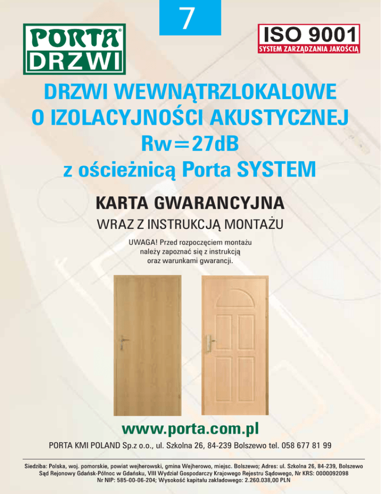 7 DRZWI WEWNĄTRZLOKALOWE O IZOLACYJNOŚCI AKUSTYCZNEJ Rw=27dB z ościeżnicą Porta SYSTEM KARTA GWARANCYJNA WRAZ Z INSTRUKCJĄ MONTAŻU UWAGA! Przed rozpoczęciem montażu należy zapoznać się z instrukcją oraz warunkami gwarancji. www.porta.com.pl PORTA KMI POLAND Sp.z o.o., ul. Szkolna 26, 84-239 Bolszewo tel. 058 677 81 99 Siedziba: Polska, woj. pomorskie, powiat wejherowski, gmina Wejherowo, miejsc. Bolszewo; Adres: ul. Szkolna 26, 84-239, Bolszewo Sąd Rejonowy Gdańsk-Północ w Gdańsku, VIII Wydział Gospodarczy Krajowego Rejestru Sądowego, Nr KRS: 0000092098 Nr NIP: 585-00-06-204; Wysokość kapitału zakładowego: 2.260.038,00 PLN WARUNKI GWARANCJI 1. Porta KMI System jako Gwarant udziela gwarancji na swoje produkty na terenie RP pod warunkiem, że zostaną one zamontowane zgodnie z zamieszczoną w niniejszej karcie instrukcją montażu oraz będą użytkowane zgodnie z ich przeznaczeniem. W wykonywaniu obowiązków gwarancyjnych pośredniczą na podstawie umów dealerskich przedstawiciele fabryki - Dealerzy Porta KMI Poland 2. Okres gwarancji na wyroby firmy Porta KMI Poland wynosi: – 12 miesięcy na wyroby standardowe, – 24 miesiące na wyroby antywłamaniowe, – 24 miesiące na drzwi zewnętrzne drewniane, – 10 lat na konstrukcję drzwi Enduro, – 10 lat na perforację blachy w drzwich wewnętrznych metalowych i ościeżnicach metalowych. Okres gwarancji ulega wydłużeniu o następne 12 miesięcy w przypadku montażu zakupionych produktów przez Autoryzowane Grupy Montażowe (posiadające aktualną autoryzację), a fakt ten zostanie potwierdzony przystawieniem odpowiedniej pieczęci w niniejszej karcie. 3. Okres gwarancji liczony jest od daty sprzedaży uwidocznionej na dowodzie zakupu (fakturze). 4. Warunkiem świadczenia usług gwarancyjnych jest przedłożenie przez Kupującego w punkcie sprzedaży karty gwarancyjnej wraz z dowodem zakupu i faktury za montaż (dotyczy wydłużonej gwarancji). Karta gwarancyjna załączona jest do produktu. Obowiązkiem Kupującego jest odebranie karty gwarancyjnej od Sprzedawcy lub Autoryzowanego Montażysty. Wszelkie adnotacje i zapisy w karcie gwarancyjnej mogą być dokonywane wyłącznie przez Gwaranta, upoważniony do tego punkt sprzedaży lub Autoryzowanego Montażystę. Dział reklamacji znajduje się w Porta KMI Poland, 84-239 Bolszewo, ul. Szkolna 26, tel. 58 677 81 00 5. Gwarant zobowiązuje się do rozpatrzenia i załatwienia reklamacji w możliwie najkrótszym terminie. 6. Zwłoka w załatwieniu reklamacji nie zachodzi, gdy oględzin, wymiany lub naprawy nie dokonano z przyczyn leżących po stronie Kupującego. 7. Jeżeli charakter wad nie wymaga ich usuwania w warunkach fabrycznych, naprawę gwarancyjną wykonuje się u Kupującego. 8. W okresie gwarancji (patrz punkt 2) producent zobowiązuje się do nieodpłatnej naprawy wadliwego wyrobu. 9. Oceny charakteru wady i sposobu załatwienia reklamacji dokonuje przedstawiciel Sprzedającego lub Gwaranta. 10. Warunkiem rozpatrzenia reklamacji dotyczącej widocznej usterki jakości jest zgłoszenie jej przed montażem z jednoczesnym odstąpieniem od czynności montażowych. Zainstalowanie akcesoriów traktowane jest jako rozpoczęcie montażu wyrobu. Towar należy zwrócić w oryginalnym opakowaniu. 11. Gwarancja wygasa w przypadku: – – – – – dokonania jakichkolwiek przeróbek w skrzydle lub ościeżnicy, naruszenia konstrukcji wyrobu, zdjęcia tabliczki znamionowej z wyrobów certyfikowanych, zniszczenia lub zagubienia karty gwarancyjnej, dokonania wpisu w karcie gwarancyjnej przez osobę nieupoważnioną. 12. Gwarancją nie są objęte: – mechaniczne uszkodzenia oraz wady zewnętrzne powstałe na skutek nieprzestrzegania prawidłowych zasad w trakcie transportu, składowania i przechowywania wyrobów, – przebarwienia i odkształcenia, uszkodzenia elementów i podzespołów powstałe na skutek pęcznienia materiału, spowodowanych nadmierną wilgotnością powietrza w pomieszczeniach (drzwi powinny być osadzone po wykonaniu tzw. prac mokrych: np. po położeniu tynków, posadzek, w pomieszczeniach suchych i przewiewnych), – przebarwienia, sęki, zawoje włókien, różnice kolorystyczne oraz wyciągnięcia struktury drewna, wynikające z niepowtarzalnej specyfiki naturalnych oklein, – wady powstałe na skutek nieprawidłowego zabezpieczenia wyrobu na czas robót budowlanych (np. zabrudzenia zaprawą, tynkiem lub pianką; czyszczenia gruboziarnistymi środkami czyszczącymi lub agresywnymi środkami chemicznymi), – producent nie odpowiada za uszkodzenia powłoki lakierniczej i laminowanej powstałe w wyniku oklejenia wyrobu taśmami samoprzylepnymi, – wady powstałe na skutek niewłaściwego użytkowania lub niedbałości Kupującego, – montaż wyrobu, – wadliwe działanie wyrobu będące skutkiem zdarzeń losowych, niezależnych od producenta i warunków eksploatacji (powódź, pożar, włamanie itp.), – naturalne zużycia eksploatacyjne wyrobu, – braki ilościowe elementów i akcesoriów widocznych przy odbiorze, – powierzchnie malowane proszkowo w wykonaniu podkładowym, – powierzchnie lakierowane proszkowo w wykonaniu ostatecznym, gdy zostały one przemalowane samodzielnie przez Kupującego, – reklamacjami nie są objęte czynności związane: z pielęgnacją, konserwacją wyrobu oraz regulacjami akcesoriów. 13. Gwarancja na sprzedany towar nie wyłącza, nie ogranicza ani nie zawiesza uprawnień kupującego wynikających z niezgodności towaru z umową. 2 DRZWI O IZOLACYJNOŚCI AKUSTYCZNEJ Rw=27dB Z OŚCIEŻNICĄ PORTA SYSTEM WYKAZ ELEMENTÓW I AKCESORIÓW (rys.1) Tabliczka znamionowa (por. rys.1, element d) winna zawierać: 1. Logo firmy. 2. Numer AT i CZ. 3. Numer zgodny z numerem seryjnym. 1. Ościeżnica (pakowana osobno) ............... .........................1 szt. a – winieta identyfikacyjna ( na opakowaniu) 2. Skrzydło ..................................................... ......................1 szt. b – zame