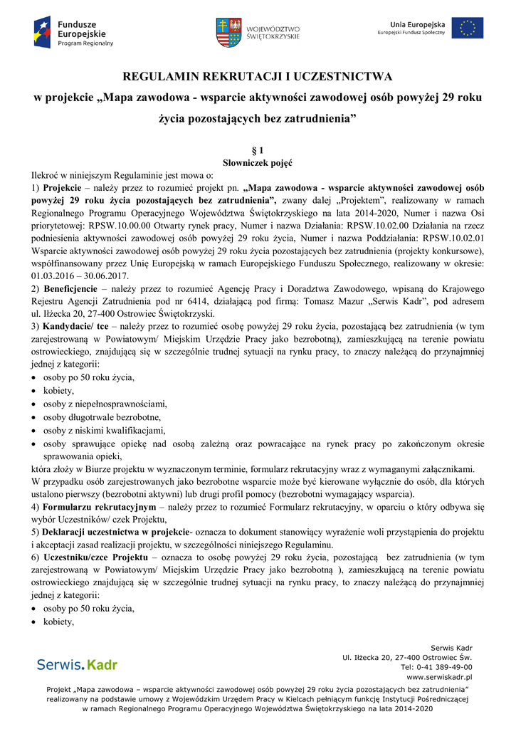 REGULAMIN REKRUTACJI I UCZESTNICTWA w projekcie „Mapa zawodowa - wsparcie aktywności zawodowej osób powyżej 29 roku życia pozostających bez zatrudnienia” §1 Słowniczek pojęć Ilekroć w niniejszym Regulaminie jest mowa o: 1) Projekcie – należy przez to rozumieć projekt pn. „Mapa zawodowa - wsparcie aktywności zawodowej osób powyżej 29 roku życia pozostających bez zatrudnienia”, zwany dalej „Projektem”, realizowany w ramach Regionalnego Programu Operacyjnego Województwa Świętokrzyskiego na lata 2014-2020, Numer i nazwa Osi priorytetowej: RPSW.10.00.00 Otwarty rynek pracy, Numer i nazwa Działania: RPSW.10.02.00 Działania na rzecz podniesienia aktywności zawodowej osób powyżej 29 roku życia, Numer i nazwa Poddziałania: RPSW.10.02.01 Wsparcie aktywności zawodowej osób powyżej 29 roku życia pozostających bez zatrudnienia (projekty konkursowe), współfinansowany przez Unię Europejską w ramach Europejskiego Funduszu Społecznego, realizowany w okresie: 01.03.2016 – 30.06.2017. 2) Beneficjencie – należy przez to rozumieć Agencję Pracy i Doradztwa Zawodowego, wpisaną do Krajowego Rejestru Agencji Zatrudnienia pod nr 6414, działającą pod firmą: Tomasz Mazur „Serwis Kadr”, pod adresem ul. Iłżecka 20, 27-400 Ostrowiec Świętokrzyski. 3) Kandydacie/ tce – należy przez to rozumieć osobę powyżej 29 roku życia, pozostającą bez zatrudnienia (w tym zarejestrowaną w Powiatowym/ Miejskim Urzędzie Pracy jako bezrobotną), zamieszkującą na terenie powiatu ostrowieckiego, znajdującą się w szczególnie trudnej sytuacji na rynku pracy, to znaczy należącą do przynajmniej jednej z kategorii: osoby po 50 roku życia, kobiety, osoby z niepełnosprawnościami, osoby długotrwale bezrobotne, osoby z niskimi kwalifikacjami, osoby sprawujące opiekę nad osobą zależną oraz powracające na rynek pracy po zakończonym okresie sprawowania opieki, która złoży w Biurze projektu w wyznaczonym terminie, formularz rekrutacyjny wraz z wymaganymi załącznikami. W przypadku osób zarejestrowanych jako bezrobotne wsparcie może być kierowane wyłącznie do osób, dla których ustalono pierwszy (bezrobotni aktywni) lub drugi profil pomocy (bezrobotni wymagający wsparcia). 4) Formularzu rekrutacyjnym – należy przez to rozumieć Formularz rekrutacyjny, w oparciu o który odbywa się wybór Uczestników/ czek Projektu, 5) Deklaracji uczestnictwa w projekcie- oznacza to dokument stanowiący wyrażenie woli przystąpienia do projektu i akceptacji zasad realizacji projektu, w szczególności niniejszego Regulaminu. 6) Uczestniku/czce Projektu – oznacza to osobę powyżej 29 roku życia, pozostającą bez zatrudnienia (w tym zarejestrowaną w Powiatowym/ Miejskim Urzędzie Pracy jako bezrobotną ), zamieszkującą na terenie powiatu ostrowieckiego znajdującą się w szczególnie trudnej sytuacji na rynku pracy, to znaczy należącą do przynajmniej jednej z kategorii: osoby po 50 roku życia, kobiety, Serwis Kadr Ul. Iłżecka 20, 27-400 Ostrowiec Św. Tel: 0-41 389-49-00 www.serwiskadr.pl Projekt „Mapa zawodowa – wsparcie aktywności zawodowej osób powyżej 29 roku życia pozostających bez zatrudnienia” realizowany na podstawie umowy z Wojewódzkim Urzędem Pracy w Kielcach pełniącym funkcję Instytucji Pośredniczącej w ramach Regionalnego Programu Operacyjnego Województwa Świętokrzyskiego na lata 2014-2020 osoby z niepełnosprawnościami, osoby długotrwale bezrobotne, osoby z niskimi kwalifikacjami, osoby sprawujące opiekę nad osobą zależną oraz powracające na rynek pracy po zakończonym okresie sprawowania opieki, która złożyła w Biurze projektu w wyznaczonym terminie, formularz rekrutacyjny wraz z wymaganymi załącznikami i została zakwalifikowana do udziału w projekcie, zgodnie z zasadami określonymi w niniejszym Regulaminie. 7) Biurze Projektu – oznacza to siedzibę beneficjenta - biuro firmy Tomasz Mazur ”Serwis Kadr”, ul. Iłżecka 20, 27-400 Ostrowiec Św. 8) Instytucji Pośredniczącej – oznacza to Wojewódzki Urząd Pracy w Kielcach. 9) Grupie docelowej – oznacza to grupę, do której projekt jest skierowany, zgodnie z wnioskiem o dofinansowanie projektu. 10) Bezrobotnym / Osobie bezrobotnej – należy przez to rozumieć osoby pozostające bez pracy, gotowe do podjęcia pracy i aktywnie poszukujące zatrudnienia. Definicja uwzględnia osoby zarejestrowane jako bezrobotne zgodnie z krajowymi przepisami, nawet jeżeli nie spełniają one wszystkich trzech kryteriów. Osobami bezrobotnymi są zarówno osoby bezrobotne w rozumieniu badania aktywności ekonomicznej ludności, jak i osoby zarejestrowane jako bezrobotne. Definicja nie uwzględnia studentów studiów stacjonarnych, nawet jeśli spełniają powyższe kryteria. Osoby kwalifikujące się do urlopu macierzyńskiego lub rodzicielskiego, które są bezrobotne w rozumieniu niniejszej definicji (nie pobierają świadczeń z tytułu urlopu), są również osobami bezrobotnymi w rozumieniu Wytycznych. 11) Długotrwale bezrobotnym - definicja pojęcia „długotrwale bezrobotny" różni się w zależności od wieku: • młodzież (<25 lat) – osoby bezrobotne nieprzerwanie przez okres ponad 6 miesięcy (> 6 miesięcy), • dorośli (25 lat lub więcej) – osoby bezrobotne nieprzerwanie przez okres ponad 12 miesięcy (> 12 miesięcy). Wiek uczestników projektu jest określany na podstawie daty urodzenia i ustalany w dniu rozpoczęcia udziału w projekcie. 12) Osobie biernej zawodowo - oznacza to osoby, które w danej chwili nie tworzą zasobów siły roboczej (tzn. nie pracują i nie są bezrobotne). Studenci studiów stacjonarnych są uznawani za osoby bierne zawodowo. Osoby będące na urlopie wychowawczym (rozumianym jako nieobecność w pracy, spowodowana opieką nad dzieckiem w okresie, który nie mieści się w ramach urlopu macierzyńskiego lub urlopu rodzicielskiego), są uznawane za bierne zawodowo, chyba że są zarejestrowane ju