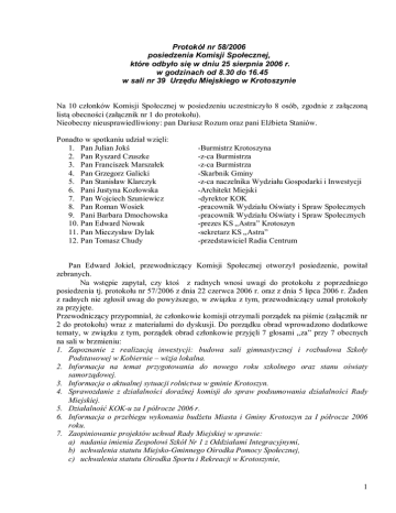 Protokół nr 58/2006 posiedzenia Komisji Społecznej, które odbyło się w dniu 25 sierpnia 2006 r. w godzinach od 8.30 do 16.45 w sali nr 39 Urzędu Miejskiego w Krotoszynie Na 10 członków Komisji Społecznej w posiedzeniu uczestniczyło 8 osób, zgodnie z załączoną listą obecności (załącznik nr 1 do protokołu). Nieobecny nieusprawiedliwiony: pan Dariusz Rozum oraz pani Elżbieta Staniów. Ponadto w spotkaniu udział wzięli: 1. Pan Julian Jokś 2. Pan Ryszard Czuszke 3. Pan Franciszek Marszałek 4. Pan Grzegorz Galicki 5. Pan Stanisław Klarczyk 6. Pani Justyna Kozłowska 7. Pan Wojciech Szuniewicz 8. Pan Roman Wosiek 9. Pani Barbara Dmochowska 10. Pan Edward Nowak 11. Pan Mieczysław Dylak 12. Pan Tomasz Chudy -Burmistrz Krotoszyna -z-ca Burmistrza -z-ca Burmistrza -Skarbnik Gminy -z-ca naczelnika Wydziału Gospodarki i Inwestycji -Architekt Miejski -dyrektor KOK -pracownik Wydziału Oświaty i Spraw Społecznych -pracownik Wydziału Oświaty i Spraw Społecznych -prezes KS „Astra” Krotoszyn -sekretarz KS „Astra” -przedstawiciel Radia Centrum Pan Edward Jokiel, przewodniczący Komisji Społecznej otworzył posiedzenie, powitał zebranych. Na wstępie zapytał, czy ktoś z radnych wnosi uwagi do protokołu z poprzedniego posiedzenia tj. protokołu nr 57/2006 z dnia 22 czerwca 2006 r. oraz z dnia 5 lipca 2006 r. Żaden z radnych nie zgłosił uwag do powyższego, w związku z tym, przewodniczący uznał protokoły za przyjęte. Przewodniczący przypomniał, że członkowie komisji otrzymali porządek na piśmie (załącznik nr 2 do protokołu) wraz z materiałami do dyskusji. Do porządku obrad wprowadzono dodatkowe tematy, w związku z tym, porządek obrad członkowie przyjęli 7 głosami „za” przy 7 obecnych na sali w brzmieniu: 1. Zapoznanie z realizacją inwestycji: budowa sali gimnastycznej i rozbudowa Szkoły Podstawowej w Kobiernie – wizja lokalna. 2. Informacja na temat przygotowania do nowego roku szkolnego oraz stanu oświaty samorządowej. 3. Informacja o aktualnej sytuacji rolnictwa w gminie Krotoszyn. 4. Sprawozdanie z działalności doraźnej komisji do spraw podsumowania działalności Rady Miejskiej. 5. Działalność KOK-u za I półrocze 2006 r. 6. Informacja o przebiegu wykonania budżetu Miasta i Gminy Krotoszyn za I półrocze 2006 roku. 7. Zaopiniowanie projektów uchwał Rady Miejskiej w sprawie: a) nadania imienia Zespołowi Szkół Nr 1 z Oddziałami Integracyjnymi, b) uchwalenia statutu Miejsko-Gminnego Ośrodka Pomocy Społecznej, c) uchwalenia statutu Ośrodka Sportu i Rekreacji w Krotoszynie, 1 d) uchwalenia statutu Zakładu Obsługi Placówek Oświatowych w Krotoszynie, e) przyjęcia Rocznego Programu Współpracy Miasta i Gminy Krotoszyn z organizacjami pozarządowymi na rok 2007, f) zmian w budżecie na 2006 rok, g) zaciągnięcia zobowiązań w zakresie współpracy z organizacjami pozarządowymi w 2007 roku, h) przystąpienia do sporządzenia miejscowego planu zagospodarowania przestrzennego miasta Krotoszyna w rejonie ulic Ostrowskiej i Chwaliszewskiej, i) utworzenia odrębnych obwodów głosowania na obszarze Miasta i Gminy Krotoszyn w wyborach samorządowych w 2006 r. j) przeznaczenia części umorzonych pożyczek z Wojewódzkiego Funduszu Ochrony Środowiska i Gospodarki Wodnej w Poznaniu, k) zaciągnięcia zobowiązań o wartości przekraczającej granicę ustaloną w uchwale budżetowej na 2006 rok na zadaniu „Modernizacja regionalnego układu transportowego poprzez przebudowę ciągu dróg powiatowych i gminnych w Krotoszynie z włączeniem do dróg krajowych nr 15 i 36” – część I i II, l) zmiany uchwały Nr XL/329/2005 z dnia 30.12.2005 r. w sprawie zmiany uchwały Nr XXXVIII/309/2005 w sprawie zaciągnięcia zobowiązań o wartości przekraczającej granicę ustaloną w uchwale budżetowej na 2005 rok, m) zaciągnięcia zobowiązań o wartości przekraczającej granicę ustaloną w uchwale budżetowej na 2006 rok na zadaniu „Budowa Zakładu Utylizacji Odpadów Komunalnych”. 8. Opinia Gminnej Rady Sportu w sprawie dofinansowania KS Astra. 9. Zapytania do informacji o pracy Burmistrza Krotoszyna w okresie międzysesyjnym. 10. Wolne głosy. Przystąpiono do realizacji poszczególnych tematów. Punkt 1 Zapoznanie się z realizacją inwestycji: budowa sali gimnastycznej i rozbudowa Szkoły Podstawowej w Kobiernie – wizja lokalna . Po zapoznaniu się z realizacją inwestycji: budowa sali gimnastycznej i rozbudowa Szkoły Podstawowej w Kobiernie Komisja Społeczna sformułowała i przyjęła dwa wnioski: 1) W związku ze stanem zaawansowania prac remontowo-budowlanych w Szkole Podstawowej w Kobiernie i potrzebą rozszerzenia zakresu robót oraz dotrzymaniem terminu zakończenia prac w przewidywanym czasie tj. do połowy października br. Komisja Społeczna wnioskuje o zwiększenie środków finansowych na 2006 r. w kwocie ok. 800 tys. zł poprzez przesunięcie środków z 2007 r. zaplanowanych w WPI. Wniosek przyjęto 7 głosami „za” przy 7 obecnych. 2) Komisja Społeczna wnioskuje by budynek sali gimnastycznej w Szkole Podstawowej w Kobiernie był wykonany w stanie surowym zamkniętym przed okresem zimy 2006/2007. Wniosek przyjęto 7 głosami „za” przy 7 obecnych. Po dokonaniu wizji lokalnej Komisja Społeczna stwierdza, iż realizacja zadania inwestycyjnego w Szkole Podstawowej w Kobiernie przebiega prawidłowo i według oświadczeń inwestora, wykonawcy oraz inspektora nadzoru zadanie to powinno być wykonane w przewidywanym terminie. 2 Punkt 2 Informacja na temat przygotowania do nowego roku szkolnego oraz stanu oświaty samorządowej. Materiał członkowie komisji otrzymali – załącznik nr 3 do protokołu. Omówienia tematu dokonał pan Ryszard Czuszke Pan Grzegorz Nowacki zwrócił uwagę, że mimo iż pływanie jest najwszechstronniejszą dyscypliną korygującą wady postawy, to efektywność zajęć na basenie jest niska. Dlatego powinno przywiązywać się więcej uwagi do ilości dzieci or