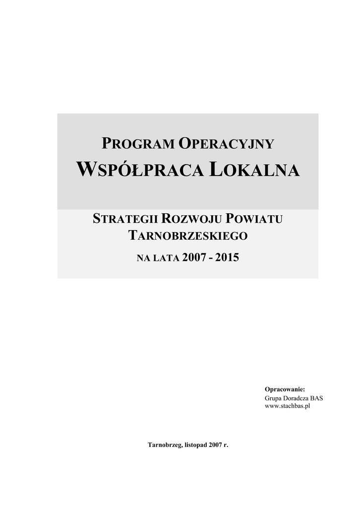 PROGRAM OPERACYJNY WSPÓŁPRACA LOKALNA STRATEGII ROZWOJU POWIATU TARNOBRZESKIEGO NA LATA 2007 - 2015 Opracowanie: Grupa Doradcza BAS www.stachbas.pl Tarnobrzeg, listopad 2007 r. Program Operacyjny Współpraca lokalna Spis treści Słownik uŜywanych skrótów i pojęć.......................................................................................... 3 Struktura dokumentu ................................................................................................................ 4 Obszary problemowe i cele strategiczne Strategii Rozwoju Powiatu....................................... 5 Drzewo Celów Strategii Rozwoju Powiatu Tarnobrzeskiego ................................................... 6 Drzewo Celów Programu Operacyjnego Współpraca Lokalna ............................................... 8 Karty zadań / projektów PO Współpraca Lokalna ................................................................... 8 Zewnętrzne źródła finansowania projektów ........................................................................... 31 Informacja o dostępnych środkach finansowych ................................................................... 33 Kilka zasad zdobywania funduszy........................................................................................... 37 2 Strategia Rozwoju Powiatu Tarnobrzeskiego, 2007-2015 Program Operacyjny Współpraca lokalna Słownik uŜywanych skrótów i pojęć 3 Skrót Pełna nazwa ARFP Akademia Rozwoju Filantropii w Polsce Beneficjant osoba korzystająca z pomocy innych Biznes plan plan przedsięwzięcia gospodarczego Cel dąŜenie lub zadanie operacyjne Działanie czynność, która przybliŜa nas do realizacji zadania EFOiGR Europejski Fundusz Orientacji i Gwarancji Rolnej EFRR Europejski Fundusz Rozwoju Regionalnego EFS Europejski Fundusz Społeczny Ewaluacja zmiana wynikająca z analizy i oceny efektów osiągniętych względem zaplanowanych FS Fundusz Spójności Kamień milowy Działanie, które ma kluczowe znaczenie dla osiągnięcia celu Koordynator zarządzający działaniem Misja charakterystyczna dla organizacji metoda działania Monitoring śledzenie przebiegu osiągania celów MPiPS Ministerstwo Pracy i Polityki Społecznej MŚP małe i średnie przedsiębiorstwa (zatrudniające do 250 osób) NGOs organizacja pozarządowa, społeczna (z ang. non government organizations) PARP Polska Agencja Rozwoju Przedsiębiorczości Phare, SAPARD, ISPA programy przedakcesyjne UE, przygotowujące Polskę do członkostwa w UE Planowanie działania instytucji, które określają cele i metody ich realizacji PO IiŚ Program Operacyjny Infrastruktura i Środowisko PO KL Program Operacyjny Kapitał Ludzki PO RPW Program Operacyjny Rozwój Polski Wschodniej Program ogół naszych działań w organizacji Program pomocowy fundusz wspierający zmiany Programy przedakcesyjne programy pomocowe UE w okresie przed wstąpieniem do UE Programy Wspólnotowe programy finansowane i zarządzane bezpośrednio przez Komisję Europejską Projekt działanie, z mierzalnym celem, terminem realizacji i odpowiedzialnością PUP /WUP Powiatowy Urząd Pracy / Wojewódzki Urząd Pracy RPO Regionalny Program Operacyjny Sesja strategiczna spotkanie konwentu planowania strategicznego, określającej kierunki rozwoju Skuteczność stopień realizacji planowanych celów Sponsor osoba fizyczna lub instytucja dotująca nasze działania Sprawność stopień osiągania celów jak najmniejszym kosztem Strategia metoda realizacji celów Studium uwarunkowań analiza oddziaływania i wykonalności projektu SWOT analiza wewnętrznych i zewnętrznych uwarunkowań Taktyka zawczasu podjęte decyzje, które „wyprzedzają” rzeczywistość UE Unia Europejska Wizja zapisany obraz tego jak organizacja chce wyglądać w przyszłości Wniosek aplikacyjny projekt opisany w wymagalnej przez program pomocowy formie Zadanie działanie (dąŜenie) zawierające na poziomie planu kierunek oddziaływania Zarządzanie kierowanie zasobami w taki sposób aby osiągać cele organizacji Strategia Rozwoju Powiatu Tarnobrzeskiego, 2007-2015 Program Operacyjny Współpraca lokalna Struktura dokumentu Niniejszy dokument „Plan Operacyjny - Współpraca Lokalna” jest jednym z sześciu Programów Operacyjnych wchodzących skład „Strategii Rozwoju Powiatu Tarnobrzeskiego 2007 – 2015”. Prezentuje on zadania i projekty, które powinny być podjęte aby osiągnąć cele operacyjnie strategiczne zawarte w dokumencie „Plan Strategiczny”. KaŜdy z planów operacyjnych zbudowany jest według następującego schematu: • Drzewo Celów Strategii Rozwoju Powiatu Tarnobrzeskiego • Drzewo Celów Programu Operacyjnego • Karty zadań / projektów Ponadto zamieszczono informacje dotyczące moŜliwości finansowania projektów ze środków programów pomocowych. KaŜda z kart zadania / projektu zawiera następujące informacje: • (xyz) Nazwa zadania; krótki hasłowy tytuł, jednoznacznie wyróŜniający zadanie / projekt, poprzedzony numerem identyfikującym zadanie / projekt w określonym celu operacyjnym i strategicznym • Uzasadnienie; odniesienie się do potrzeby wdraŜania zadania / projektu • Odpowiedzialność; jaka instytucja powiatowa jest odpowiedzialna za wdraŜanie zadania / projektu (ew. za inicjowanie działań na rzecz wdraŜania zadania / projektu) • Sojusznicy / partnerzy; jaka instytucja lokalna moŜe wspierać (być partnerem) we wdraŜaniu zadania • Sposób realizacji; 3-6 podstawowych etapów w uruchamianiu zadania / projektu • Harmonogram; termin uruchamiania zadanie / projektu i orientacyjny czas wdraŜania • BudŜet; szacunkowy koszt wdroŜenia zadania (na etapie uruchamiania wymaga uszczegółowienia) • Źródła finansowania; główne źródła pozabudŜetowego finansowania zadania / projektu Numeracja zadania realizacyjnego jest trzycyfrowa i symbolizuje: x - numer obszaru strategicznego y - numer celu operacyjnego dla danego obszaru strategicznego z