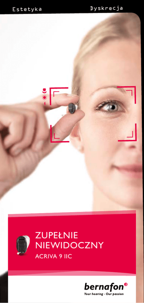 Estetyka Dyskrecja ZUPEŁNIE NIEWIDOCZNY ACRIVA 9 IIC Najmniejszy aparat słuchowy Aparat słuchowcy Acriva 9 IIC (invisible-inthe-canal; ”niewidoczny całkowicie wewnątrzkanałowy“) jest tak mały i tak głęboko osadzony w kanale słuchowym, że pozostaje zupełnie niezauważalny. Bardzo dyskretny model IIC jest perfekcyjne dopasowany do kształtu kanału słuchowego Użytkownika i dzięki temu gwarantuje najwyższy komfort i całkowitą dyskrecję. W związku z umiejscowieniem aparatu, rejestruje on naturalny dźwięk dokładnie tak, jak robią to nasze uszy. Bernafon Acriva IIC jest najmniejszym i najbardziej dyskretnym aparatem słuchowym. Głośno ++ Znaczne szumy tła Zauważ swoje potrzeby Acriva IIC oferuje najdoskonalszą technologię przetwarzania dźwięku, która gwarantuje: ··Maksymalną zrozumiałość mowy, nawet w trudnych warunkach dźwiękowych ··Najwyższą jakość i naturalność dźwięku oraz jego odpowiednią głośność ··Skuteczne tłumienie dźwięków niepożądanych ··Efektywną eliminację sprzężeń akustycznych Ponadto model IIC jest: ··Niezwykle wygodny w użytkowaniu ··Łatwy do założenia i wyciągnięcia z ucha ··Całkowicie automatyczny Z Acriva IIC doświadczysz całkowicie naturalnego odbioru dźwięku oraz najwyższej zrozumiałości mowy. Jednocześnie nikt z Twojego otoczenia nie zauważy, iż nosisz aparat słuchowy. Bernafon ACRIVA IIC Najbardziej zaawansowana technologia Aparat słuchowy Bernafon Acriva 9 IIC jest ”produktem“ niezwykle zaawansowanej i precyzyjnej szwajcarskiej inżynierii. Acriva 9 IIC oferuje technologię przetwarzania dźwięku Audio Efficiency™ 2.0 stworzoną dla poprawy zrozumienia mowy i komfortu Użytkownika, jak i dla dopasowania aparatu do indywidualnych oczekiwań Klienta. Jeśli szukasz najlepszych i najdyskretniejszych rozwiązań, całkowicie niewidoczny aparat wewnątrzkanałowy Bernafon będzie dla Ciebie zdecydowanie najlepszym rozwiązaniem. Aby dowiedzieć się więcej, skontaktuj się z Protetykiem Słuchu. Więcej informacji nt. słyszenia oraz ubytków słuchu znajduje się na www.bernafon.com Bernafon Companies: Australia ∙ Canada ∙ China ∙ Denmark ∙ Finland ∙ France ∙ Germany ∙ Italy ∙ Japan ∙ Korea ∙ Netherlands ∙ New Zealand ∙ Poland ∙ Spain ∙ Sweden ∙ Switzerland ∙ UK ∙ USA 04.13/BAG/PL/subject to change Bezproblemowe słyszenie oraz zrozumienie mowy są podstawowymi potrzebami człowieka. Ubytek słuchu utrudnia komunikowanie się z innymi, stanowiąc jednocześnie istotny problem społeczny. Jesteśmy przekonani, że najnowsza technologia umożliwia osobom z niedosłuchem powrót do normalnego słyszenia.