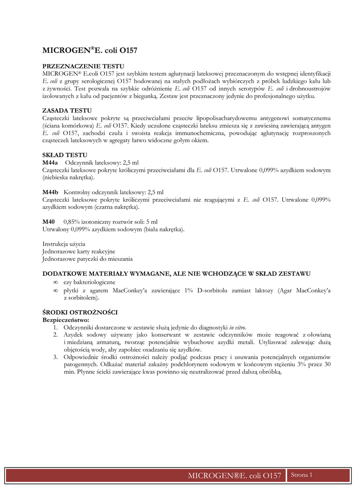 MICROGEN®E. coli O157 PRZEZNACZENIE TESTU MICROGEN® E.coli O157 jest szybkim testem aglutynacji lateksowej przeznaczonym do wstępnej identyfikacji E. coli z grupy serologicznej O157 hodowanej na stałych podłoŜach wybiórczych z próbek ludzkiego kału lub z Ŝywności. Test pozwala na szybkie odróŜnienie E. coli O157 od innych serotypów E. coli i drobnoustrojów izolowanych z kału od pacjentów z biegunką. Zestaw jest przeznaczony jedynie do profesjonalnego uŜytku. ZASADA TESTU Cząsteczki lateksowe pokryte są przeciwciałami przeciw lipopolisacharydowemu antygenowi somatycznemu (ściana komórkowa) E. coli O157. Kiedy uczulone cząsteczki lateksu zmiesza się z zawiesiną zawierającą antygen E. coli O157, zachodzi czuła i swoista reakcja immunochemiczna, powodując aglutynację rozproszonych cząsteczek lateksowych w agregaty łatwo widoczne gołym okiem. SKŁAD TESTU M44a Odczynnik lateksowy: 2,5 ml Cząsteczki lateksowe pokryte króliczymi przeciwciałami dla E. coli O157. Utrwalone 0,099% azydkiem sodowym (niebieska nakrętka). M44b Kontrolny odczynnik lateksowy: 2,5 ml Cząsteczki lateksowe pokryte króliczymi przeciwciałami nie reagującymi z E. coli O157. Utrwalone 0,099% azydkiem sodowym (czarna nakrętka). M40 0,85% izotoniczny roztwór soli: 5 ml Utrwalony 0,099% azydkiem sodowym (biała nakrętka). Instrukcja uŜycia Jednorazowe karty reakcyjne Jednorazowe patyczki do mieszania DODATKOWE MATERIAŁY WYMAGANE, ALE NIE WCHODZĄCE W SKŁAD ZESTAWU • ezy bakteriologiczne • płytki z agarem MacConkey’a zawierające 1% D-sorbitolu zamiast laktozy (Agar MacConkey’a z sorbitolem). ŚRODKI OSTROśNOŚCI Bezpieczeństwo: 1. Odczynniki dostarczone w zestawie słuŜą jedynie do diagnostyki in vitro. 2. Azydek sodowy uŜywany jako konserwant w zestawie odczynników moŜe reagować z ołowianą i miedzianą armaturą, tworząc potencjalnie wybuchowe azydki metali. Utylizować zalewając duŜą objętością wody, aby zapobiec osadzaniu się azydków. 3. Odpowiednie środki ostroŜności naleŜy podjąć podczas pracy i usuwania potencjalnych organizmów patogennych. OdkaŜać materiał zakaźny podchlorynem sodowym w końcowym stęŜeniu 3% przez 30 min. Płynne ścieki zawierające kwas powinno się neutralizować przed dalszą obróbką. MICROGEN®E. coli O157 Strona 1 Środki proceduralne: 1. MICROGEN® E.coli O157 powinien być uŜywany zgodnie z dołączoną instrukcją. 2. Pozwolić wszystkim odczynnikom na osiągnięcie temperatury pokojowej przed uŜyciem. 3. Nie rozcieńczać Ŝadnego odczynnika z zestawu. 4. Nie mieszać odczynników z róŜnych partii i zestawów. 5. Nie zamraŜać Ŝadnych odczynników. 6. UwaŜać, Ŝeby zakraplacz z odczynnikiem lateksowym nie dotknął próbek bakteryjnych. 7. Przed uŜyciem upewnić się, Ŝe karta reakcyjna jest czysta i sucha. 8. Upewnić się, Ŝe odpowiednią uwagę poświęcono rozdziałowi „Kontrola jakości”. 9. Zachować ostroŜność podczas zapisywania wyników aglutynacji. Reakcje, które są zbyt silne lub „włókniste” mogą nie być prawdziwą aglutynacją. PRZECHOWYWANIE I TERMIN WAśNOŚCI MICROGEN® E.coli O157 powinien być przechowywany w temp. 2 - 8°C, kiedy nie jest uŜywany. Zestawu nie naleŜy uŜywać po upływie daty waŜności wydrukowanej na naklejce na kartonie. PRÓBKI Materiały od pacjentów (kał z domieszką krwi) powinno się posiać na Agar MacConkey’a z sorbitolem (zawierający 1% D-sorbitolu zamiast laktozy). Inkubować tlenowo przez 18 - 24 godz. w 35 - 37°C. Potencjalnie toksyczne szczepy E. coli O157:H7 rosną jako bezbarwne kolonie (nie fermentujące sorbitolu), morfologicznie inne od innych szczepów E. coli. Trzeba pamiętać, Ŝe inne bakterie mogą rosnąć na tym podłoŜu i dawać kolonie o podobnym wyglądzie do E. coli O157, np. E. hermanii, P. stuartii (zob. ograniczenia uŜycia). SPOSÓB WYKONANIA Kontrola jakości: Aby potwierdzić, Ŝe odczynniki działają prawidłowo, naleŜy za kaŜdym razem, kiedy uŜywa się zestaw, wykonać następujące sprawdziany: 1. Odczynnik kontrolny Dodać 1 kroplę lateksu testowego MICROGEN® E.coli O157 (M44a) i 1 kroplę lateksu kontrolnego (M44b) do 2 oddzielnych pól na karcie testowej. Dodać 1 kroplę soli fizjologicznej (M40) do kaŜdej kropli lateksu i wymieszać kaŜdą zawiesinę lateksu z solą oddzielnie, rozprowadzając płyn na całej wewnętrznej powierzchni zaznaczonego pola. Obracać kartę delikatnie przez 30 sekund i obserwować, czy wystąpi aglutynacja na obu polach. JeŜeli aglutynacja wystąpi, albo lateks, albo sól fizjologiczna daje niespecyficzną aglutynację i powinno się ten odczynnik wyrzucić. 2. Kontrola dodatnia Przygotować jednolitą zawiesinę znanego szczepu E. coli O157 na 2 polach karty testowej (zob. Sposób wykonania testu poniŜej). Obracać delikatnie kartę przez 30 sekund i obserwować, czy wystąpi aglutynacja. JeŜeli nie ma aglutynacji na Ŝadnym polu, dodać 1 kroplę lateksu testowego MICROGEN® E.coli O157 (M44a) na jedno pole i jedna kroplę lateksu kontrolnego (M44b) na drugie. Obracać kartę delikatnie przez 2 minuty i obserwować, czy zachodzi aglutynacja. Na polu zawierającym lateks testowy powinna zajść wyraźna aglutynacja, podczas gdy na polu zawierającym lateks kontrolny nie powinna zajść aglutynacja. JeŜeli nie zaszły takie reakcje, odczynniki mogą być nieaktywne lub zanieczyszczone i powinno się je wyrzucić. Sposób wykonania testu: 1. Nanieść po 1 kropli (30 µl) soli fizjologicznej (M40) na dwa pola na czystej, suchej karcie reakcyjnej. 2. Przy pomocy ezy pobrać kilka podejrzanych kolonii E. coli z płytki agarowej MacConkey z sorbitolem. Wybierać tylko kolonie bezbarwne, których morfologia przypomina morfologię E. coli. 3. Zawiesić kolonie w dwóch kroplach soli na karcie reakcyjnej, aby otrzymać gęstą, jednorodną zawiesinę. Rozprowadzić zawiesinę wewnątrz powierzchni pola testowego. 4. Obracać delikatnie kartę przez 30 sekund