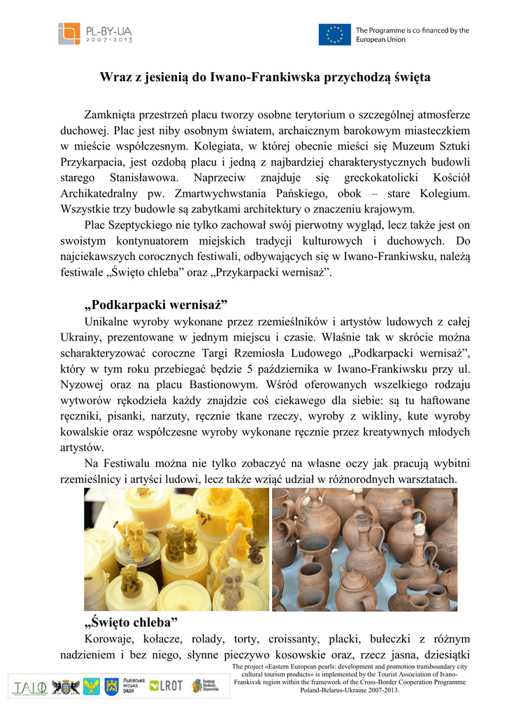 Wraz z jesienią do Iwano-Frankiwska przychodzą święta Zamknięta przestrzeń placu tworzy osobne terytorium o szczególnej atmosferze duchowej. Plac jest niby osobnym światem, archaicznym barokowym miasteczkiem w mieście współczesnym. Kolegiata, w której obecnie mieści się Muzeum Sztuki Przykarpacia, jest ozdobą placu i jedną z najbardziej charakterystycznych budowli starego Stanisławowa. Naprzeciw znajduje się greckokatolicki Kościół Archikatedralny pw. Zmartwychwstania Pańskiego, obok – stare Kolegium. Wszystkie trzy budowle są zabytkami architektury o znaczeniu krajowym. Plac Szeptyckiego nie tylko zachował swój pierwotny wygląd, lecz także jest on swoistym kontynuatorem miejskich tradycji kulturowych i duchowych. Do najciekawszych corocznych festiwali, odbywających się w Iwano-Frankiwsku, należą festiwale „Święto chleba” oraz „Przykarpacki wernisaż”. „Podkarpacki wernisaż” Unikalne wyroby wykonane przez rzemieślników i artystów ludowych z całej Ukrainy, prezentowane w jednym miejscu i czasie. Właśnie tak w skrócie można scharakteryzować coroczne Targi Rzemiosła Ludowego „Podkarpacki wernisaż”, który w tym roku przebiegać będzie 5 października w Iwano-Frankiwsku przy ul. Nyzowej oraz na placu Bastionowym. Wśród oferowanych wszelkiego rodzaju wytworów rękodzieła każdy znajdzie coś ciekawego dla siebie: są tu haftowane ręczniki, pisanki, narzuty, ręcznie tkane rzeczy, wyroby z wikliny, kute wyroby kowalskie oraz współczesne wyroby wykonane ręcznie przez kreatywnych młodych artystów. Na Festiwalu można nie tylko zobaczyć na własne oczy jak pracują wybitni rzemieślnicy i artyści ludowi, lecz także wziąć udział w różnorodnych warsztatach. „Święto chleba” Korowaje, kołacze, rolady, torty, croissanty, placki, bułeczki z różnym nadzieniem i bez niego, słynne pieczywo kosowskie oraz, rzecz jasna, dziesiątki The project «Eastern European pearls: development and promotion transboundary city cultural tourism products» is implemented by the Tourist Association of IvanoFrankivsk region within the framework of the Cross-Border Cooperation Programme Poland-Belarus-Ukraine 2007-2013. rodzajów pysznego chleba – nie jest to pełna lista smakołyków z ciasta, które można będzie skosztować lub kupić podczas „Święta chleba”. Zapraszamy do odwiedzenia miejscowego festiwalu, który odbędzie się w dniu 5 października i poświęcony zostanie ukończeniu żniw i prac polowych. Oprócz wystaw różnorodnych towarów i produktów program Festiwalu przewiduje również przedstawienia teatralne, koncerty, unikatowe warsztaty dla dzieci i dorosłych, częstowanie kozackimi daniami etc. Wypieki można będzie nie tylko skosztować lub kupić, lecz także nauczyć się robić je samemu. Należy zaznaczyć, że chleb i pozostałe wypieki na Festiwalu chleba zrobione są tylko i wyłącznie z naturalnych składników. W święcie będą brali udział lokalne przedsiębiorstwa i przedsiębiorcy – piekarze i cukiernicy. Każdy z uczestników będzie miał stoisko, przystosowane do prezentacji i degustacji wyrobów. Artykuł napisany w ramach projektu «Perły Europy Wschodniej: rozwój i promocja produktów turystyki kulturowej miast transgranicznych”, który jest współfinansowany przez Unię Europejską w ramach Programu Współpracy Transgranicznej Polska - Białoruś - Ukraina 2007-2013. The project «Eastern European pearls: development and promotion transboundary city cultural tourism products» is implemented by the Tourist Association of IvanoFrankivsk region within the framework of the Cross-Border Cooperation Programme Poland-Belarus-Ukraine 2007-2013.