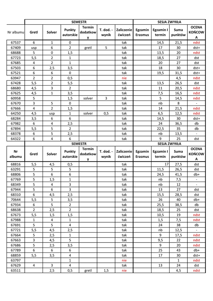 Nr albumu Gretl Solver 67537 67409 68688 67723 67685 67503 67521 63947 67428 68680 67625 60958 67670 67666 64250 68284 67982 67894 68378 64322 6 usp 5 5,5 4 6 6 2 5,5 4,5 4,5 5 3 4 4,5 3,5 6 5,5 6 6 1 6 0 2 2 2,5 6 2 2 3 1 5 2 usp 6 4 5 5 4 Nr albumu Gretl Solver 5,5 5 5 5 5 5 6 5,5 6 2 5,5 1 5 5,5 5 3 5 6 5,5 4,5 5 6 1,5 4 6 4,5 5 5 2,5 1,5 4 5 4,5 2,5 4,5 2,5 6 3,5 4 3 2,5 68816 63291 68806 67769 68349 67944 68310 70644 67934 68638 67673 67988 67691 67721 67664 67663 67686 67789 68859 63797 67629 63511 SEMESTR SESJA ZWYKŁA Termin OCENA Punkty T. dod. - Zaliczenie Egzamin Egzamin I Suma dodatkow KOŃCOW autorskie wynik ćwiczeń Erasmus termin punktów y A 0 tak 14,5 21,5 ndst 2 gretl 5 tak 17 30 dst+ 1,5 tak 13,5 20 ndst 1 tak 18,5 27 dst 1 tak 20 27 dst 3,5 tak 18 30 dst+ 0 tak 19,5 31,5 dst+ 0,5 nie 4,5 ndst 5,5 tak 13,5 26,5 dst 2 tak 11 20,5 ndst 3,5 tak 7,5 16,5 ndst 1,5 solver 3 tak 5 14,5 ndst 0 tak nb 8 ndst 1,5 tak 14 21,5 1 solver 0,5 tak 6,5 12,5 ndst 6 tak 14,5 30 dst+ 2,5 tak 24 36,5 db 2 tak 22,5 35 db 2,5 tak nb 13,5 6 tak 9 25 dst SEMESTR SESJA ZWYKŁA Termin OCENA Punkty T. dod. - Zaliczenie Egzamin Egzamin I Suma dodatkow KOŃCOW autorskie wynik ćwiczeń Erasmus termin punktów y A 17 27,5 dst 0,5 tak 5 tak 11,5 26,5 dst 6 tak 24,5 41,5 db+ 1 tak nb 7,5 3 tak nb 12 3 tak 13 27 dst 2,5 tak 15,5 28,5 dst 3,5 tak 26 40 db+ 2 tak 25,5 38,5 db 2 tak 18,5 25 dst 1,5 tak 10,5 19 ndst 1 tak 1,5 7,5 ndst 4 tak 24 38 db 2,5 tak nb 12,5 1 tak 9 17,5 ndst 5 tak 9,5 22 ndst 3,5 tak 9 20 ndst 6 tak 25 43 db+ 4 tak 17 30 dst+ 1 nie 1 ndst 4 tak 13 24 dst 0,5 gretl 1,5 nie 4,5 ndst