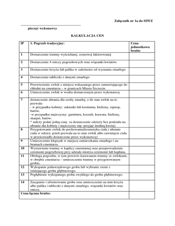 Załącznik nr 1a do SIWZ …………………………………………… pieczęć wykonawcy KALKULACJA CEN lP 1. Pogrzeb tradycyjny: 1 Dostarczenie trumny wyściełanej, sosnowej lakierowanej 2 Dostarczenie 4 zniczy pogrzebowych oraz wiązanki kwiatów. 3 Dostarczenie krzyża lub palika w zależności od wyznania zmarłego 4 Dostarczenie tabliczki z danymi zmarłego 5 Przewiezienie zwłok z miejsca wskazanego przez zamawiającego do chłodni na cmentarzu – w granicach Miasta Szczecin. Umieszczenie zwłok w worku dostarczonym przez wykonawcę 6 7 8 9 10 11 12 13 14 dostarczenie ubrania dla osoby zmarłej, o ile stan zwłok na to pozwala: - w przypadku kobiety: sukienki lub kostiumu, bielizny, rajstop, butów, -w przypadku mężczyzny: garnituru, koszuli, krawata, bielizny, skarpet, butów. * należy podać jedną cenę za dostarczenie odzieży bez podziału na ubranie dla kobiety i mężczyzny (np. przyjąć średnią kwotę) Przygotowanie zwłok do pochowania(kosmetyka ciała i ubranie ciała w odzież, jeżeli pozwala na to stan zwłok albo zawinięcie ciała w prześcieradło dostarczone przez wykonawcę) Umieszczenie klepsydr w miejscu zamieszkania zmarłego i na bramach cmentarza. Wystawienie trumny w kaplicy cmentarnej oraz przeprowadzenie ceremonii pogrzebowej przy udziale mistrza ceremonii lub kapłana. Obsługa pogrzebu, w tym przewóz karawanem trumny ze zwłokami, w obrębie cmentarza – umieszczenie trumny w przygotowanym grobie. Wykopanie jednorzędowego grobu lub wybranie ziemi z istniejącego grobu głębinowego. Pogłębienie wykopanego grobu zwykłego do grobu głębinowego. Zasypanie i uformowanie grobu oraz umieszczenie na nim krzyża albo palika i tabliczki z danymi zmarłego, wiązanki kwiatów oraz zniczy. Cena łączna brutto: Cena jednostkowa brutto Lp Pogrzeb przy wykorzystaniu kremacji zwłok 1 Dostarczenie trumny kremacyjnej drewnianej lub drewnopodobnej 2 Dostarczenie urny na prochy. 3 Dostarczenie 4 zniczy pogrzebowych oraz wiązanki kwiatów. 4 Dostarczenie krzyża lub palika w zależności od wyznania zmarłego. 5 Dostarczenie tabliczki z danymi zmarłego. 6 Przewiezienie zwłok z miejsca wskazanego przez zamawiającego do chłodni na cmentarzu – w granicach Miasta Szczecin. Umieszczenie zwłok w worku dostarczonym przez wykonawcę. 7 Cena jednostkowa brutto 8 dostarczenie ubrania dla osoby zmarłej, o ile stan zwłok na to pozwala: - w przypadku kobiety: sukienki lub kostiumu, bielizny, rajstop, butów, -w przypadku mężczyzny: garnituru, koszuli, krawata, bielizny, skarpet, butów. *należy podać jedną cenę za dostarczenie odzieży bez podziału na ubranie dla kobiety i mężczyzny (np. przyjąć średnią kwotę) 9 Przygotowanie zwłok do kremacji (kosmetyka ciała i ubranie ciała w odzież, jeżeli pozwala na to stan zwłok albo zawiniecie ciała w prześcieradło dostarczone przez wykonawcę) 10 Umieszczenie klepsydr w miejscu zamieszkania zmarłego i na bramach cmentarza. 11 Wystawienie urny z prochami w kaplicy cmentarnej oraz przeprowadzenie ceremonii pogrzebowej przy udziale mistrza ceremonii lub kapłana 12 Obsługa pogrzebu, w tym przewóz karawanem urny ze zwłokami, w obrębie cmentarza – umieszczenie urny w grobie urnowym lub innym miejscu przechowywania urn z prochami. 13 Wykopanie, zasypanie i uformowanie grobu urnowego oraz umieszczenie na nim krzyża albo palika i tabliczki z danymi zmarłego, wiązanki kwiatów oraz zniczy. Cena łączna brutto: …………………………………………2008r. ………………………………………… Podpis wykonawcy ……………………………. Podpis wykonawcy * * jeżeli wymagana jest reprezentacja łączna