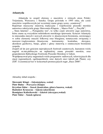 Atlantyda Atlantyda to zespół złożony z muzyków z różnych stron Polski: Trójmiasta, Warszawy i Sanoka. Grupa powstała w 1995 roku, ale cześć muzyków współtworzyła już wcześniej znane grupy sceny „szantowej”. Repertuar muzyczny stanowią tradycyjne i współczesne piosenki morskie autorstwa założyciela grupy Sławomira Klupsia. „ Marco Polo”, „ Pacyfik”, „ Stara latarnia”, „ Pożegnalny ton”, to tylko część utworów jego autorstwa, które znane są wszystkim miłośnikom morskiego śpiewania. Koncert Atlantydy to mieszanka starych i nowych utworów w akustycznym brzmieniu, zawierający w sobie elementy muzyki folkowej oraz bluegrasu, tematycznie związanej z morzem i żeglowaniem. Akustyczne instrumenty: kontrabas, skrzypce, akordeon guzikowy, banjo, gitara i głosy stanowią o ostatecznym brzmieniu zespołu. Zespół od lat jest gościem największych festiwali szantowych, laureatem wielu nagród m.inn.plebiscytu na najbardziej znane piosenki morskie, oraz gospodarzem Bałtyckiego Festiwalu Piosenki Morskiej w Gdyni. Współpracował przy nagraniach wielu programów radiowych, telewizyjnych dla stacji regionalnych, ogólnopolskich, oraz dużych sieci takich jak Planet, czy ZDF. Uczestniczył też w koncertach promocyjnych regat „Race 2000”. Aktualny skład zespołu : Sławomir Klupś – Gdynia(gitara, wokal) Piotr Bułas – Warszawa (banjo) Krystian Sidor – Sanok (kontrabas, gitara basowa, wokal) Radosław Kruszyna – Gdynia (akordeon) Remigiusz Kaliszkowski – Gdańsk (skrzypce,wokal) Piotr Sidor – Sanok (gitara)