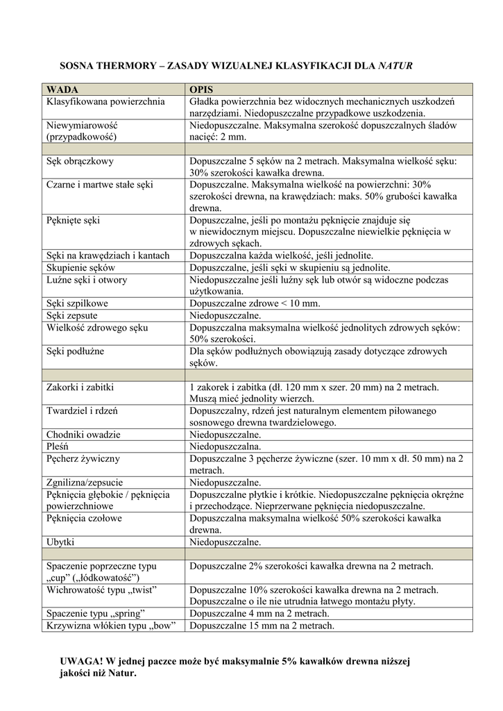 SOSNA THERMORY – ZASADY WIZUALNEJ KLASYFIKACJI DLA NATUR WADA Klasyfikowana powierzchnia Niewymiarowość (przypadkowość) Sęk obrączkowy Czarne i martwe stałe sęki Pęknięte sęki Sęki na krawędziach i kantach Skupienie sęków Luźne sęki i otwory Sęki szpilkowe Sęki zepsute Wielkość zdrowego sęku Sęki podłużne Zakorki i zabitki Twardziel i rdzeń Chodniki owadzie Pleśń Pęcherz żywiczny Zgnilizna/zepsucie Pęknięcia głębokie / pęknięcia powierzchniowe Pęknięcia czołowe Ubytki Spaczenie poprzeczne typu „cup” („łódkowatość”) Wichrowatość typu „twist” Spaczenie typu „spring” Krzywizna włókien typu „bow” OPIS Gładka powierzchnia bez widocznych mechanicznych uszkodzeń narzędziami. Niedopuszczalne przypadkowe uszkodzenia. Niedopuszczalne. Maksymalna szerokość dopuszczalnych śladów nacięć: 2 mm. Dopuszczalne 5 sęków na 2 metrach. Maksymalna wielkość sęku: 30% szerokości kawałka drewna. Dopuszczalne. Maksymalna wielkość na powierzchni: 30% szerokości drewna, na krawędziach: maks. 50% grubości kawałka drewna. Dopuszczalne, jeśli po montażu pęknięcie znajduje się w niewidocznym miejscu. Dopuszczalne niewielkie pęknięcia w zdrowych sękach. Dopuszczalna każda wielkość, jeśli jednolite. Dopuszczalne, jeśli sęki w skupieniu są jednolite. Niedopuszczalne jeśli luźny sęk lub otwór są widoczne podczas użytkowania. Dopuszczalne zdrowe < 10 mm. Niedopuszczalne. Dopuszczalna maksymalna wielkość jednolitych zdrowych sęków: 50% szerokości. Dla sęków podłużnych obowiązują zasady dotyczące zdrowych sęków. 1 zakorek i zabitka (dł. 120 mm x szer. 20 mm) na 2 metrach. Muszą mieć jednolity wierzch. Dopuszczalny, rdzeń jest naturalnym elementem piłowanego sosnowego drewna twardzielowego. Niedopuszczalne. Niedopuszczalna. Dopuszczalne 3 pęcherze żywiczne (szer. 10 mm x dł. 50 mm) na 2 metrach. Niedopuszczalne. Dopuszczalne płytkie i krótkie. Niedopuszczalne pęknięcia okrężne i przechodzące. Nieprzerwane pęknięcia niedopuszczalne. Dopuszczalna maksymalna wielkość 50% szerokości kawałka drewna. Niedopuszczalne. Dopuszczalne 2% szerokości kawałka drewna na 2 metrach. Dopuszczalne 10% szerokości kawałka drewna na 2 metrach. Dopuszczalne o ile nie utrudnia łatwego montażu płyty. Dopuszczalne 4 mm na 2 metrach. Dopuszczalne 15 mm na 2 metrach. UWAGA! W jednej paczce może być maksymalnie 5% kawałków drewna niższej jakości niż Natur.