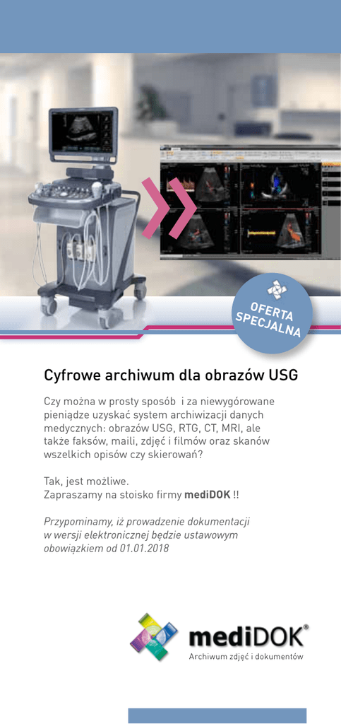 » Of specerta jaln a Cyfrowe archiwum dla obrazów USG Czy można w prosty sposób i za niewygórowane pieniądze uzyskać system archiwizacji danych medycznych: obrazów USG, RTG, CT, MRI, ale także faksów, maili, zdjęć i filmów oraz skanów wszelkich opisów czy skierowań? Tak, jest możliwe. Zapraszamy na stoisko firmy mediDOK !! Przypominamy, iż prowadzenie dokumentacji w wersji elektronicznej będzie ustawowym obowiązkiem od 01.01.2018 Archiwum zdjęć i dokumentów OFERTA SPECJALNA – Ginekologia i położnictw Podczas konferencji w Krakowie oferujemy Państwu 2 pakiety Ta oferta jest ograniczona czasowo, aby z niej skorzystać należ DICOM USG-Pakiet 1* » Podłączenie 1 aparatu USG z opcją DICOM » Import obrazów z płytki CD pacjenta » tworzenie płytki CD dla pacjentów Pakiet dla 2 użytkowników (jednocześnie) Cena końcowa, wraz z zawartą usługą serwisową (hotline, update, możliwość zdalnego dostępu do komputerów użytkownika) w pierwszym roku użytkowania: 14.990 PLN Usługa serwisowa (od 2. roku użytkowania): 2.750 PLN rocznie » Pakiet dla 5 użytkowników (jednocześnie) Cena końcowa, wraz z zawartą usługą serwisową (hotline, update, możliwość zdalnego dostępu do komputerów użytkownika) w pierwszym roku użytkowania: 18.790 PLN Usługa serwisowa (od 2. roku użytkowania): 3.450 PLN rocznie » * Oferta nie zawiera kosztów instalacji, zależnej od ilości stanowisk czy ilości podłączanych urządzeń USG lub innych oraz kosztów dojazdu Oferta specjalna dla uczestników konferencji wo 2016 , XIII Krajowa Konferencja Szkoleniowa y naszego oprogramowania w specjalnych cenach. ży złożyć zamówienie do końca 2016. DICOM USG-Pakiet 2* » Podłączenie 2 aparatów USG z opcją DICOM » Import obrazów z płytki CD pacjenta » tworzenie płytki CD dla pacjentów Pakiet dla 2 użytkowników (jednocześnie) Cena końcowa, wraz z zawartą usługą serwisową (hotline, update, możliwość zdalnego dostępu do komputerów użytkownika) w pierwszym roku użytkowania: 18.390 PLN Usługa serwisowa (od 2. roku użytkowania): 3.375 PLN rocznie » Pakiet dla 5 użytkowników (jednocześnie) Cena końcowa, wraz z zawartą usługą serwisową (hotline, update, możliwość zdalnego dostępu do komputerów użytkownika) w pierwszym roku użytkowania: 20.890 PLN Usługa serwisowa (od 2. roku użytkowania): 3.850 PLN rocznie » * Wszystkie podane ceny są cenami netto (+ podatek VAT w wysokości 8 %) ® Oprogramowanie mediDOK zostało wybrane przez ponad 11.000 użytkowników w Niemczech. Właściwości: » Wyrób medyczny klasy IIa » Obrazy i dokumenty są szyfrowane i kompresowane, są zapisywane lokalnie u użytkownika » Możliwość podłączenia każdego urządzenia medycznego (USG, RTG, MRI, Endoskop etc.) » Możliwość oglądania obrazów na monitorze diagnostycznym i jednoczesny opis badania na drugim ekranie » Możliwość eksportu obrazów dla celów np. teleradiologii » Pracuje pod Windows » Dowolna ilość licencji, niezależna od stanowisk pracy („licencja pływająca”) » Dowolna ilość użytkowników o różnych uprawnieniach » Obsługuje DICOM (Worklist & zapisywanie obrazów) mediDOK Software Entwicklungsgesellschaft mbH Handschuhsheimer Landstraße 11 69221 Dossenheim, Niemcy Biuro w Polsce: Pomologiczna 2A 04-859 Warszawa Osoba kontaktowa: Grzegorz Liszczyk Tel. Komórkowy: 501-790239 www.medidok.com.pl ⋅ e-mail: [email protected] FA (3/01) 0,0(poln.).11.16 Ofer ta dla u specjalna czes konfe tników renc ji